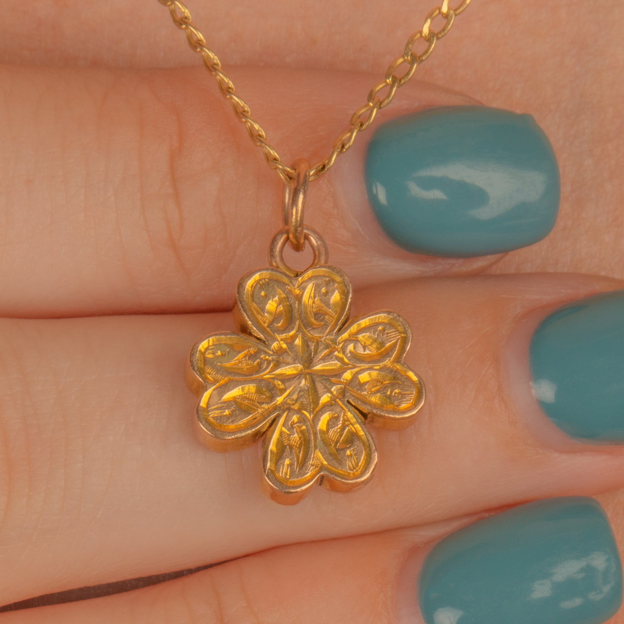 EXCELLENT This Victorian 9ct Gold Engraved Four Leaf Clover Charm is excellent condition. Her engravings have aged well over the years, keeping her intricate designs crisp and clear. Similarly her 9ct Gold has a wonderfully rich hue and a glossy finish. All in all, a lovely Victorian treasure to bring you a lifetime of luck!