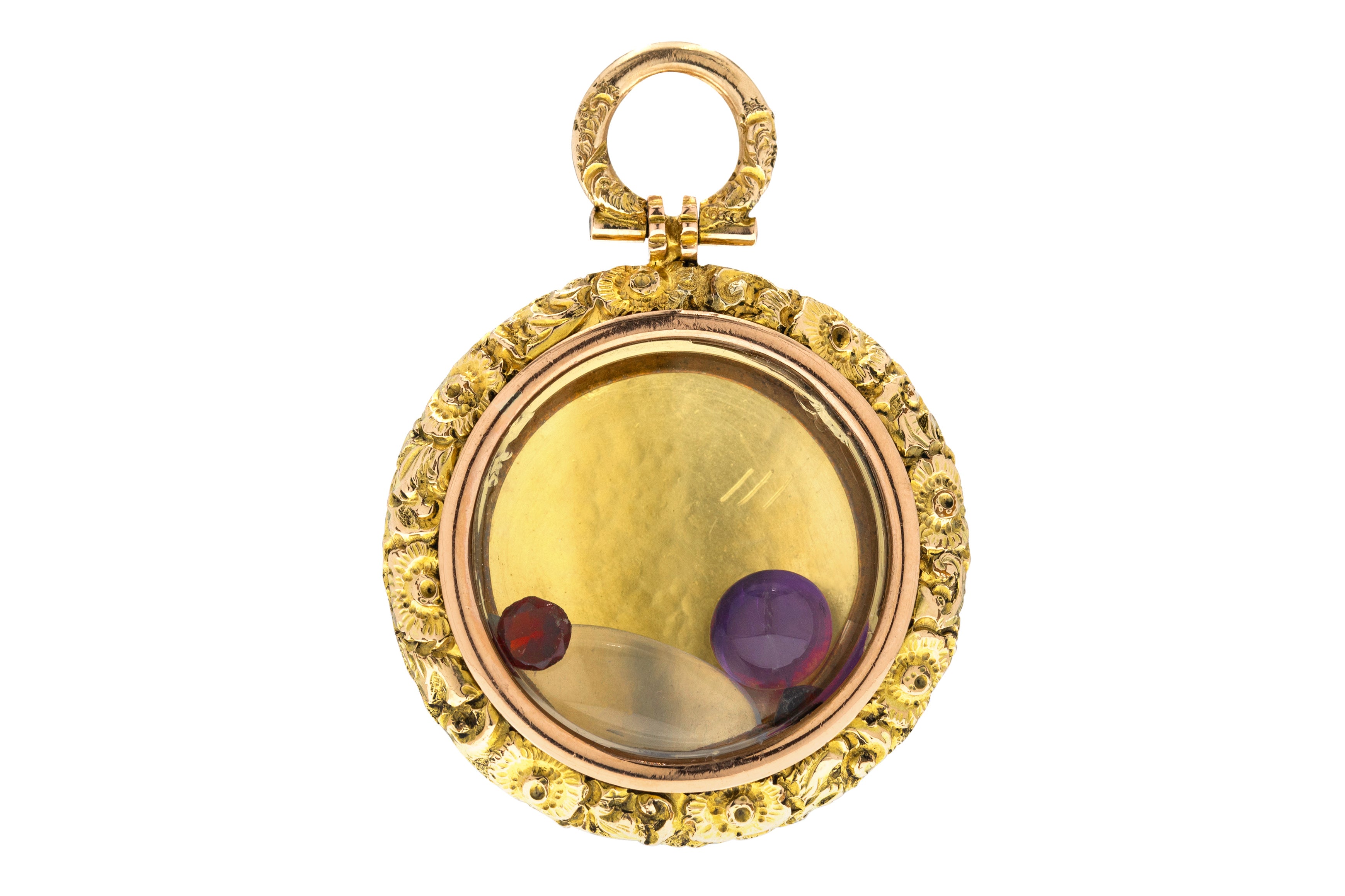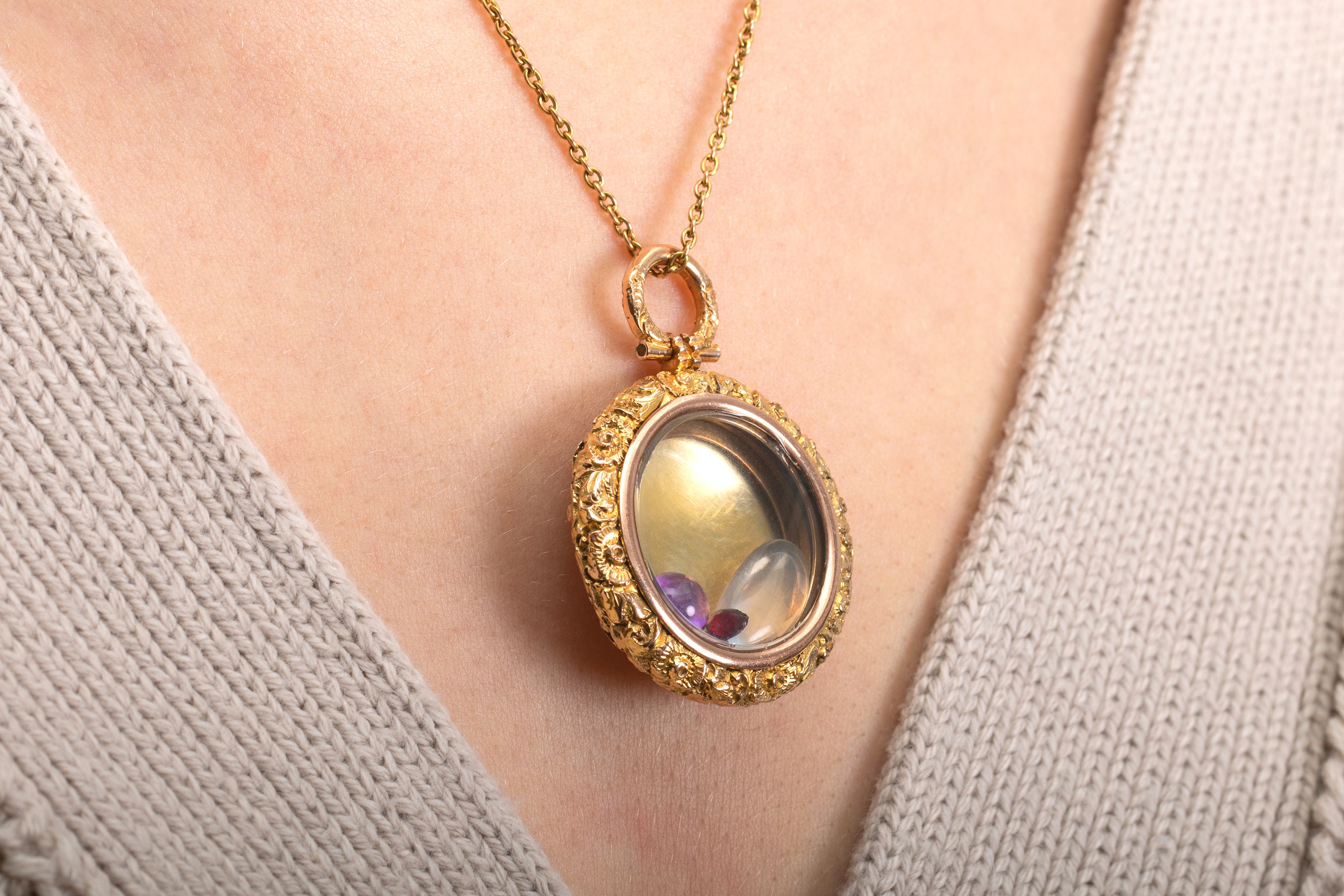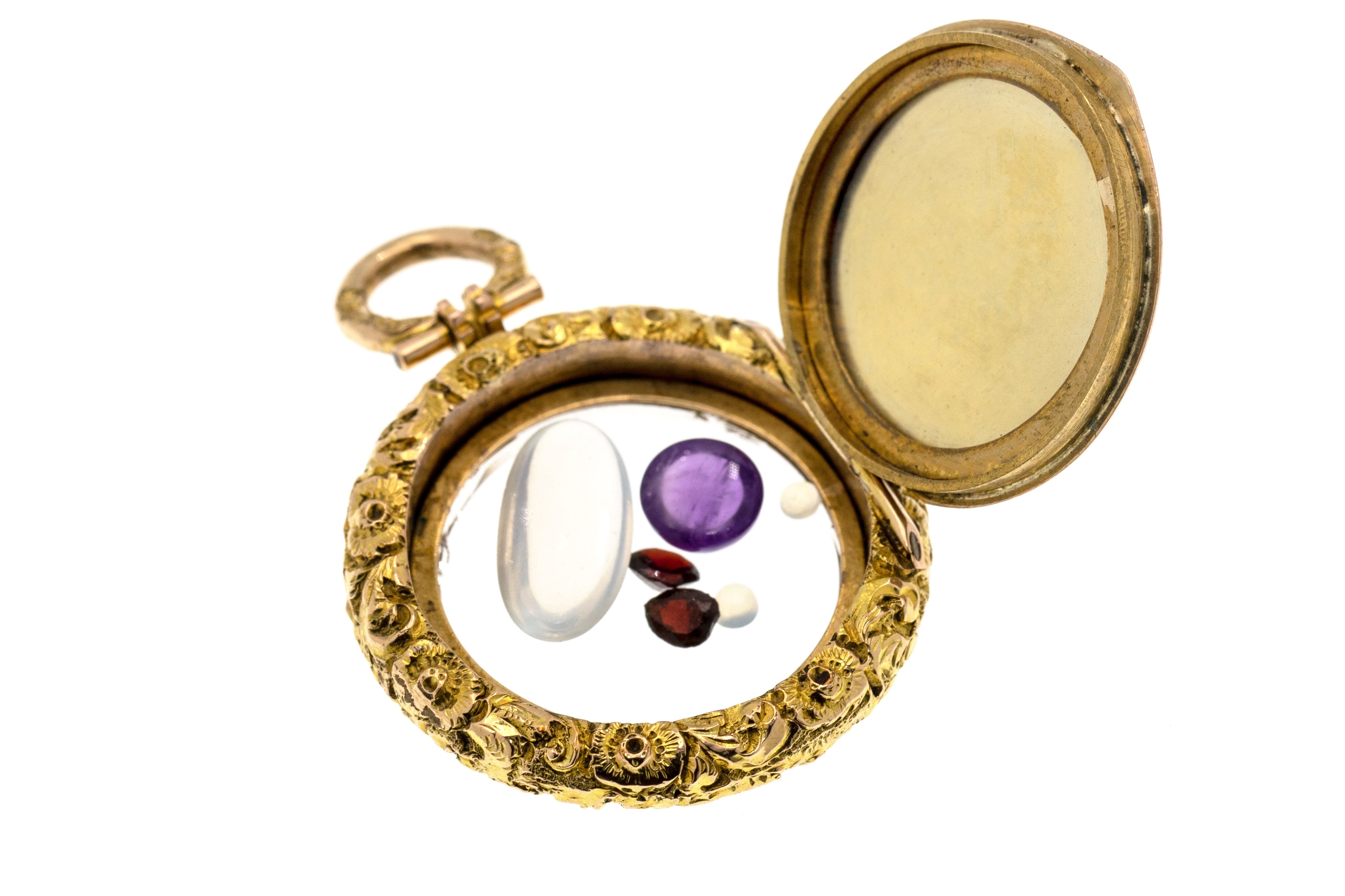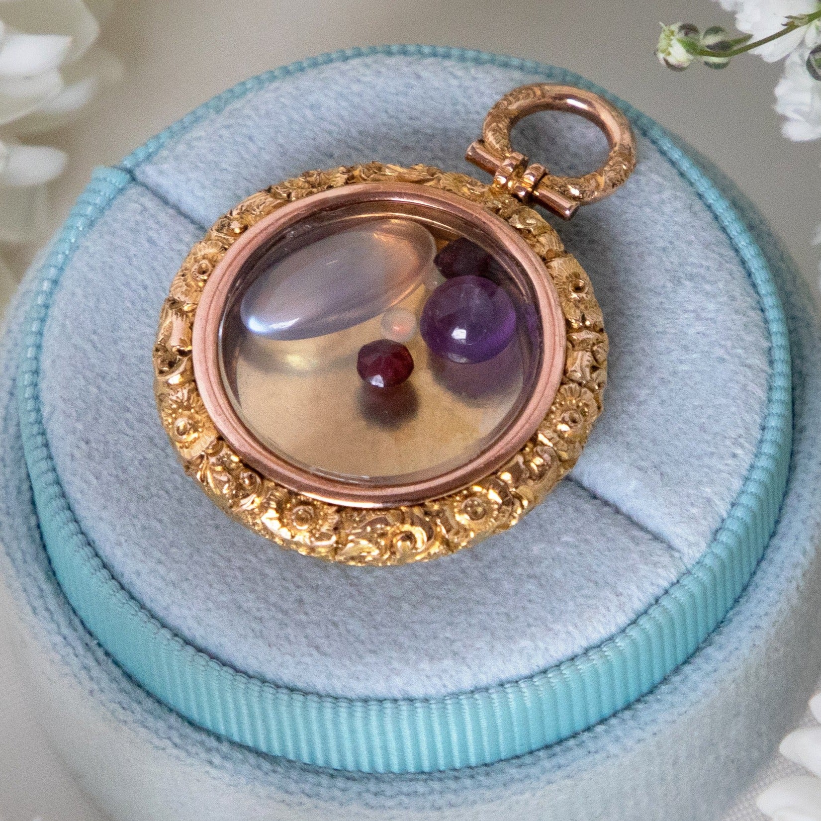 Victorian 9ct Gold Engraved Shaker Locket - Garnet, Amethyst, Moonstone, Opal