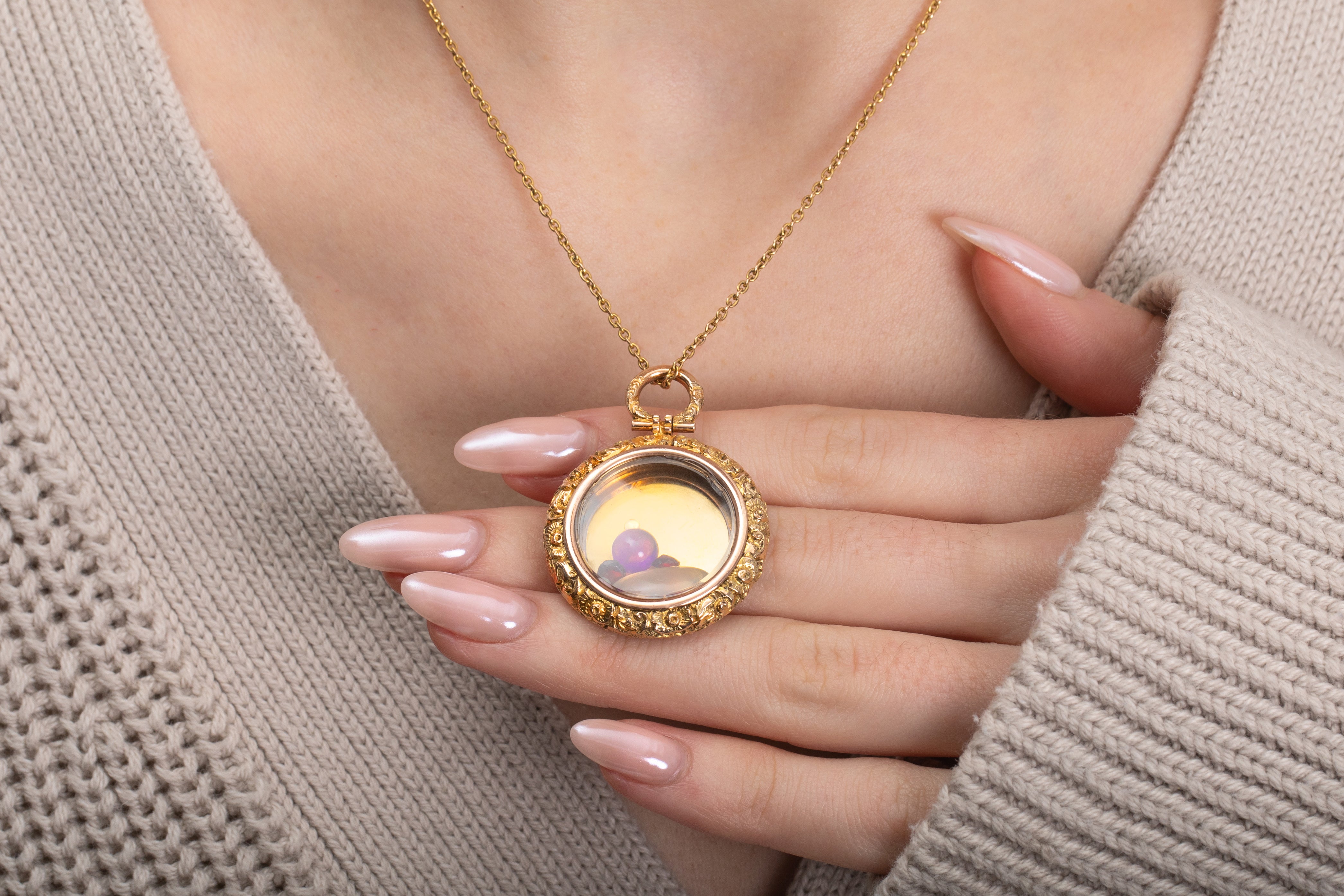A decadent Victorian 9ct Gold engraved shaker locket jam-packed with juicy gems! This antique locket boasts crimson Garnets, an orchid-hued Amethyst, a glowing Moonstone, and a sprinkling of dainty Opals. Her sumptuous 9ct Gold possesses a glorious hue, giving this piece an uber-luxurious feel.