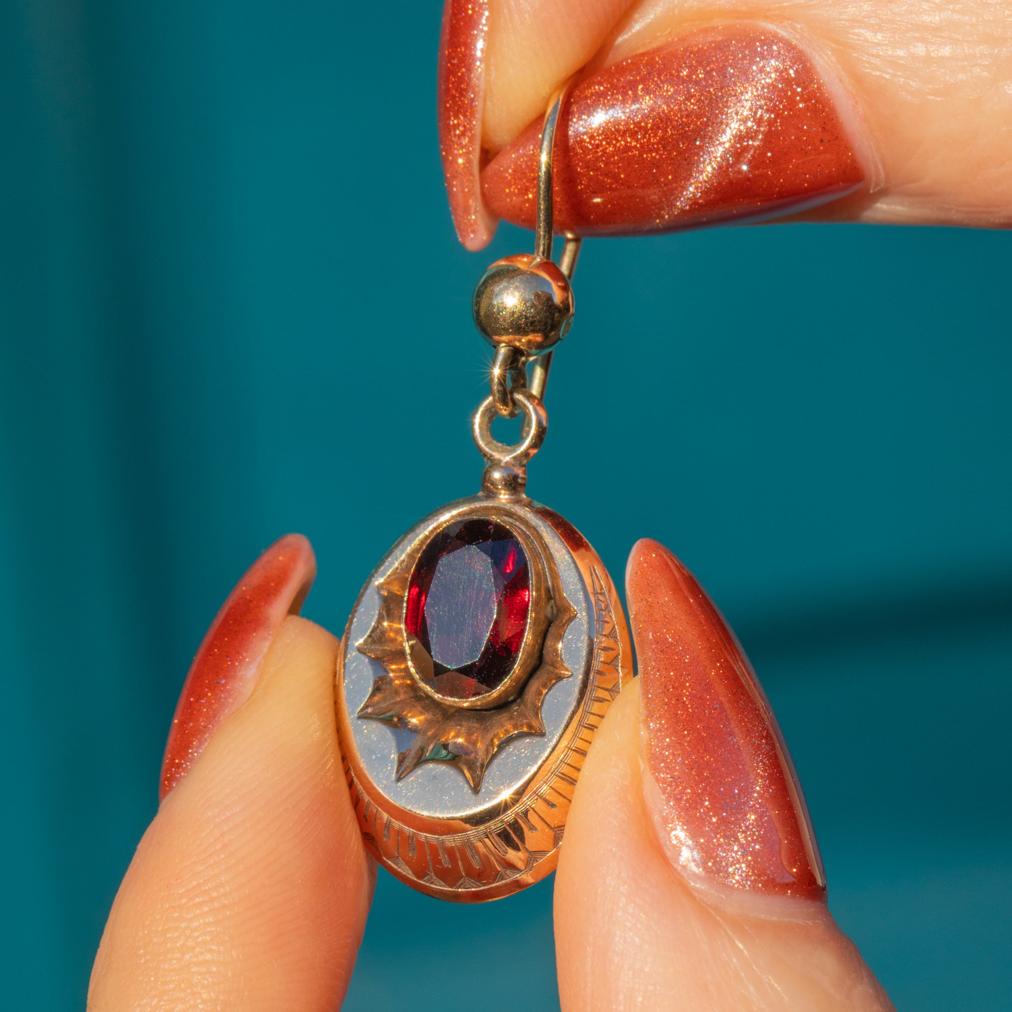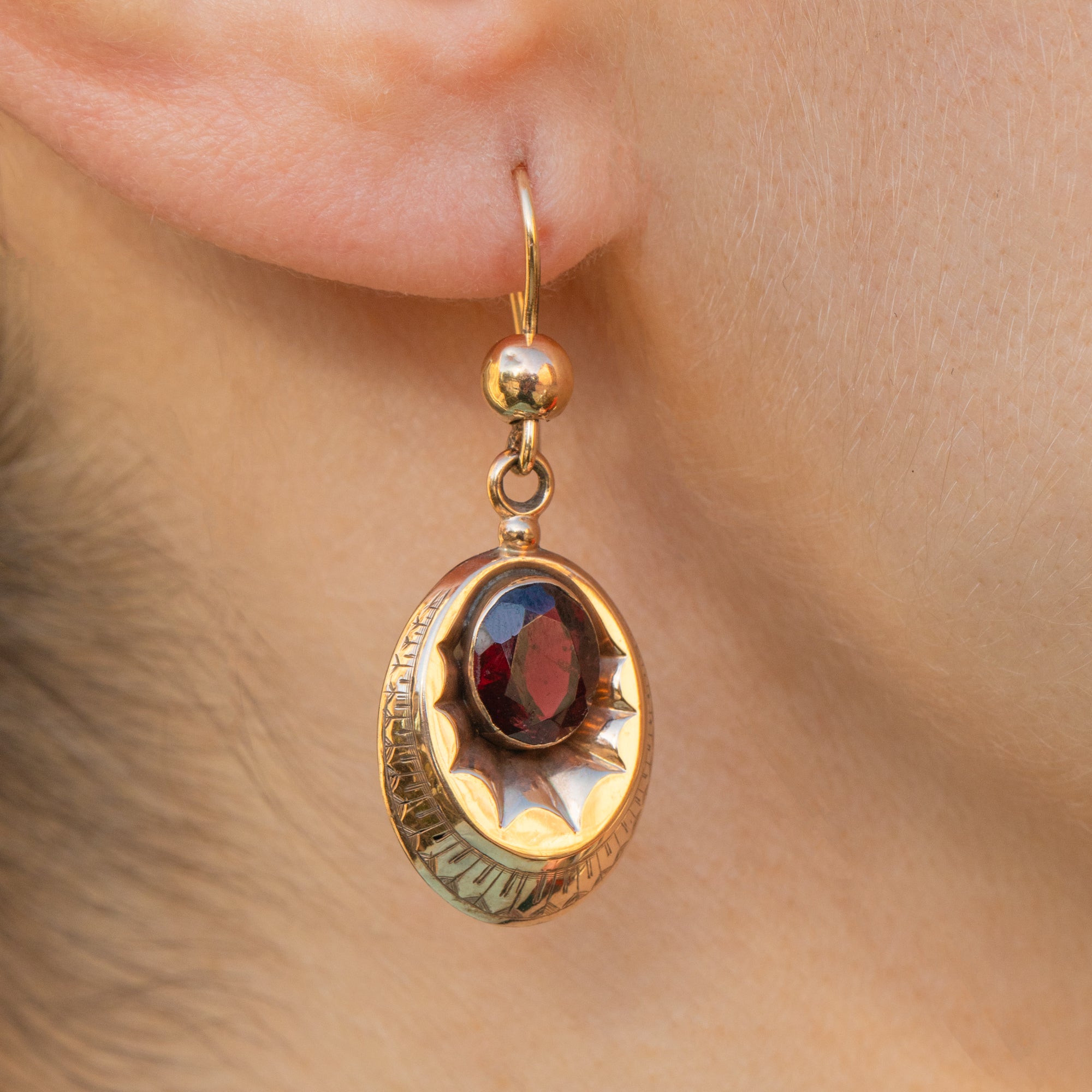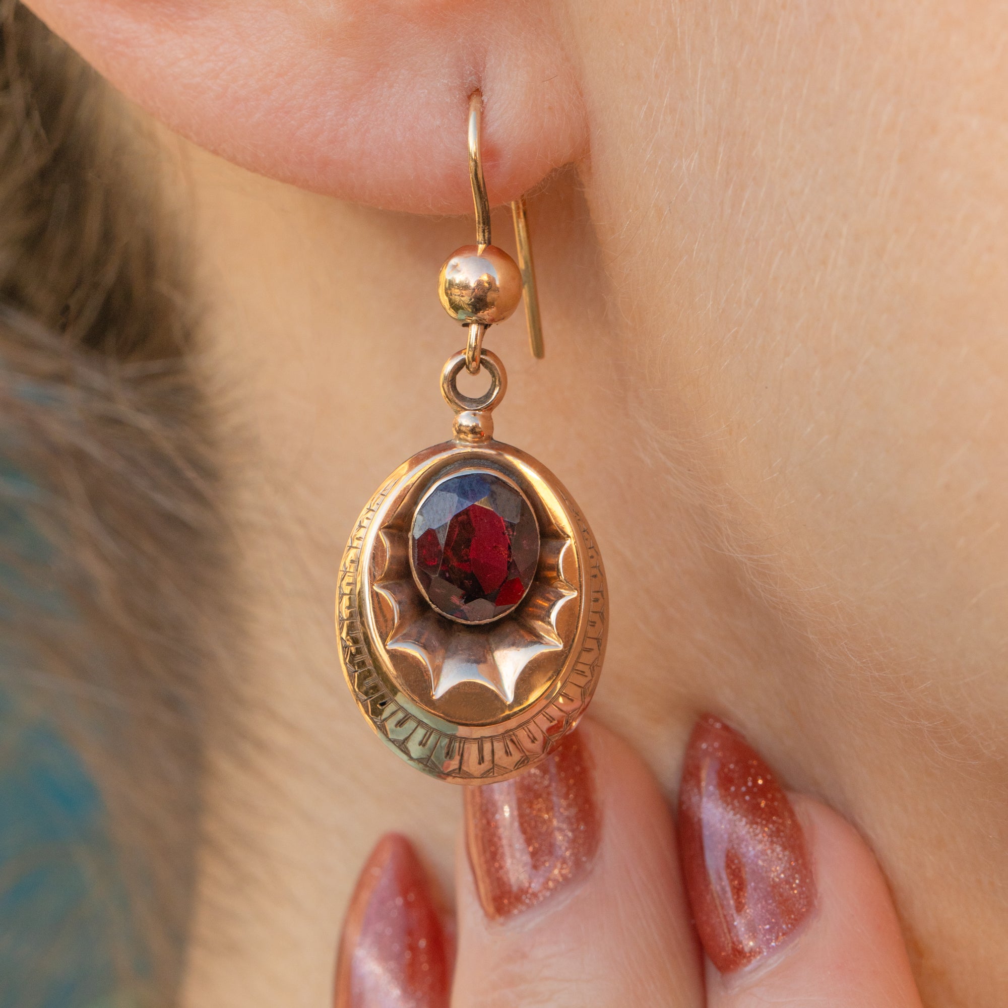 The earrings have been beautifully made, with an eye-catching design displaying striking hand-engraved details. Complete with generously sized hooks, these Victorian Garnet earrings will provide your lobes with a gentle movement!