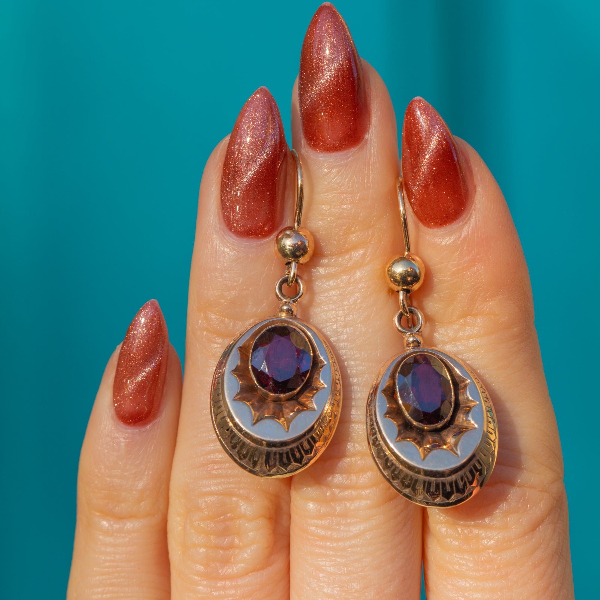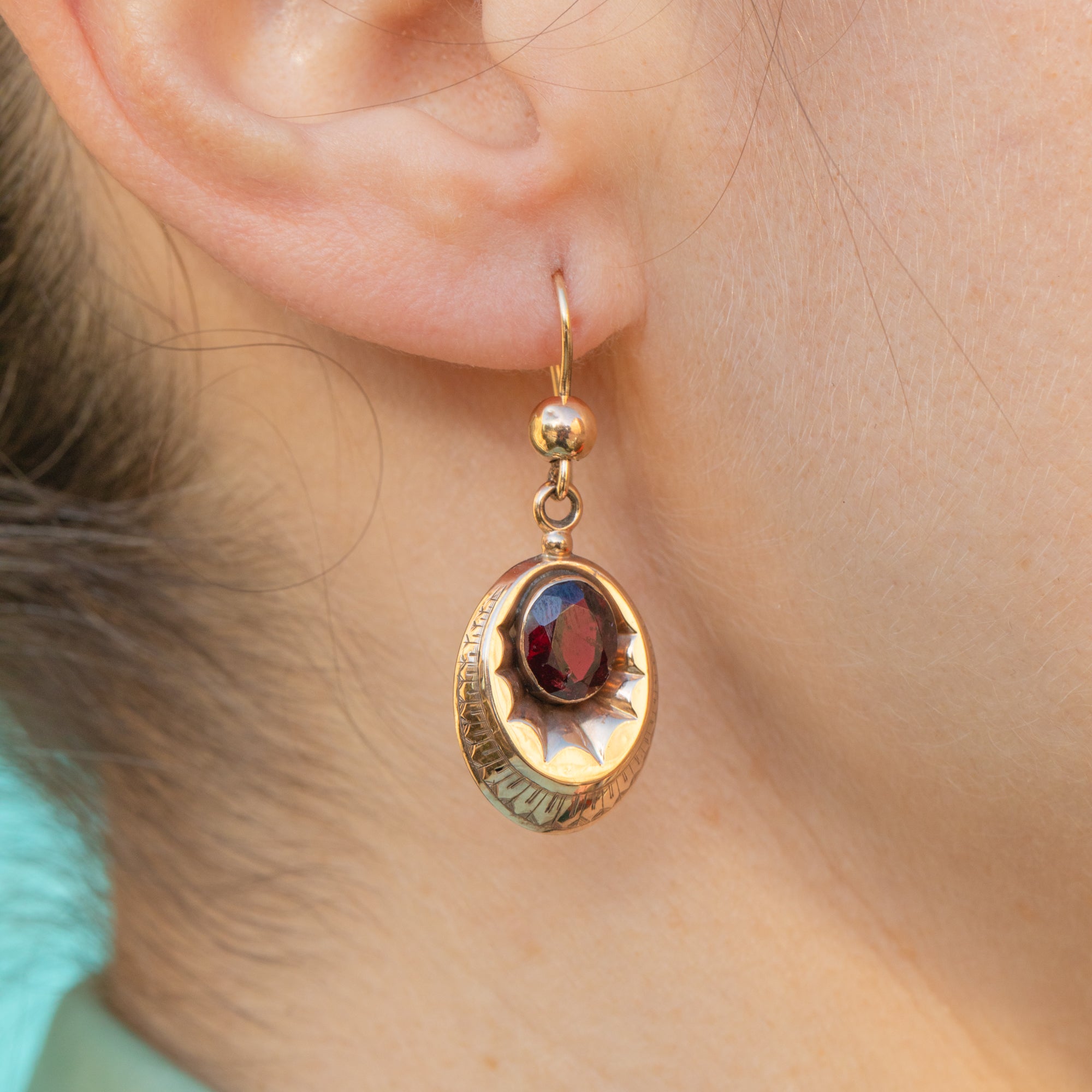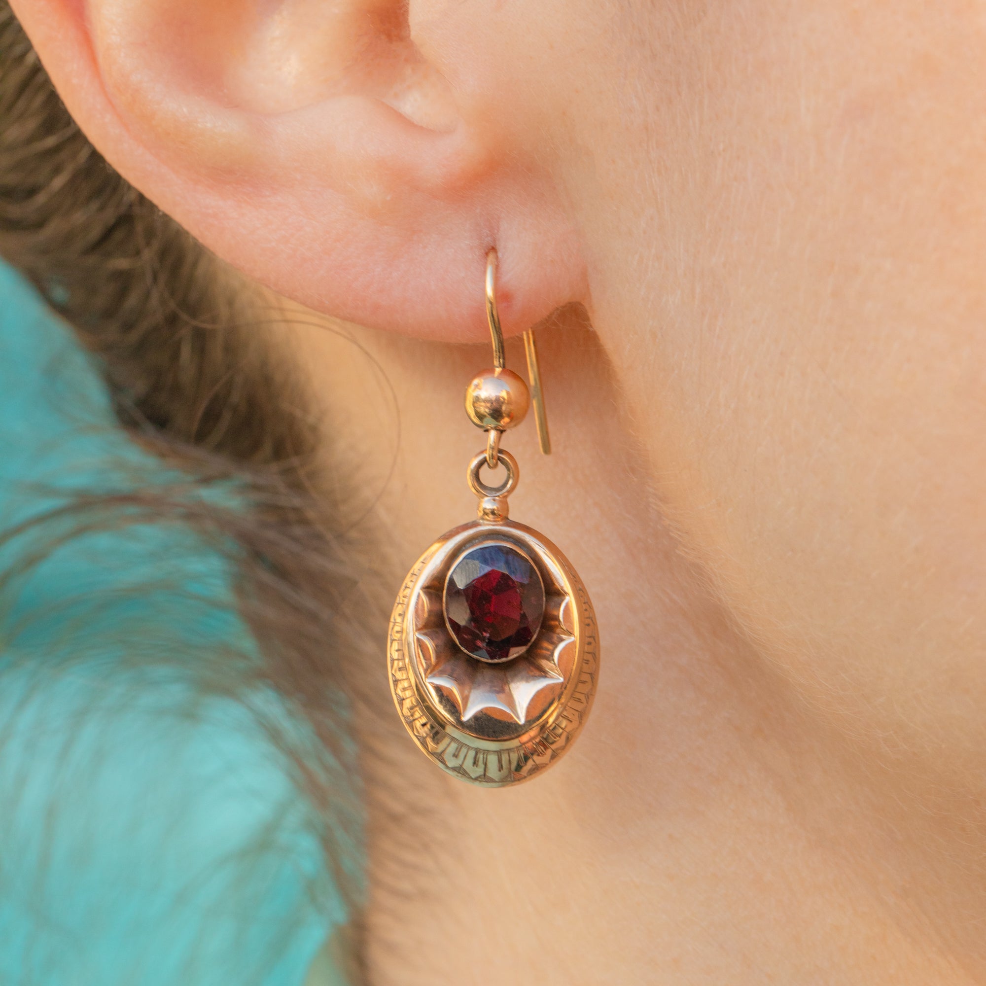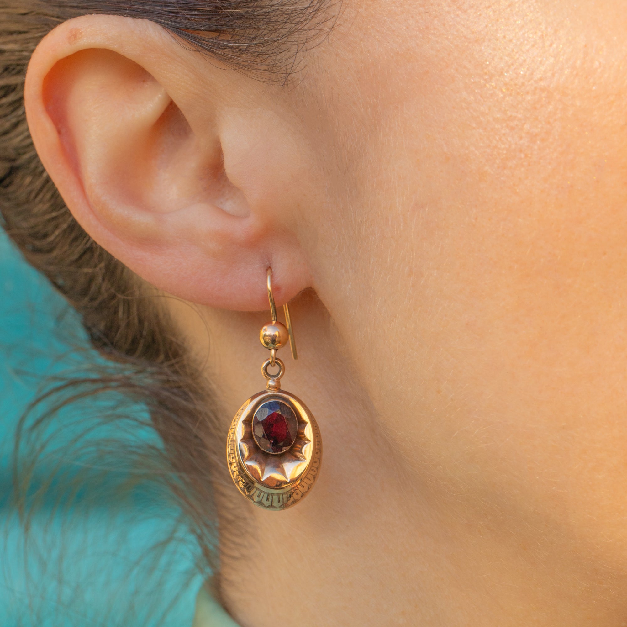 The earrings have been beautifully made, with an eye-catching design displaying striking hand-engraved details. Complete with generously sized hooks, these Victorian Garnet earrings will provide your lobes with a gentle movement!