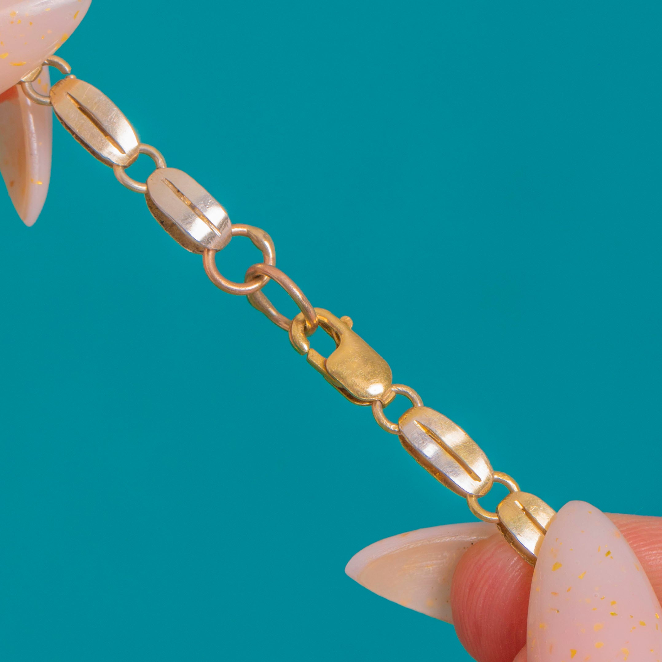 A luminous line of Moonstone cabochons graces this Victorian bracelet, each stone displaying a gentle blue-white glow. Individually collet-set and articulated, the cabochons form a refined rivière that sits slim and fluid on the wrist.