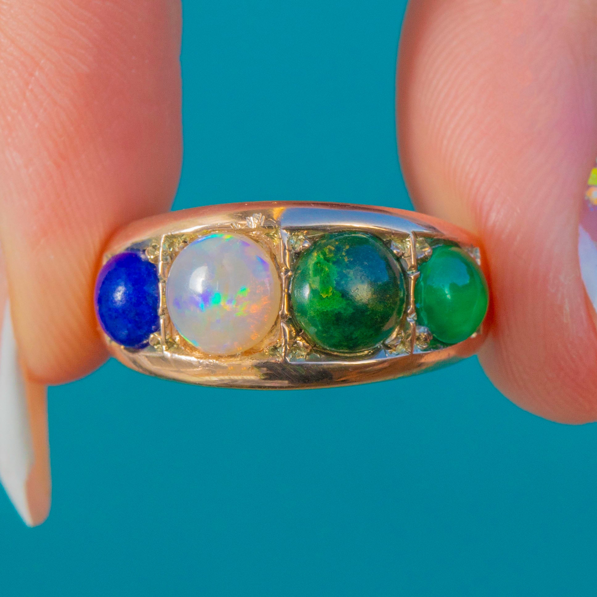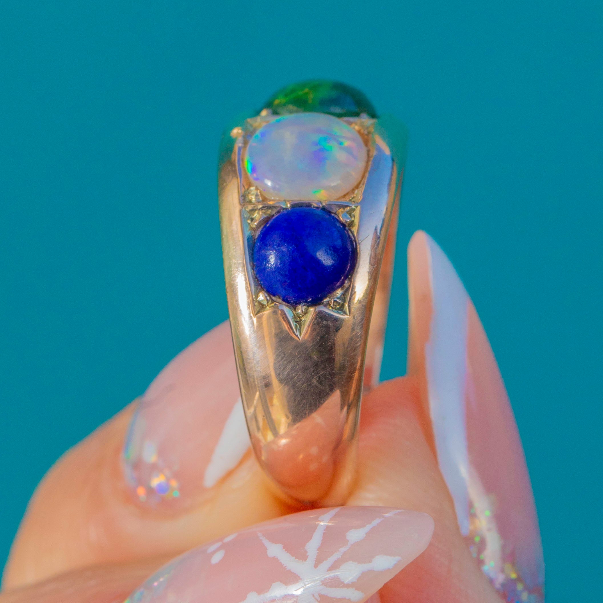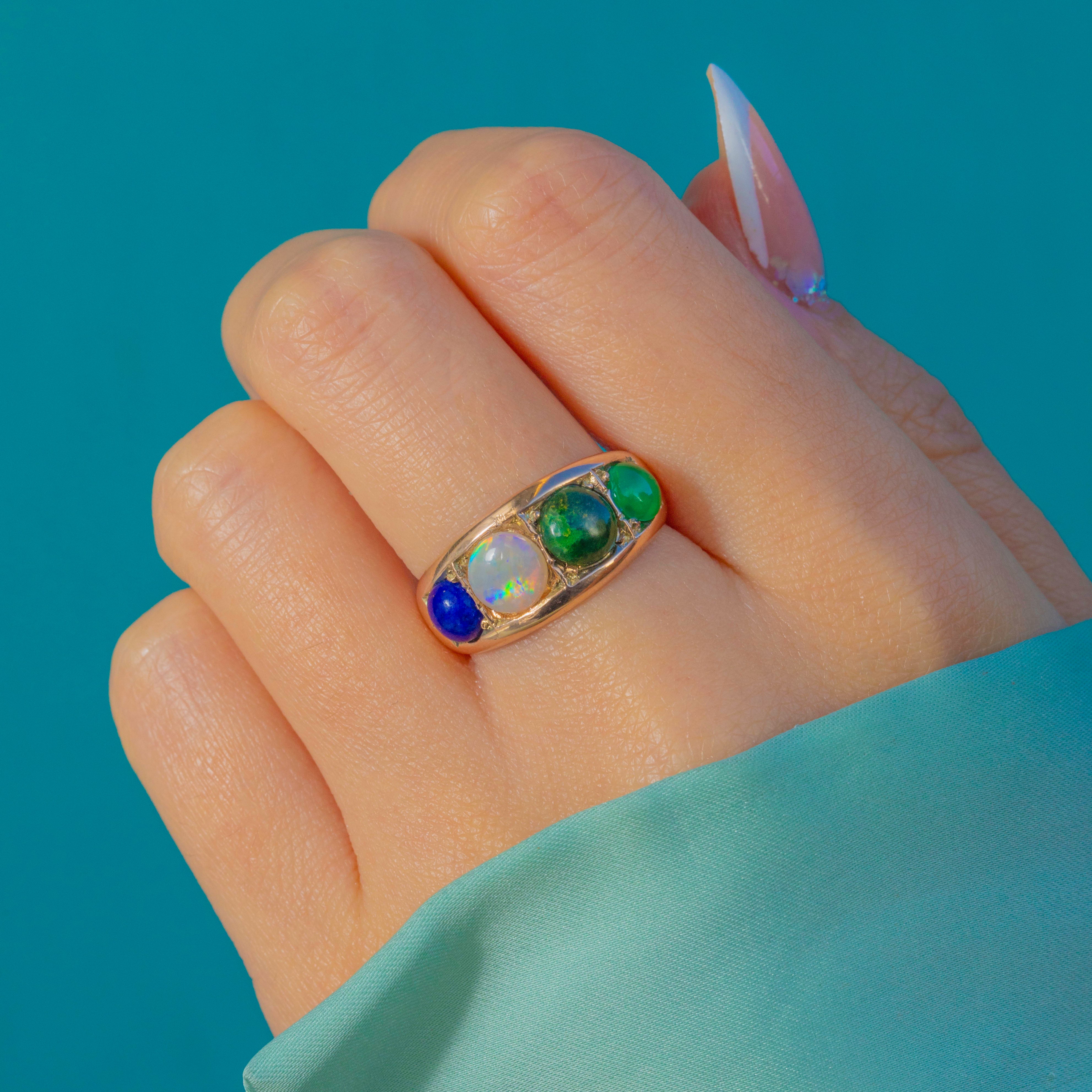 The central Opal shimmers with pretty flashes, framed by deep green Vesuvianite, rich blue Lapis and a vibrant Emerald cabochon. Full of character and colour, this joyful antique ring brings a little bit of fun to any stack.