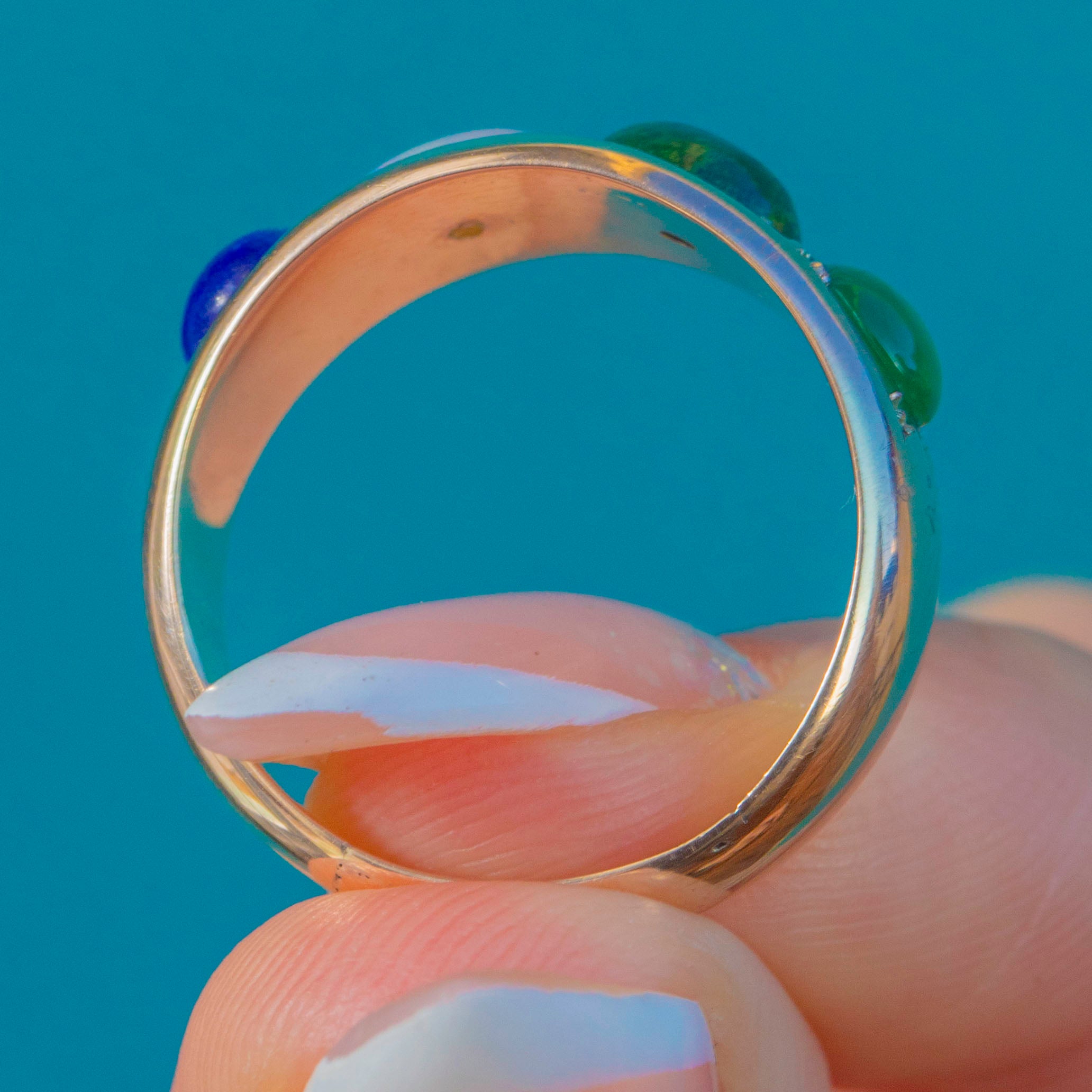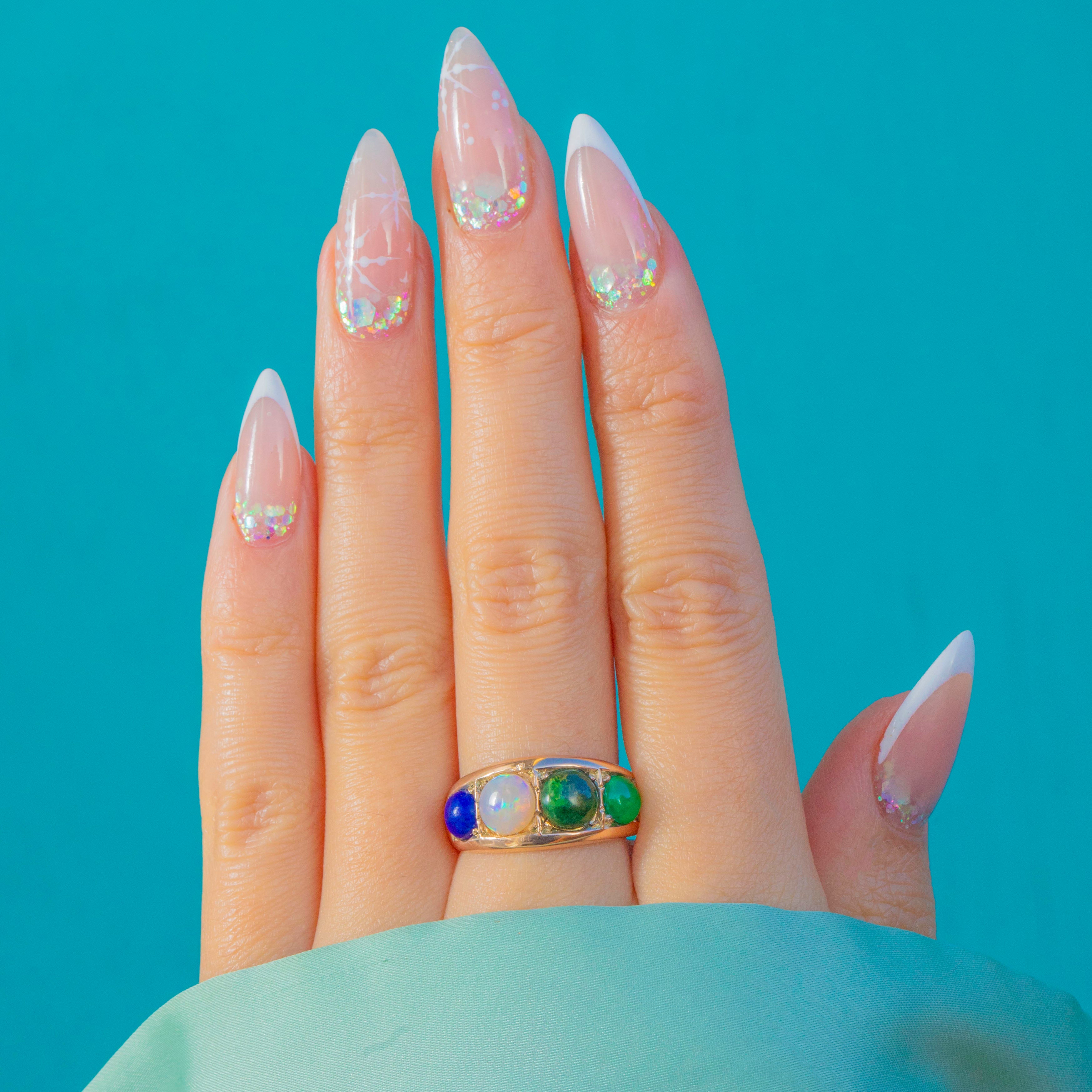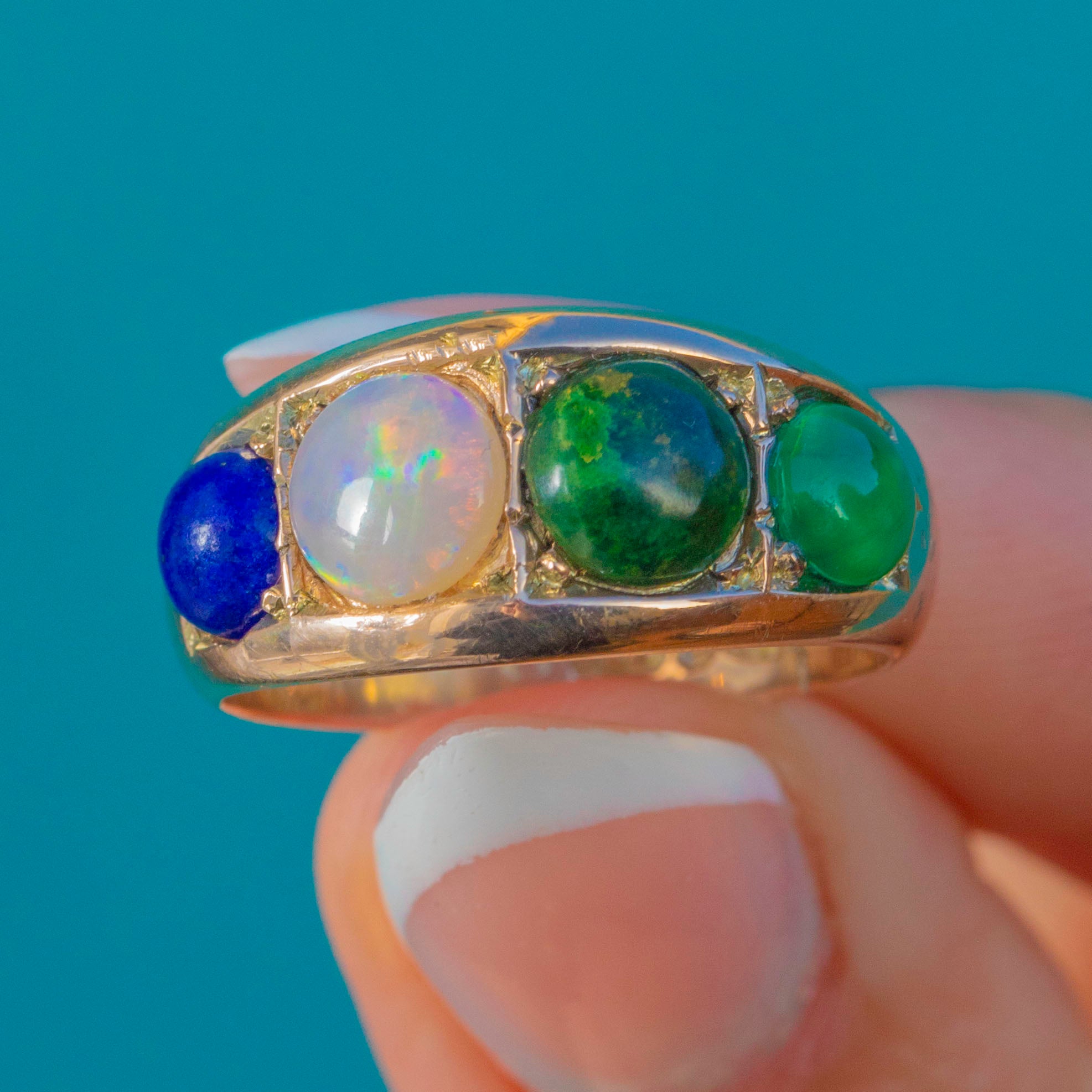 The central Opal shimmers with pretty flashes, framed by deep green Vesuvianite, rich blue Lapis and a vibrant Emerald cabochon. Full of character and colour, this joyful antique ring brings a little bit of fun to any stack.