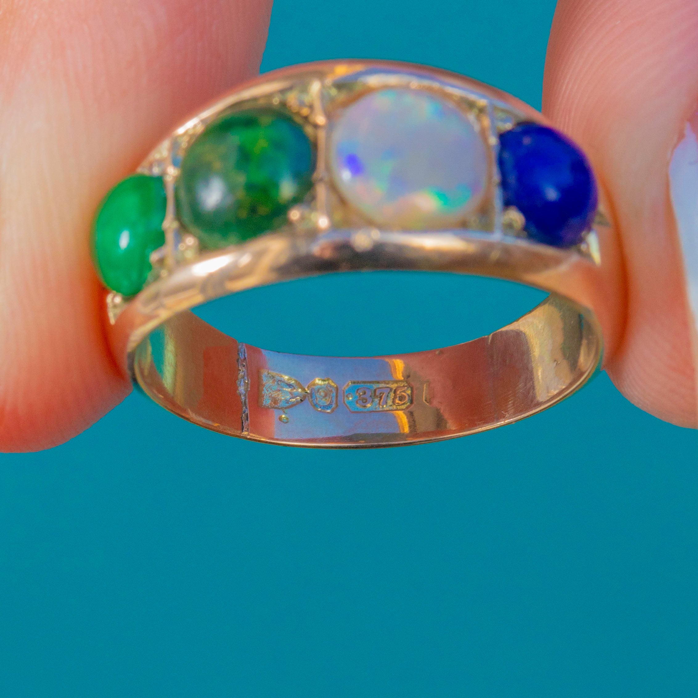 Victorian 9ct Gold “LOVE” Ring with Lapis, Opal, Vesuvianite & Emerald