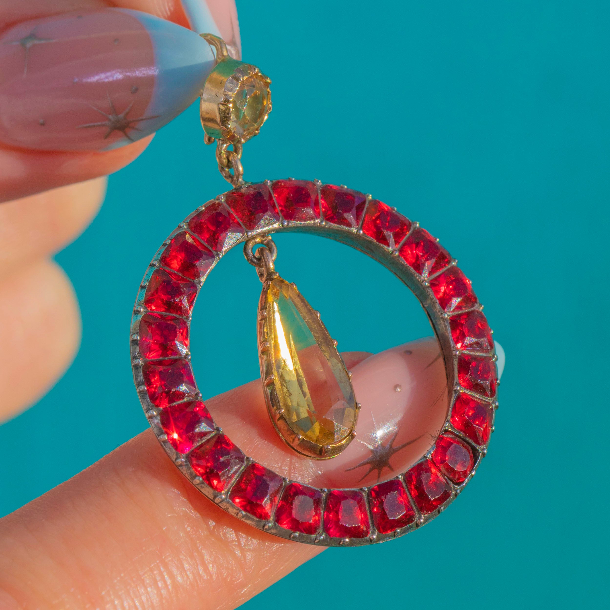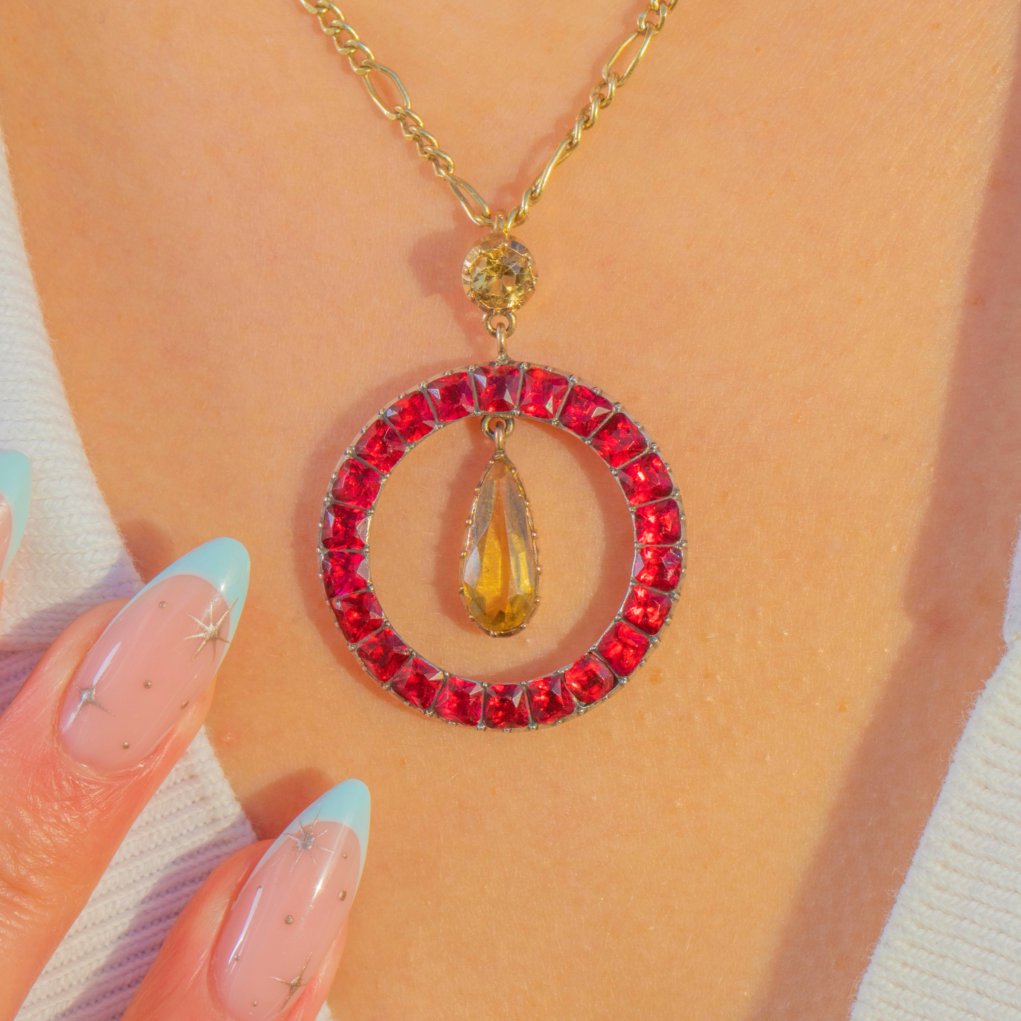 A vivid Victorian roundel pendant, its circular halo set with deep red Paste stones in neat, geometric settings and framing a golden Citrine teardrop. A small round Citrine links the halo to the drop, giving graceful articulation and movement. The two-tone palette of Silver and 9ct Gold adds refined contrast and classic period charm.