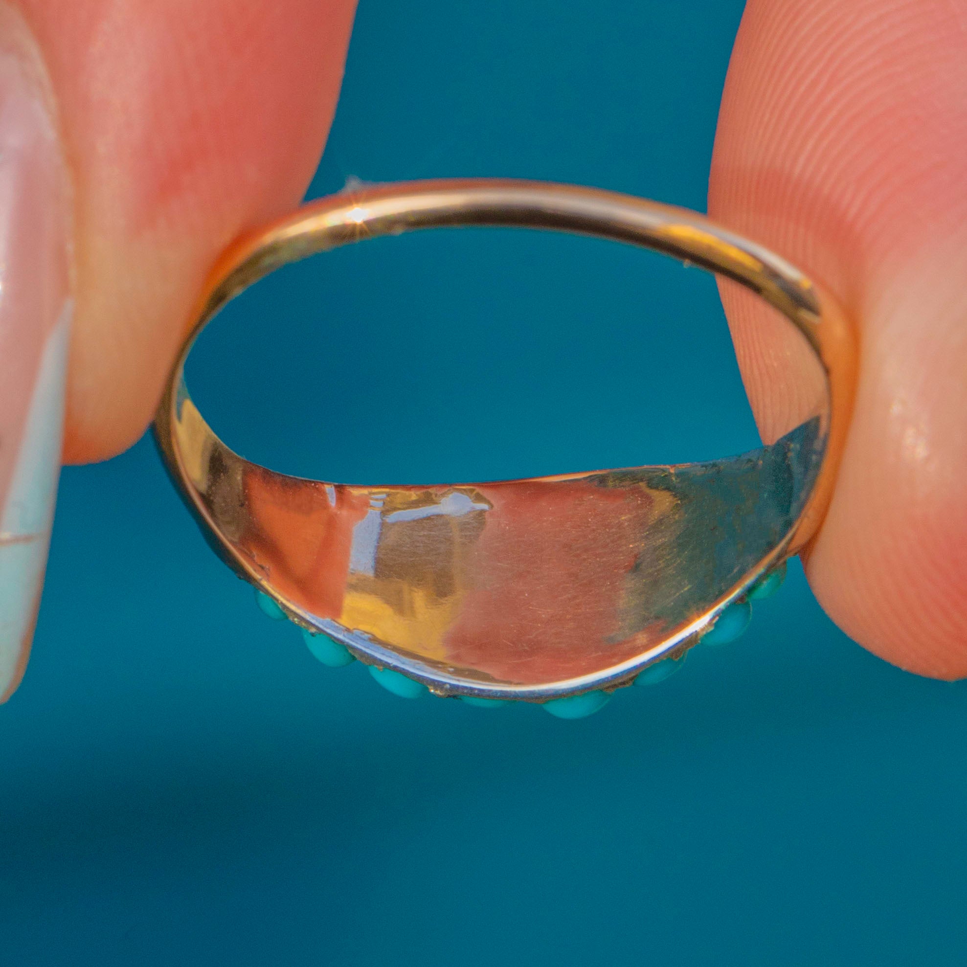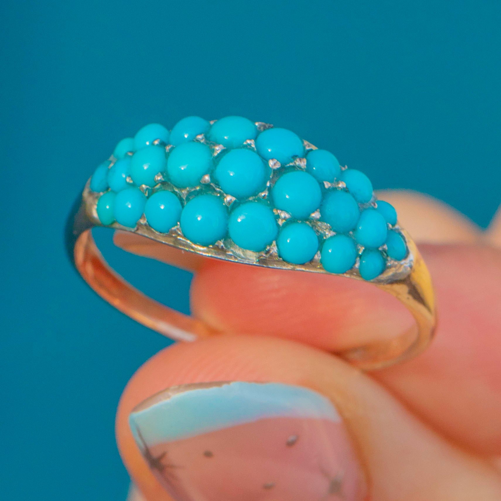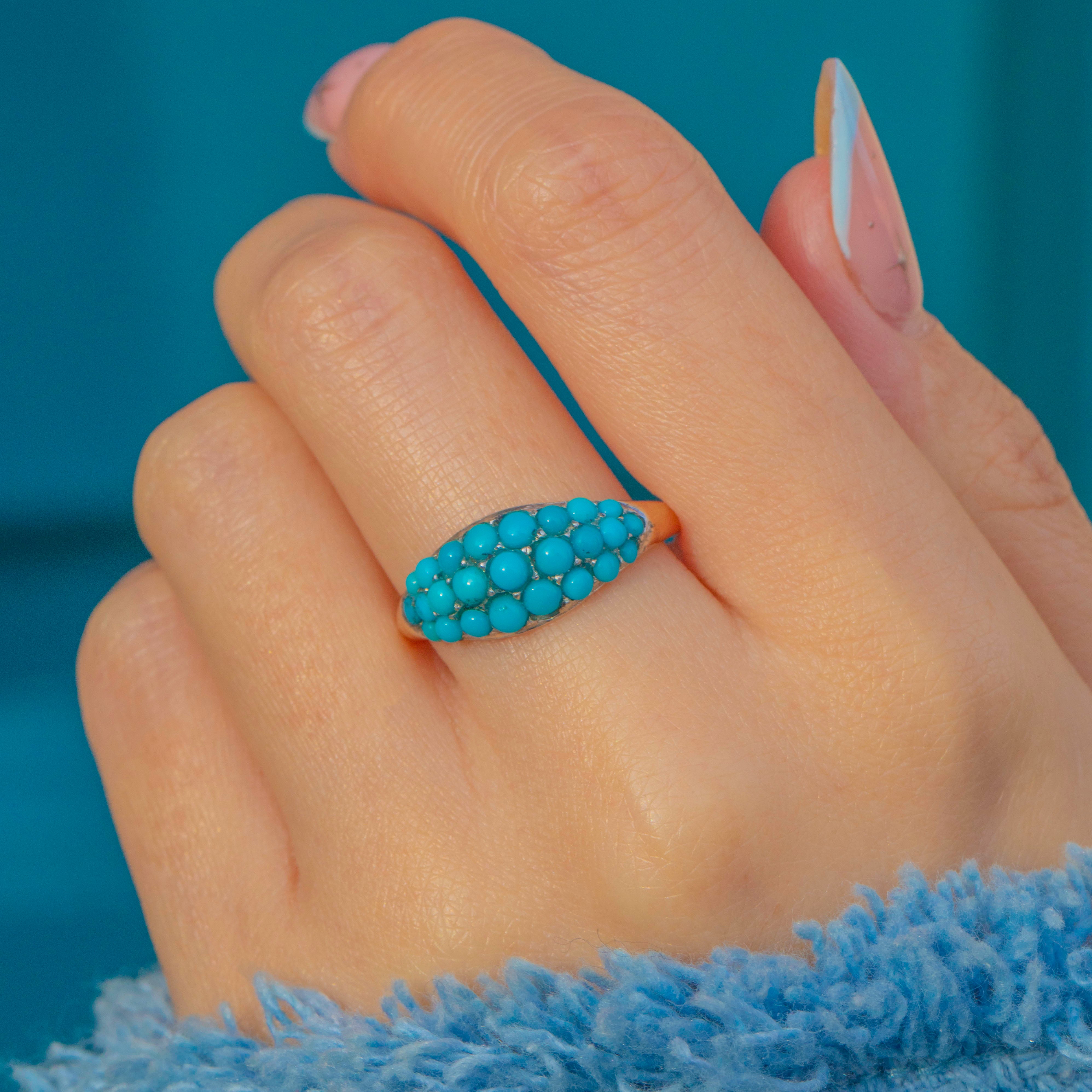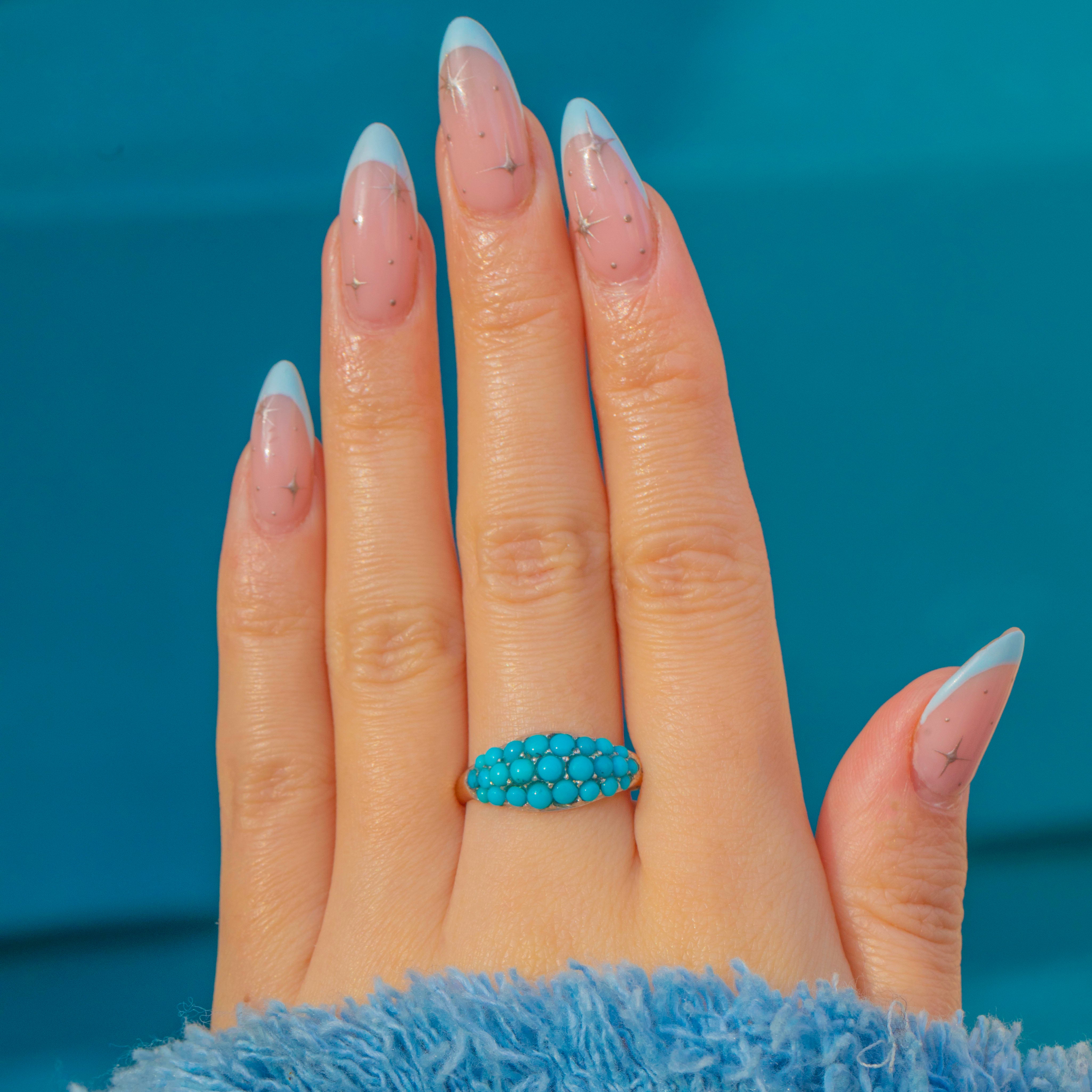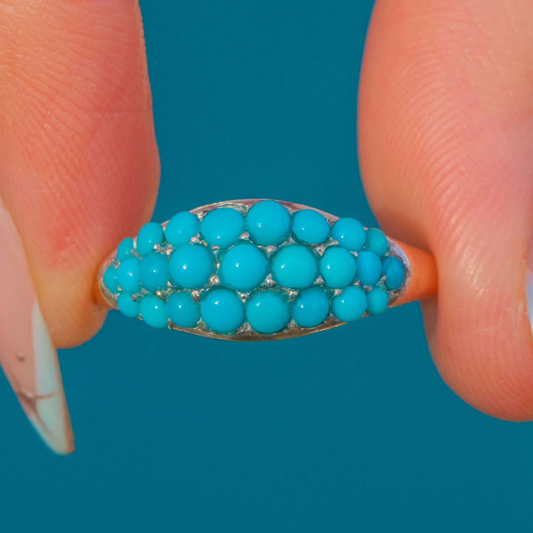 A joyous sweep of sky-blue Turquoise, this Victorian pavé bombé ring captures the charm of the elongated navette cluster. Graduated round cabochons are closely grain-set to create a softly domed tableau of colour, the stones sitting low on the finger for effortless, everyday elegance.