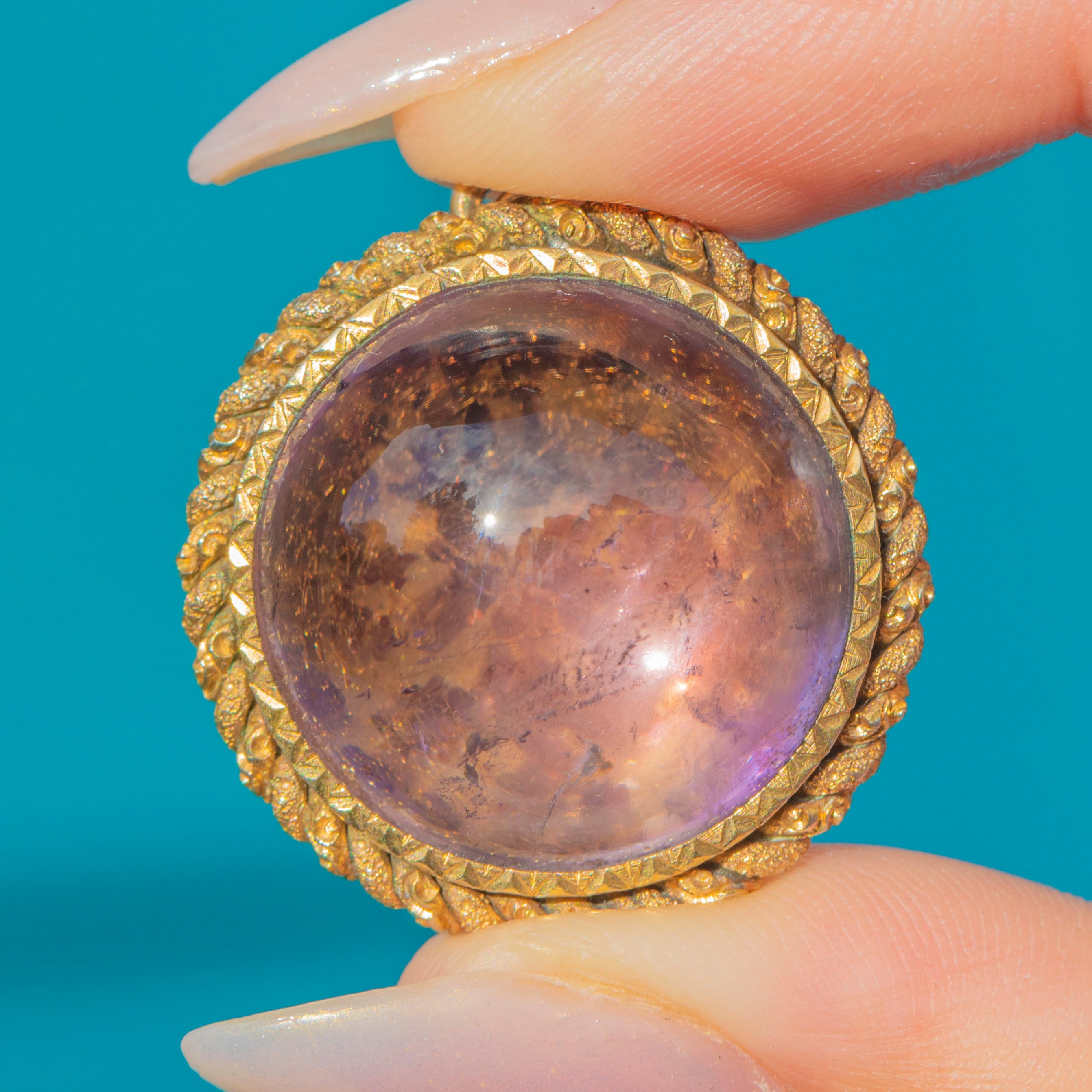 Set within a gilded rope-effect border with a 9ct Gold back and jump-ring, this piece exemplifies Victorian elegance and refined craftsmanship. The lightly speckled effect on the reverse adds a charming visual detail, highlighting the natural beauty of the Amethyst.