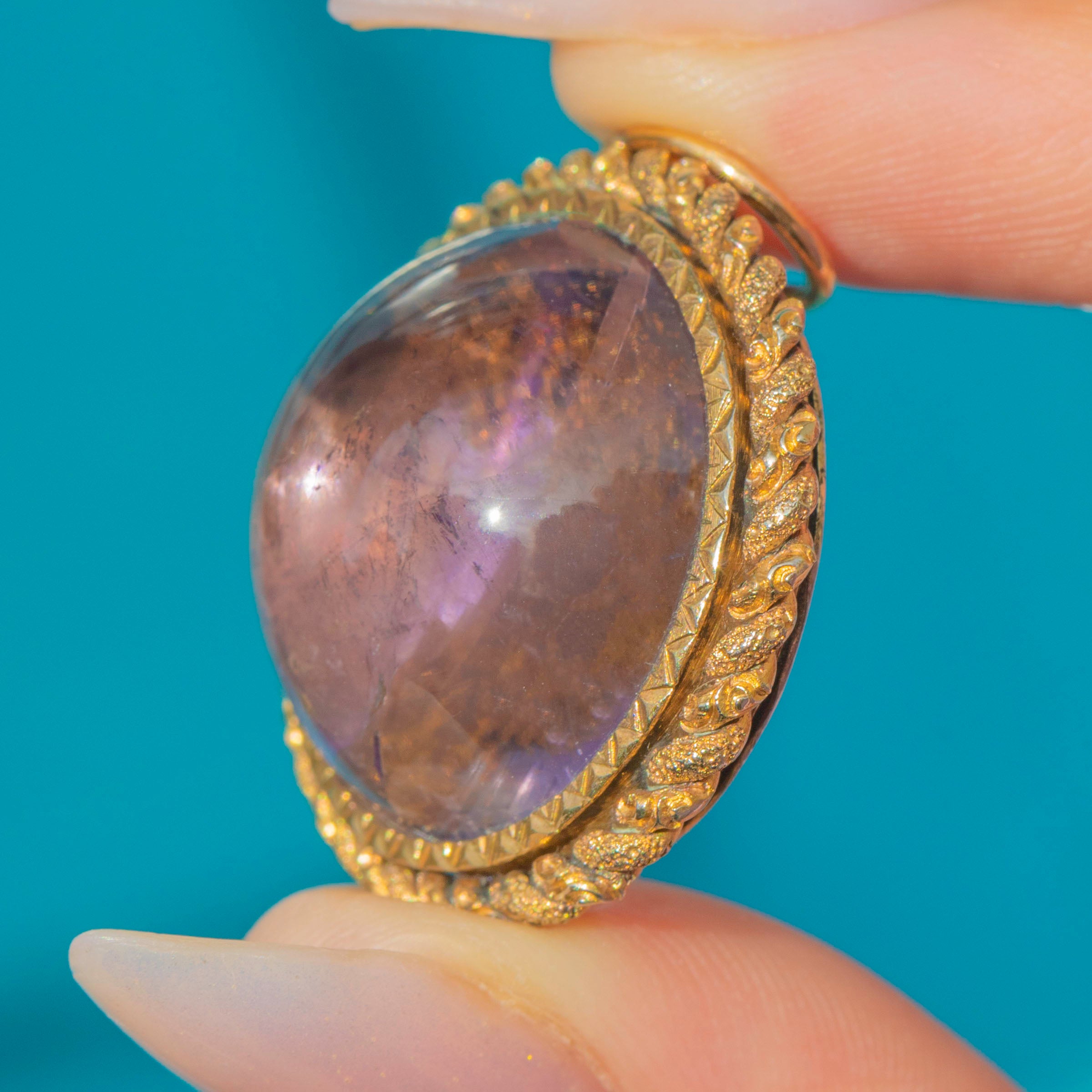 EXCELLENT: The Amethyst cabochon is intact with no damage or wear, maintaining a glossy, smooth surface. The 9ct Gold setting and gilded rope-effect border are well-preserved, highlighting the pendant’s refined Victorian craftsmanship.