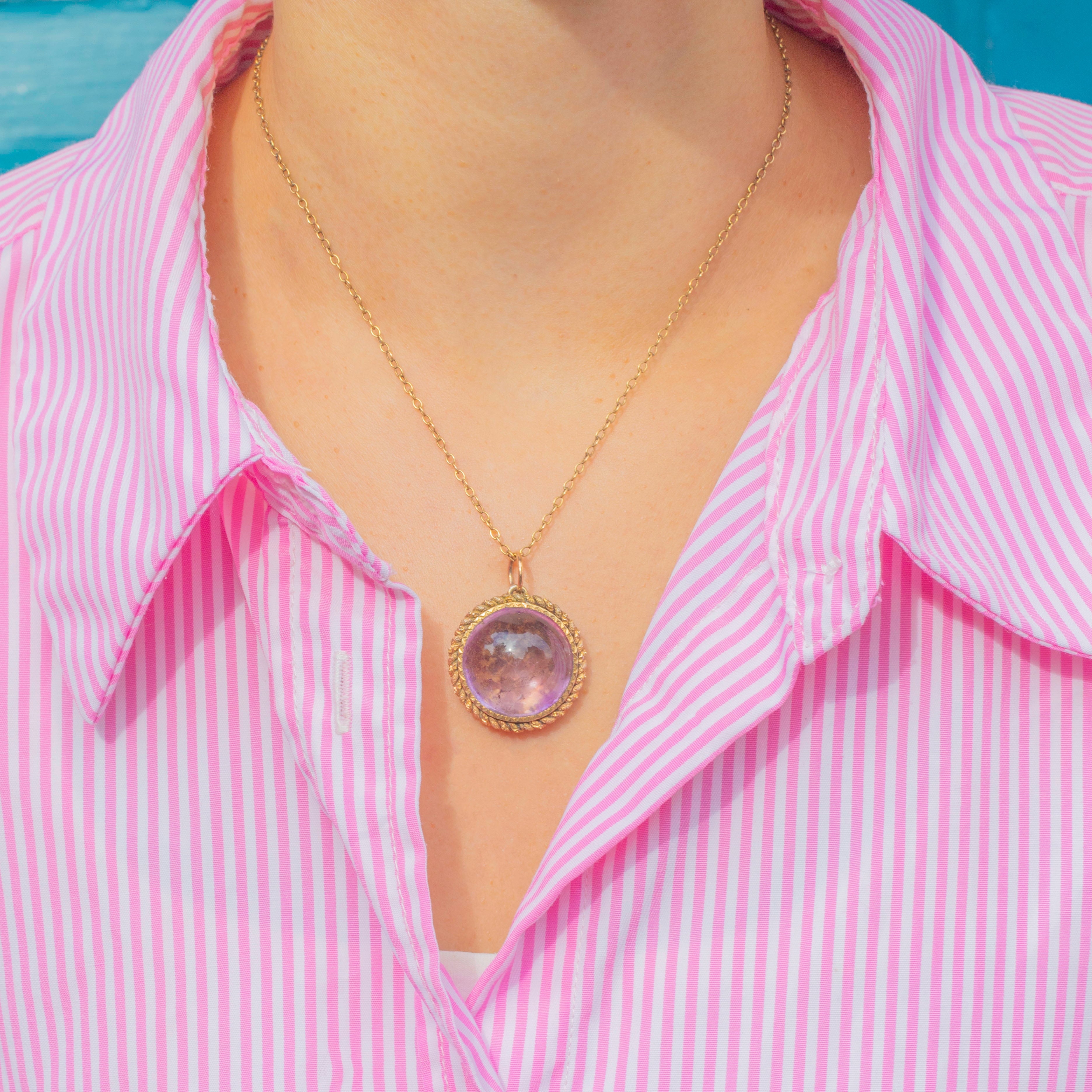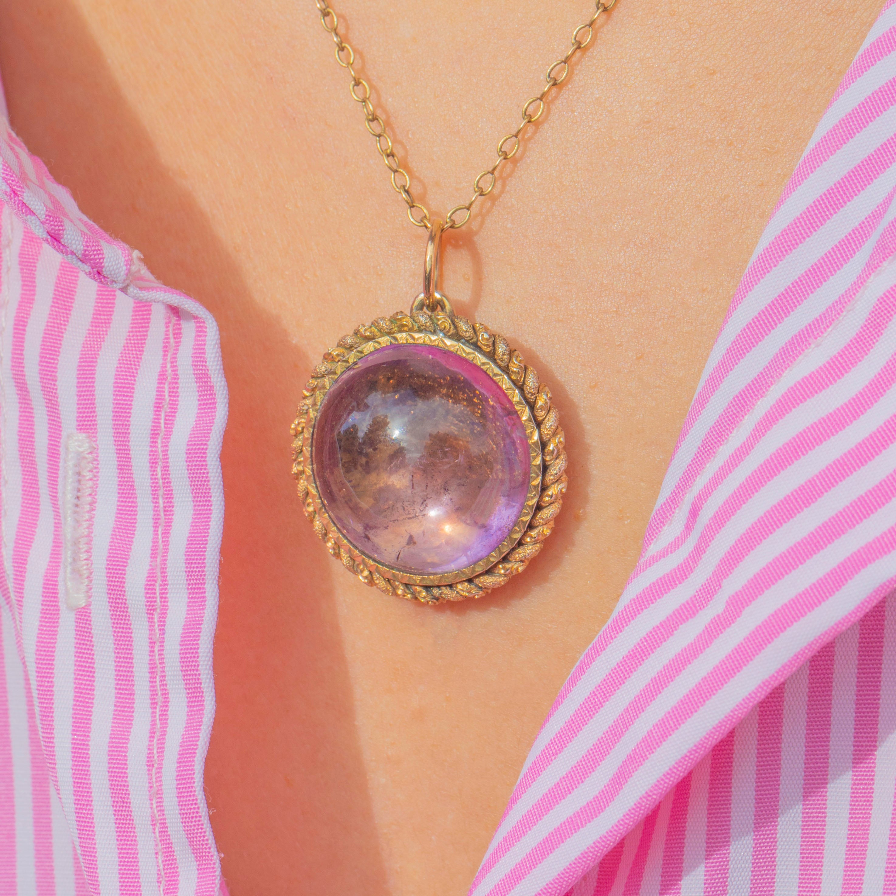 A stunning Victorian pendant crafted in 9ct Gold, featuring a large Pink "Rose De France" Amethyst cabochon. The smooth, glossy orb displays delicate lilac overtones and natural inclusions that catch the light beautifully.