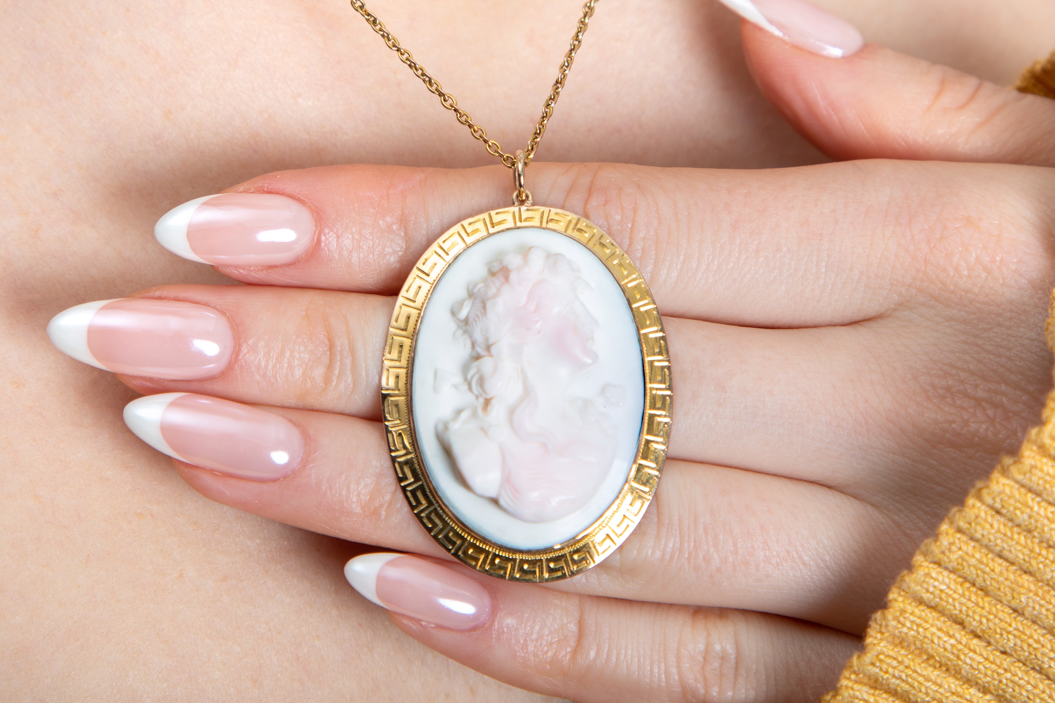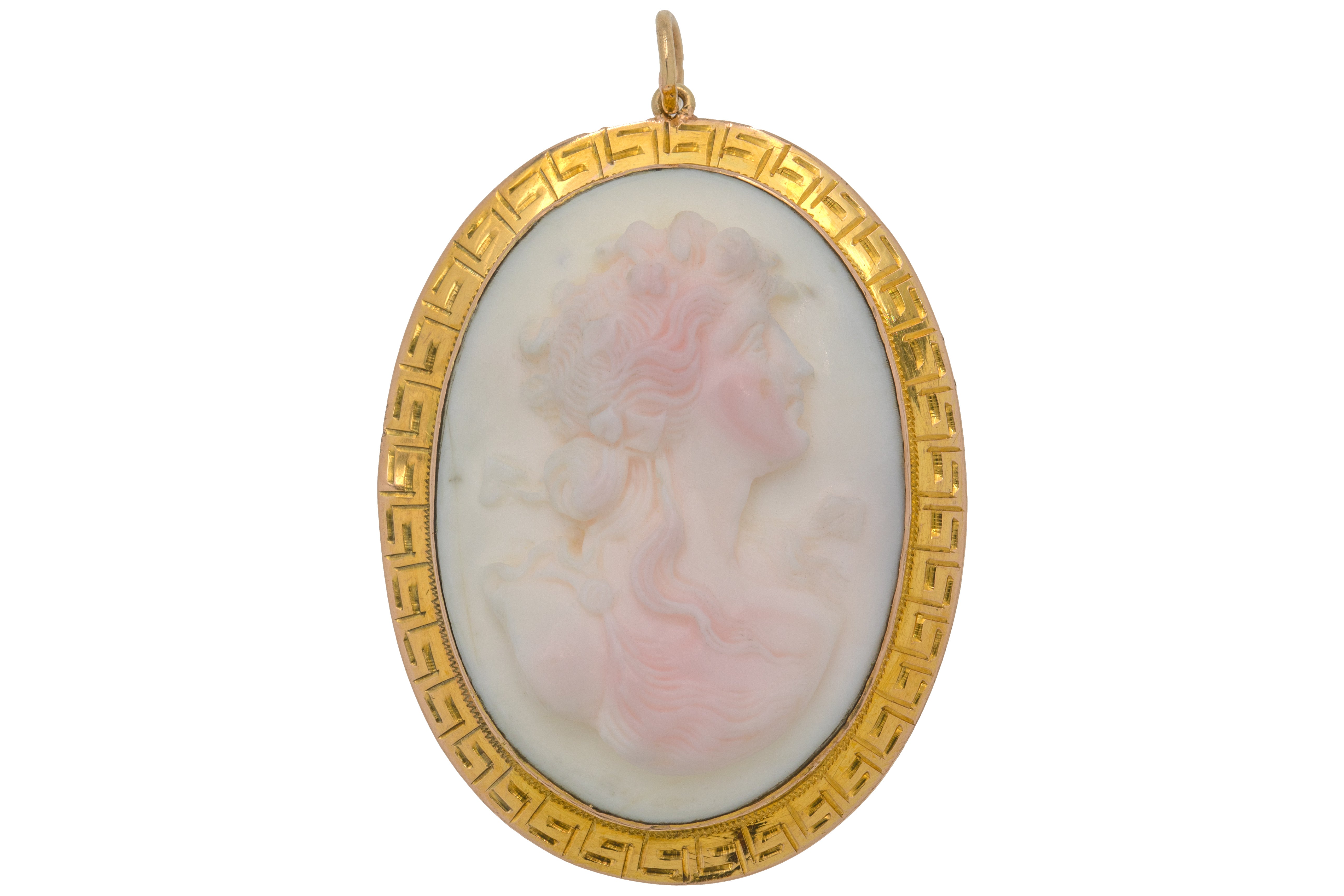 Just look at this Victorian 9ct Gold pink shell cameo 'portrait of a lady' pendant! This exquisite piece features a Greek key edge, and a magnificent portrait of a lady whose hair is scattered with flowers.