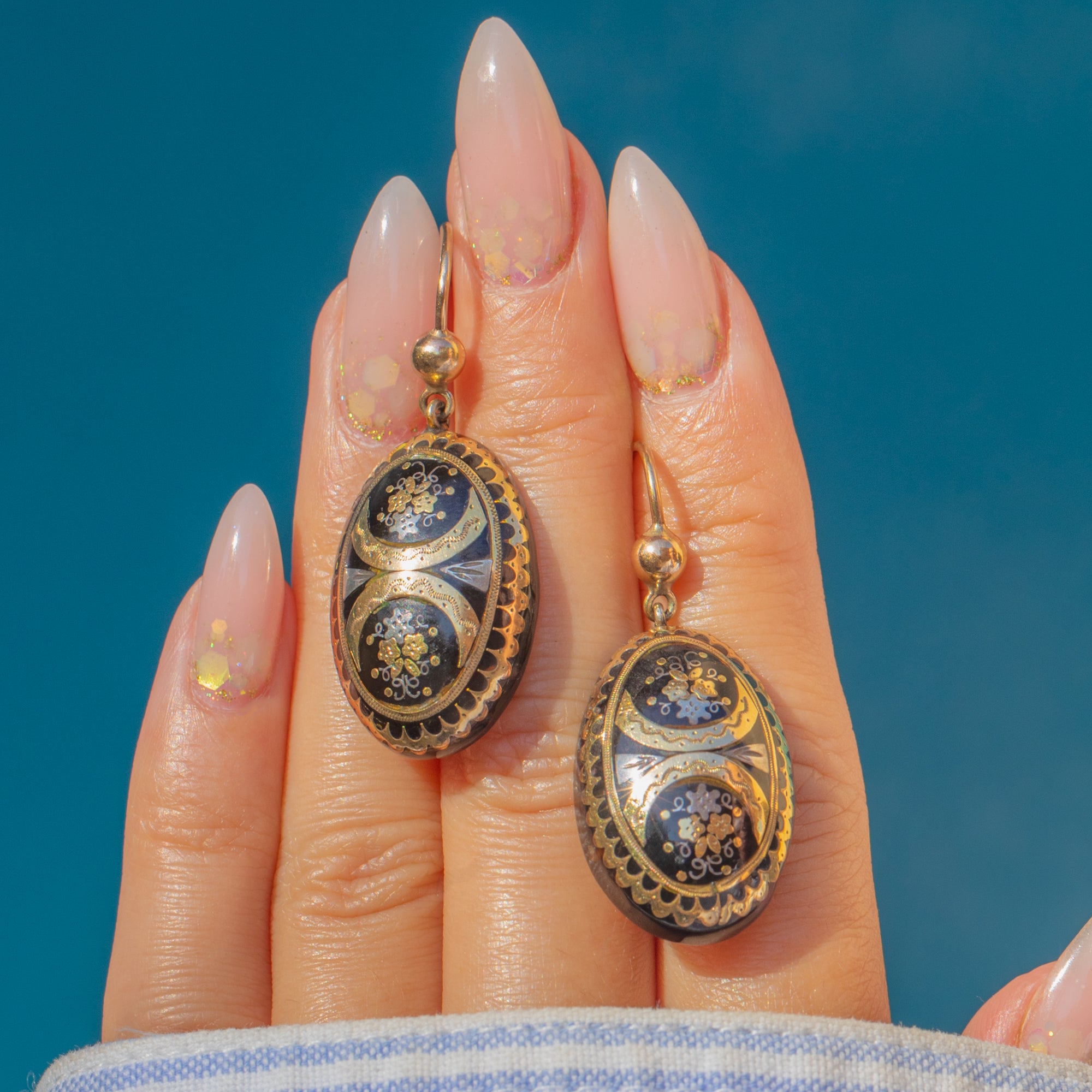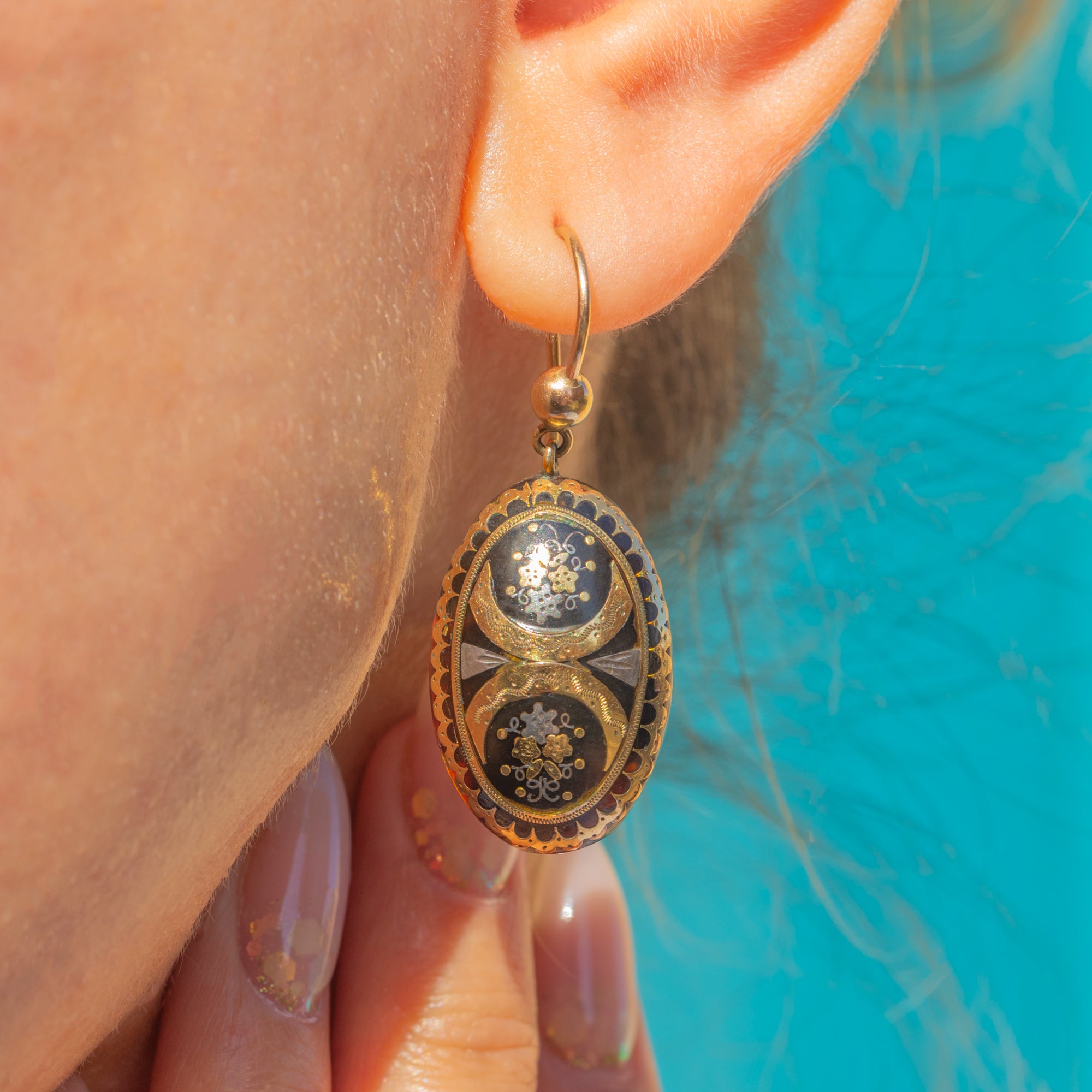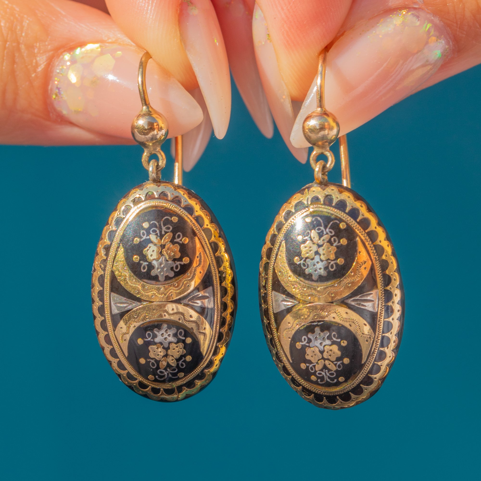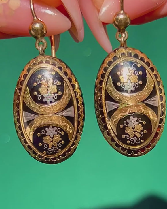 Crafted circa 1860, these rare Victorian drop earrings are a superb example of Piqué jewellery. Each oval drop features intricate Gold and Silver inlays set into a glossy black background, creating a striking contrast that epitomises the refined craftsmanship of the mid-19th century.