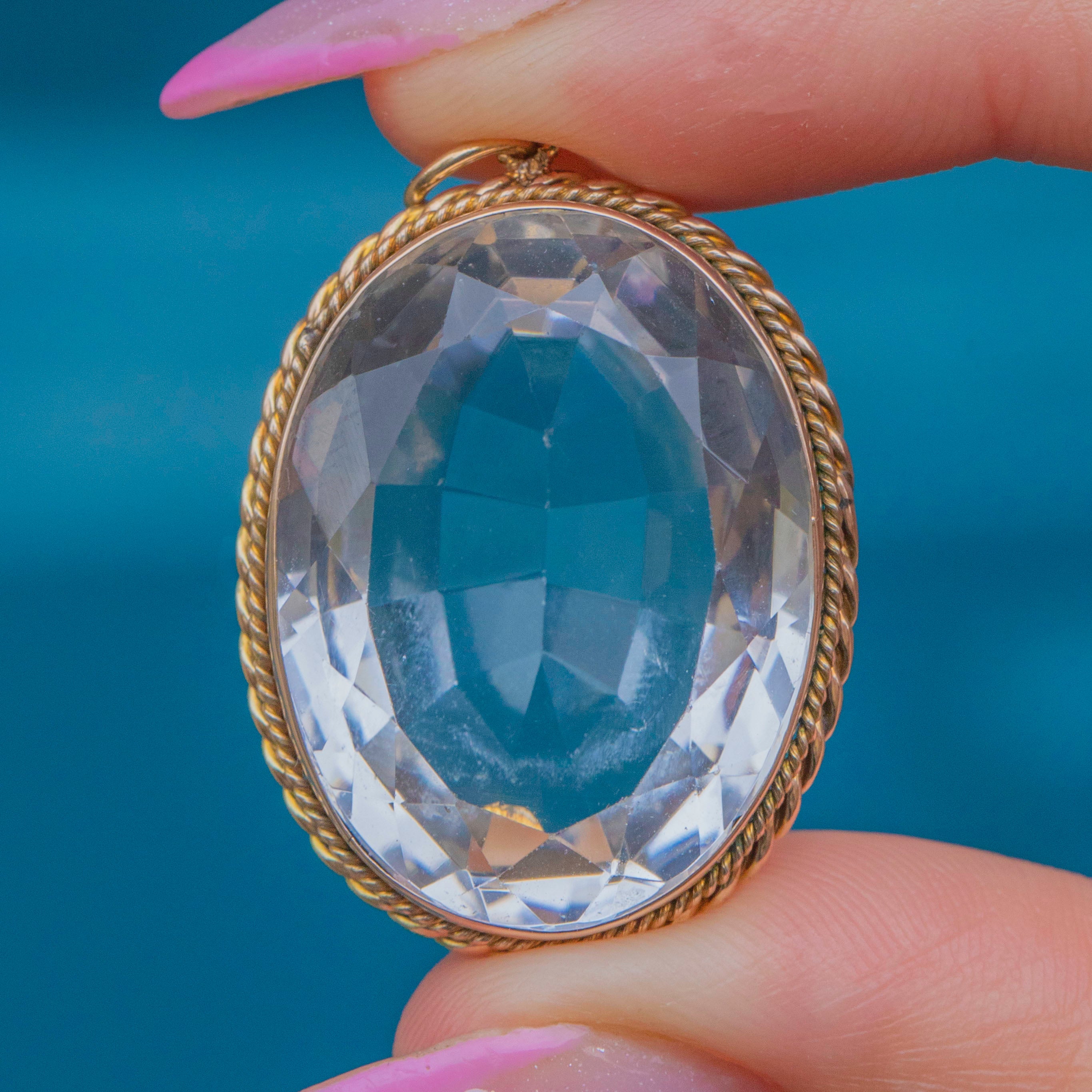 This impressive Victorian pendant features a beautifully clear 26.00ct Rock Crystal, expertly cut to catch and reflect the light with striking brilliance. The gemstone is securely set in a warm 9ct Gold mount, its clarity and precision faceting creating a captivating play of light from every angle.