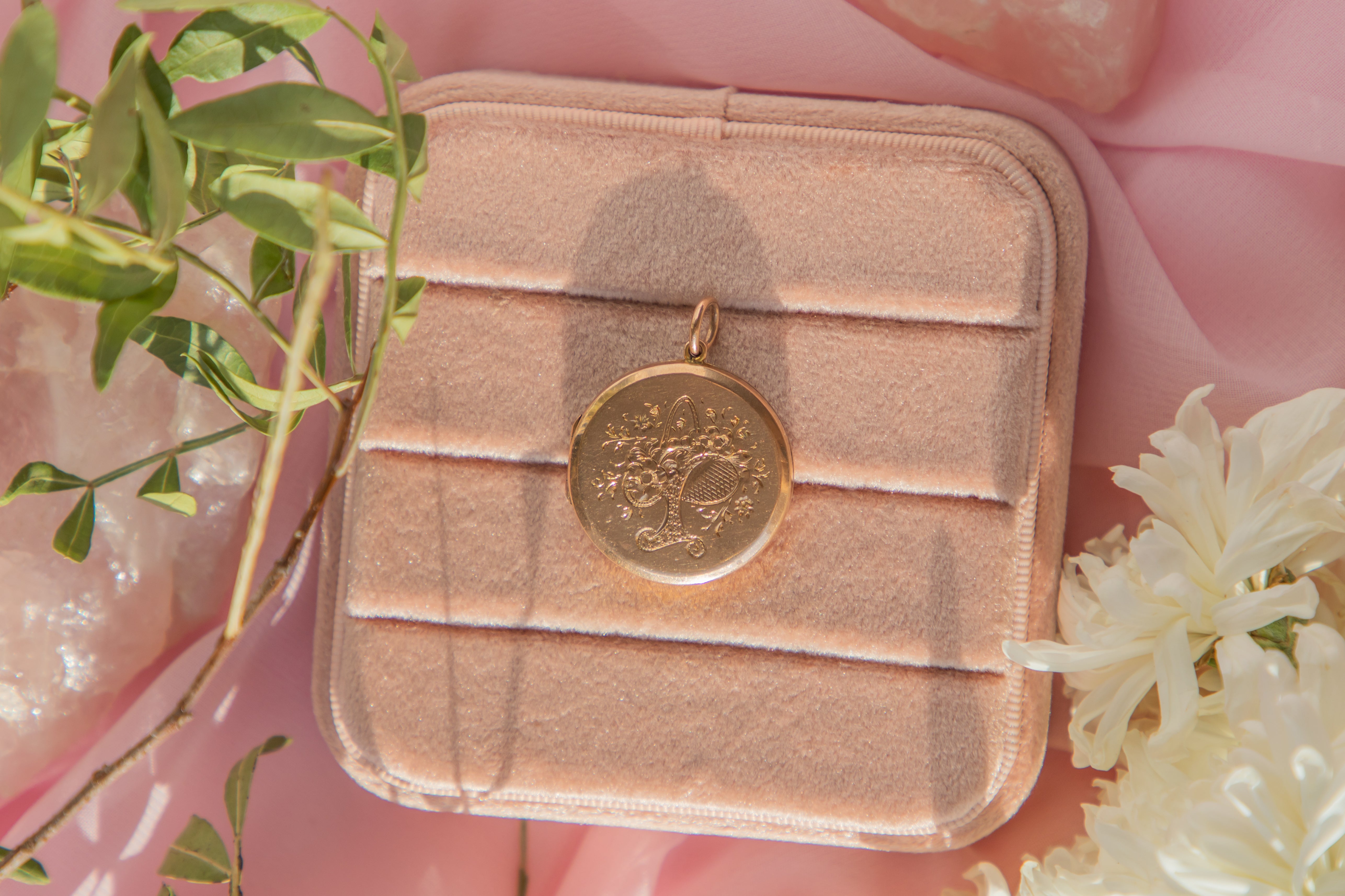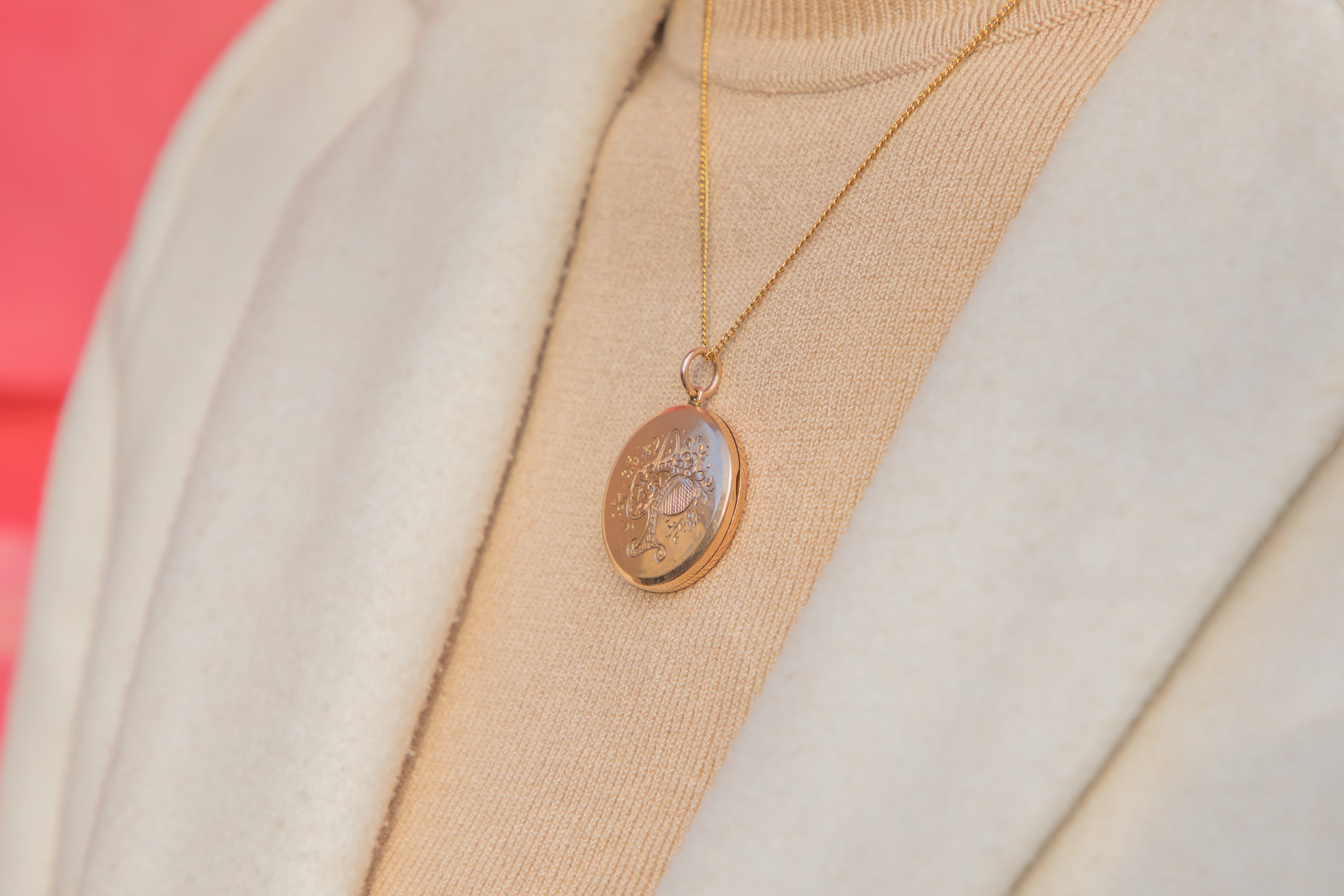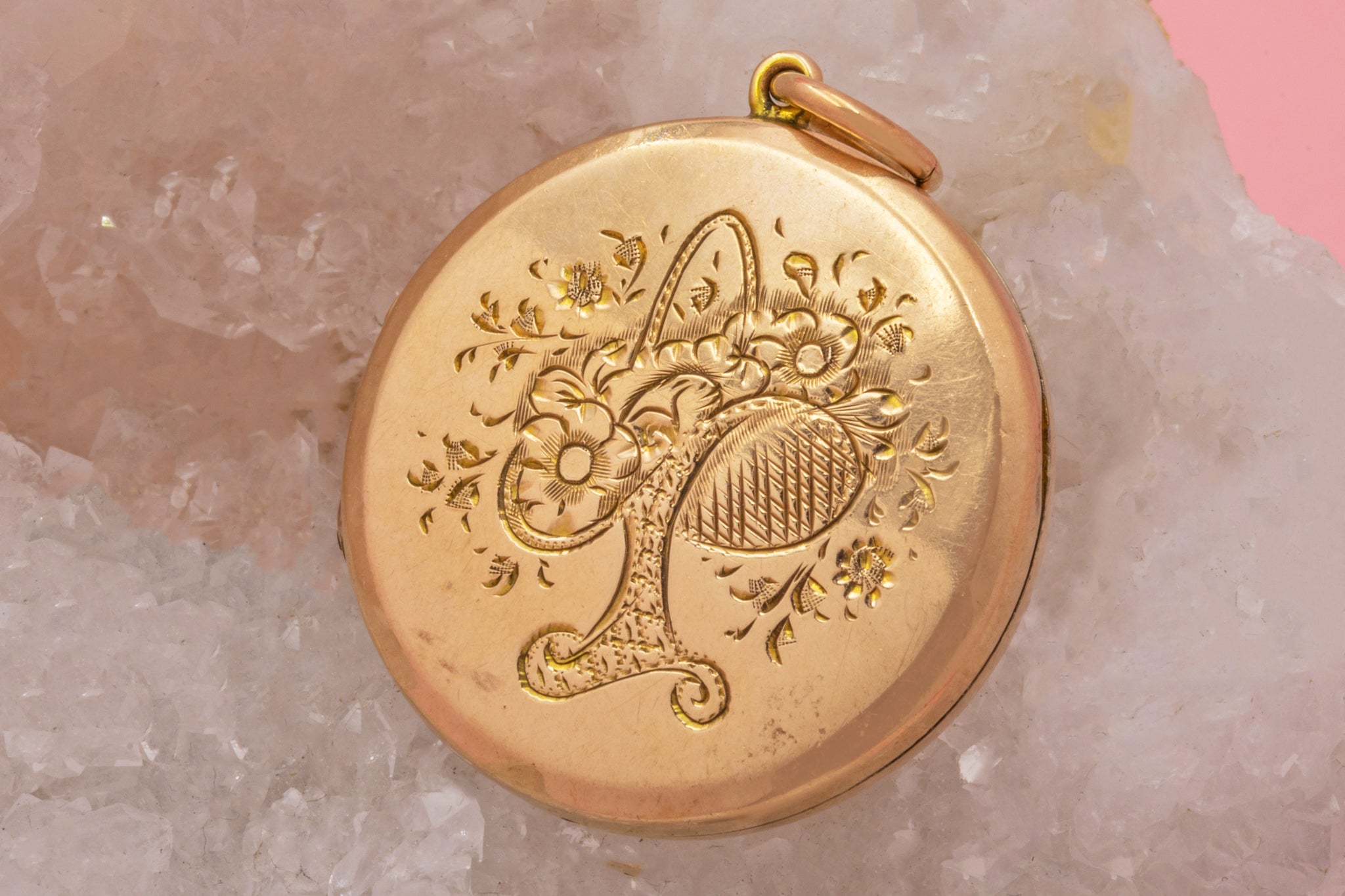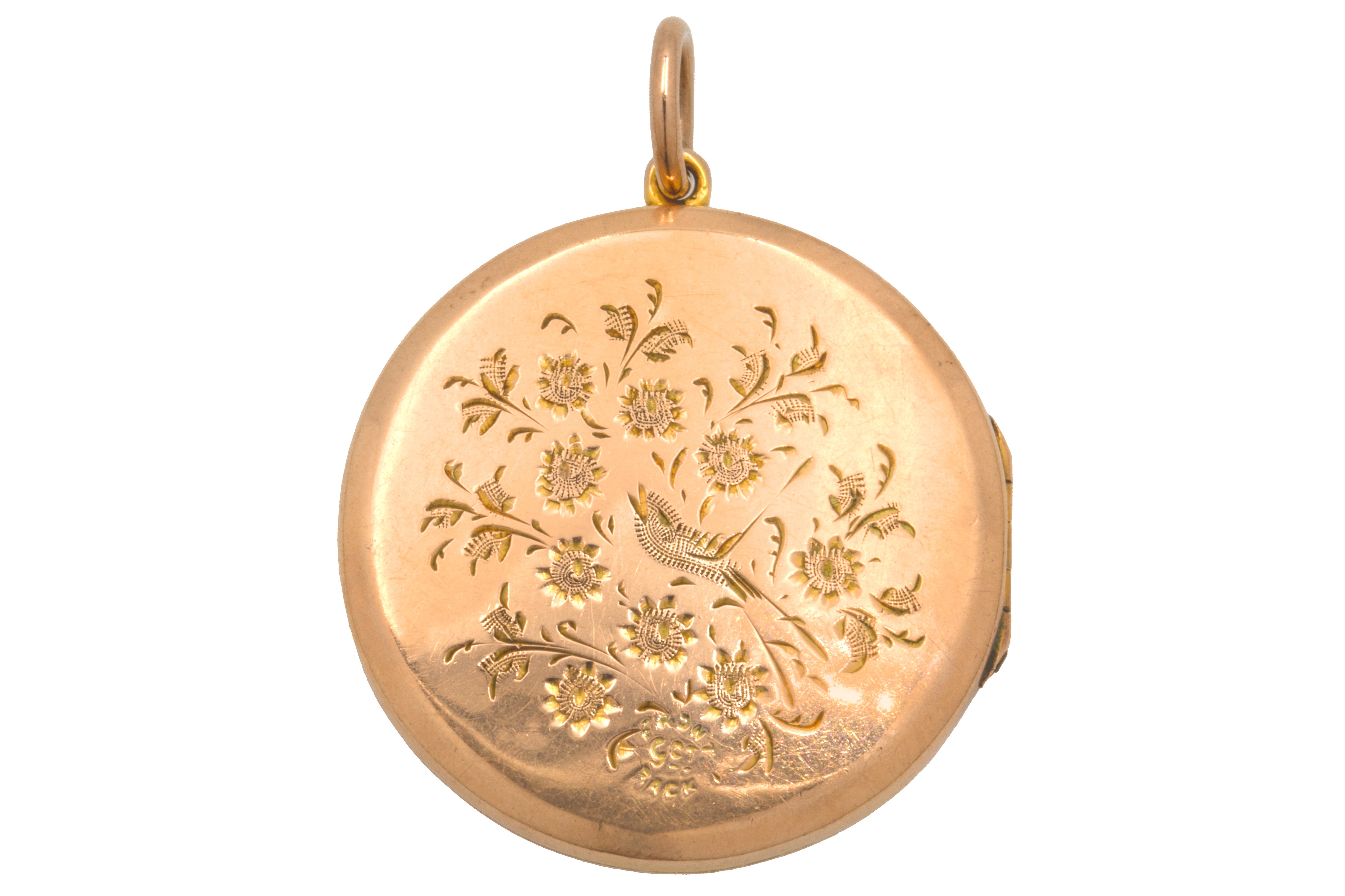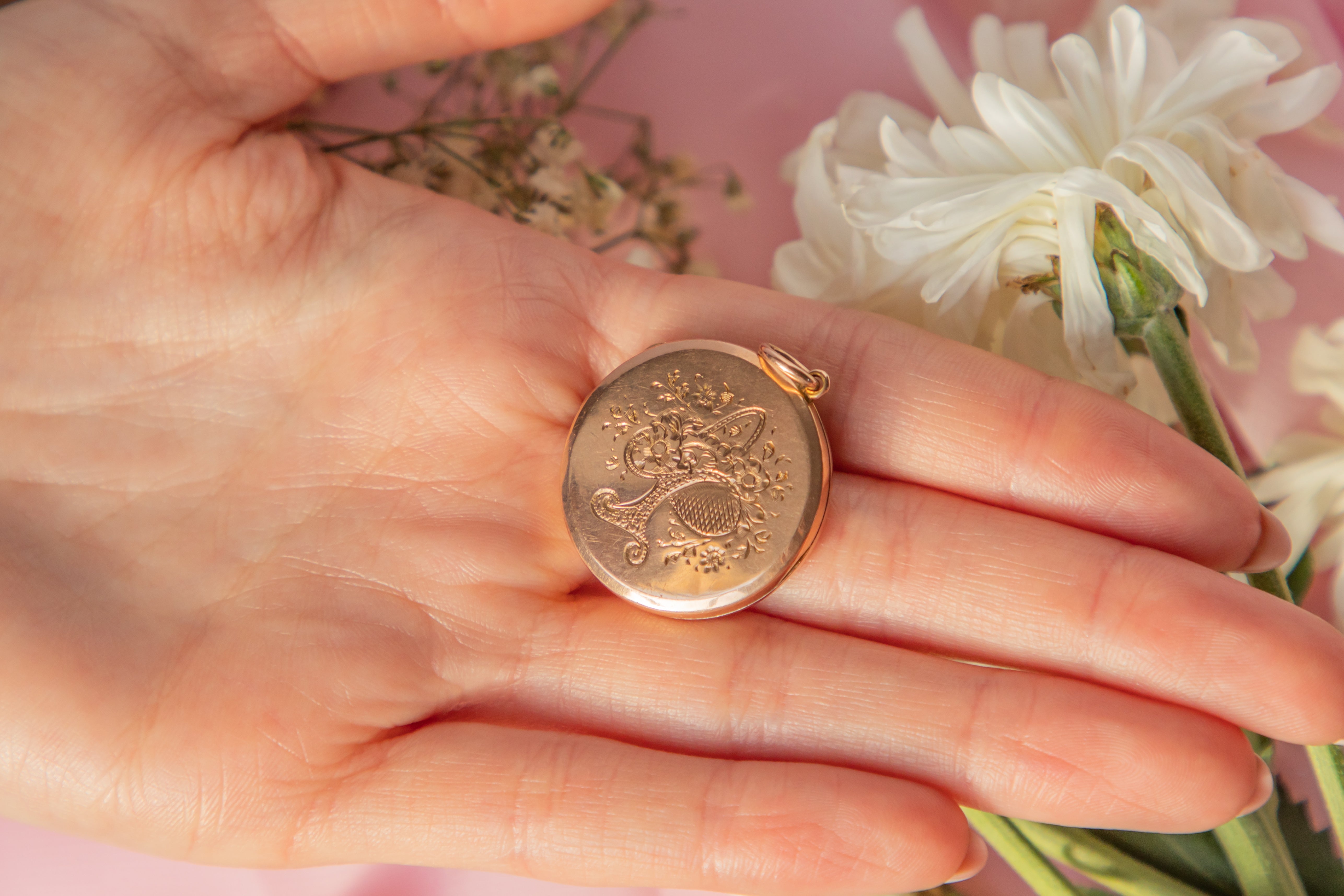 The most charming Victorian 9ct Gold round 'bouquet of flowers' locket. Beautifully engraved with sweet florals and swooping swallows, this perfectly round locket will instantly put a spring in your step.