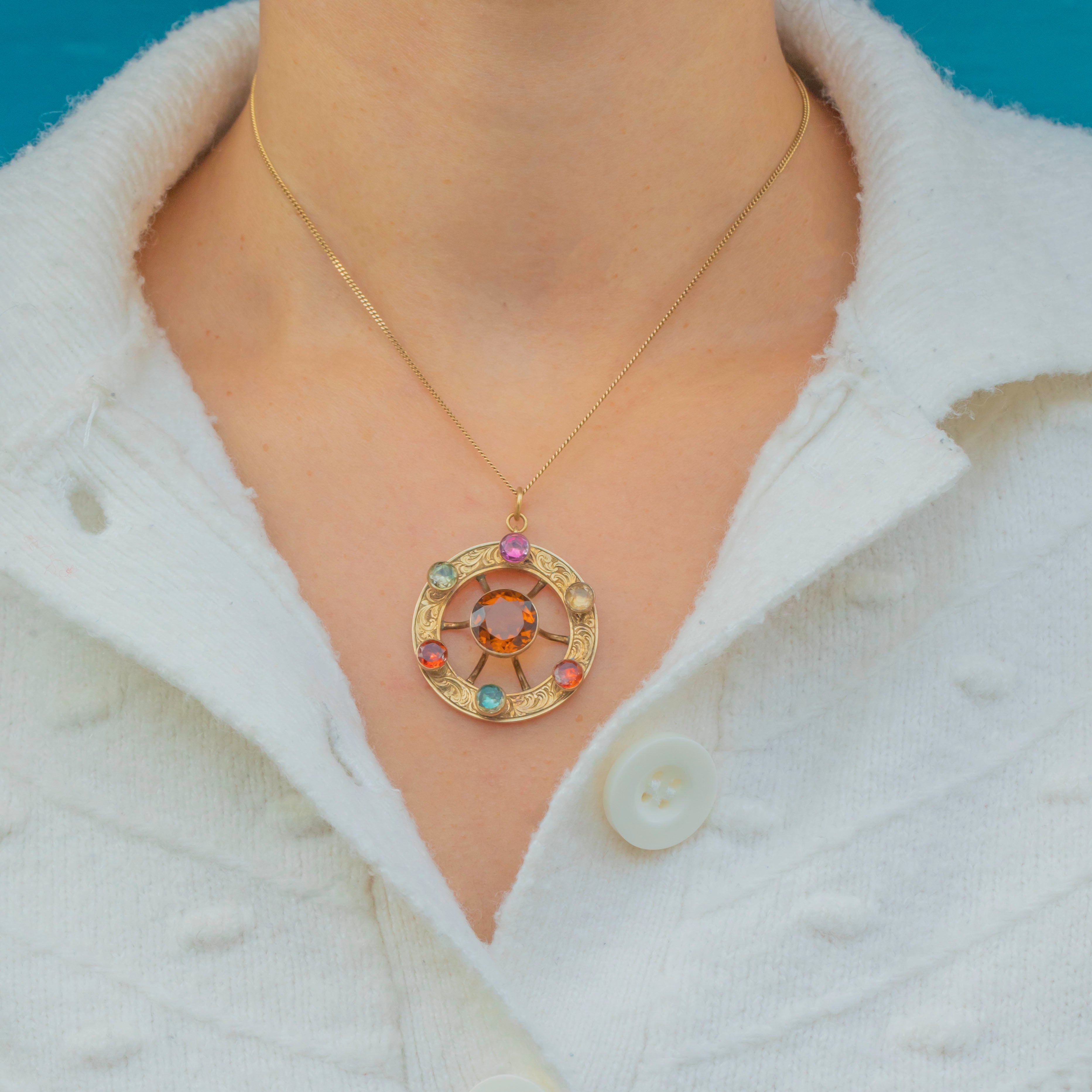 The central Citrine has a delicious marmalade hue, and the Paste gemstones add a playful pop of colour. With an engraved border finishing this antique Gold pendant off, you can't help but adore this Victorian masterpiece!
