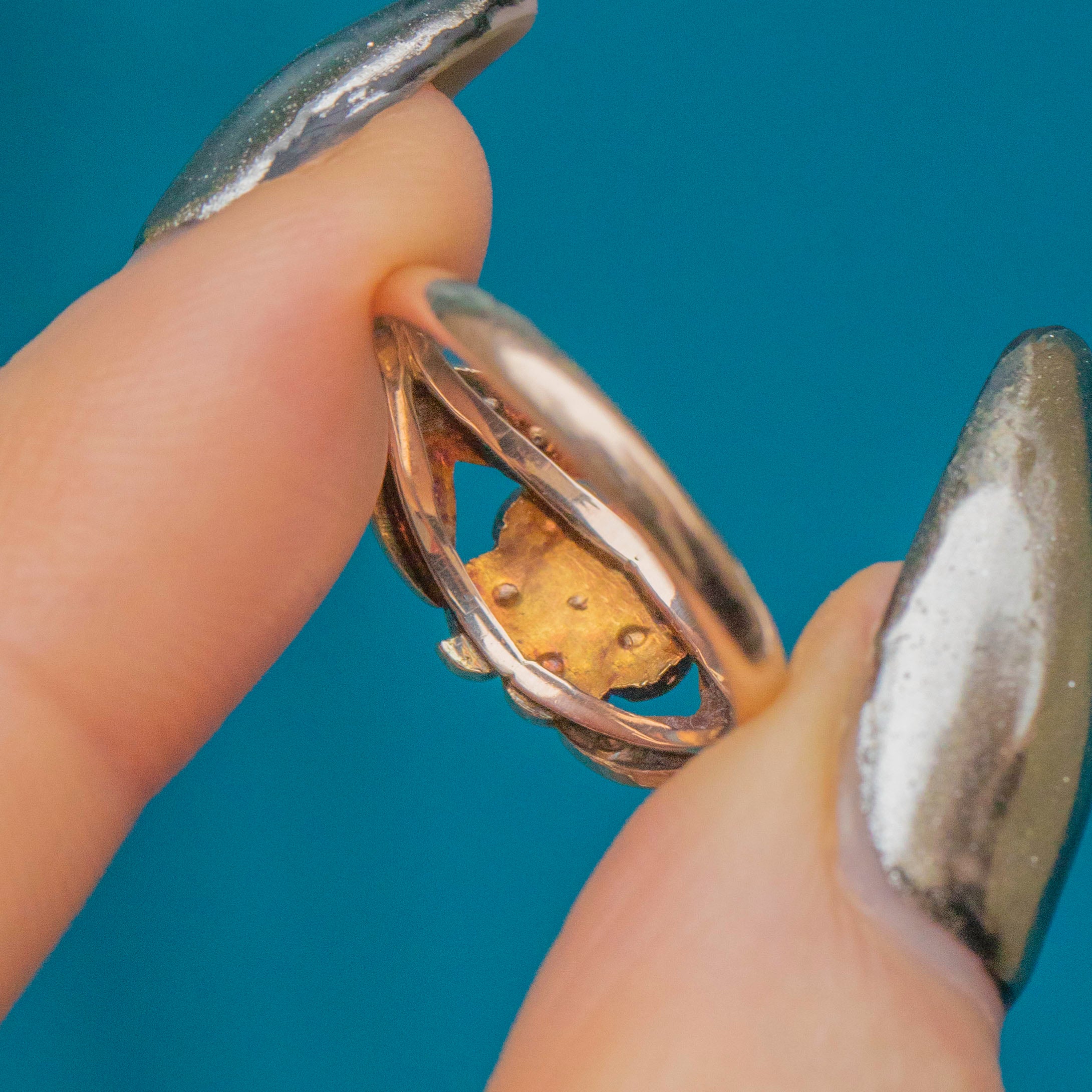 The five natural Turquoise display a gorgeous amalgamation of blues and greens, forming a dainty forget-me-not flower. Adorned by an array of seed Pearls and sitting prettily on a 9ct Gold band, this Victorian ring is pure decadence!