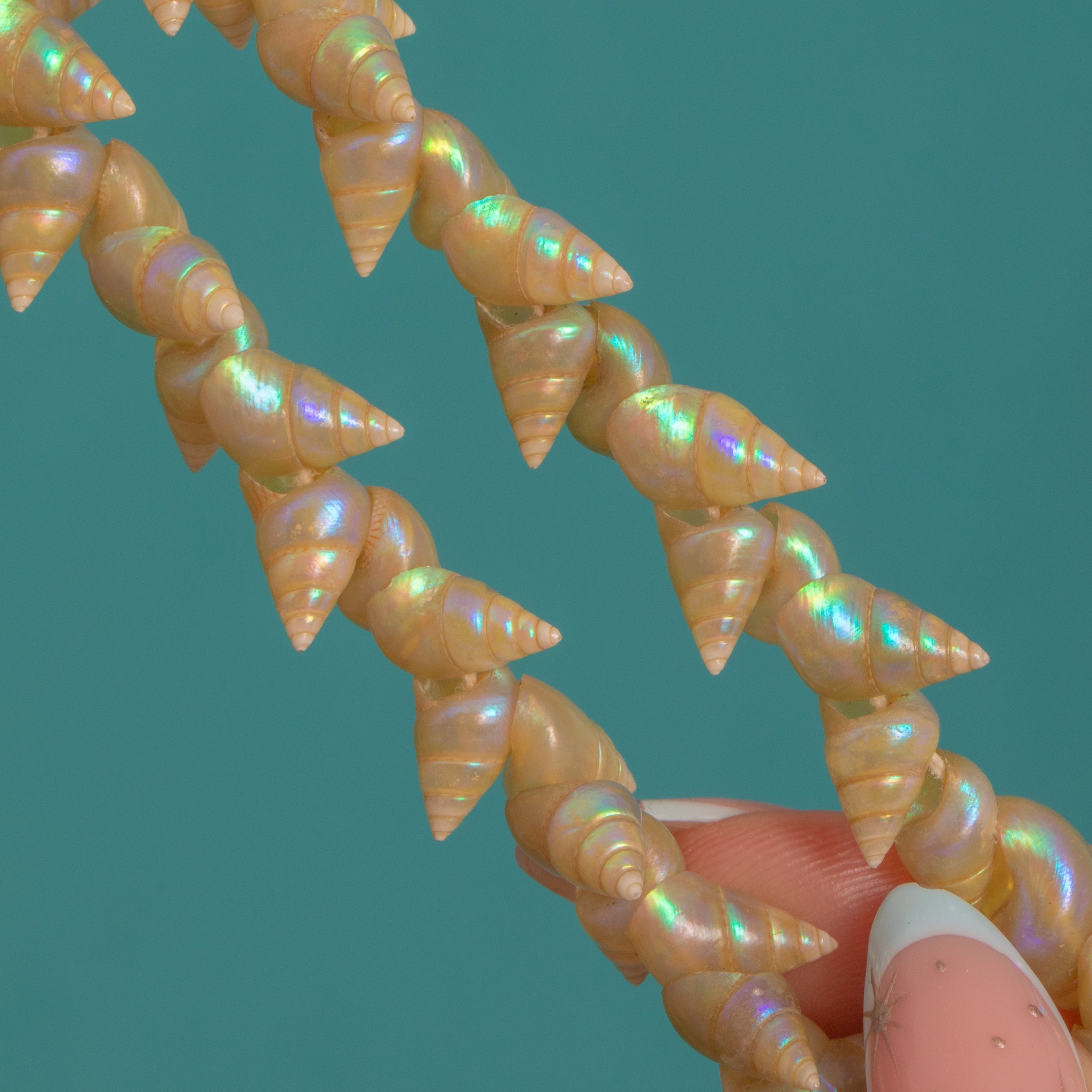 A rare Victorian Aboriginal Tasmanian Maireener shell necklace, shimmering with the oceanic iridescence these treasured shells are known for. Closely strung, tapered spiral beads glow with pearly champagne tones lit by flashes of blue, lilac and electric green, creating a dense, tactile texture that feels wonderfully organic and beach-inspired.