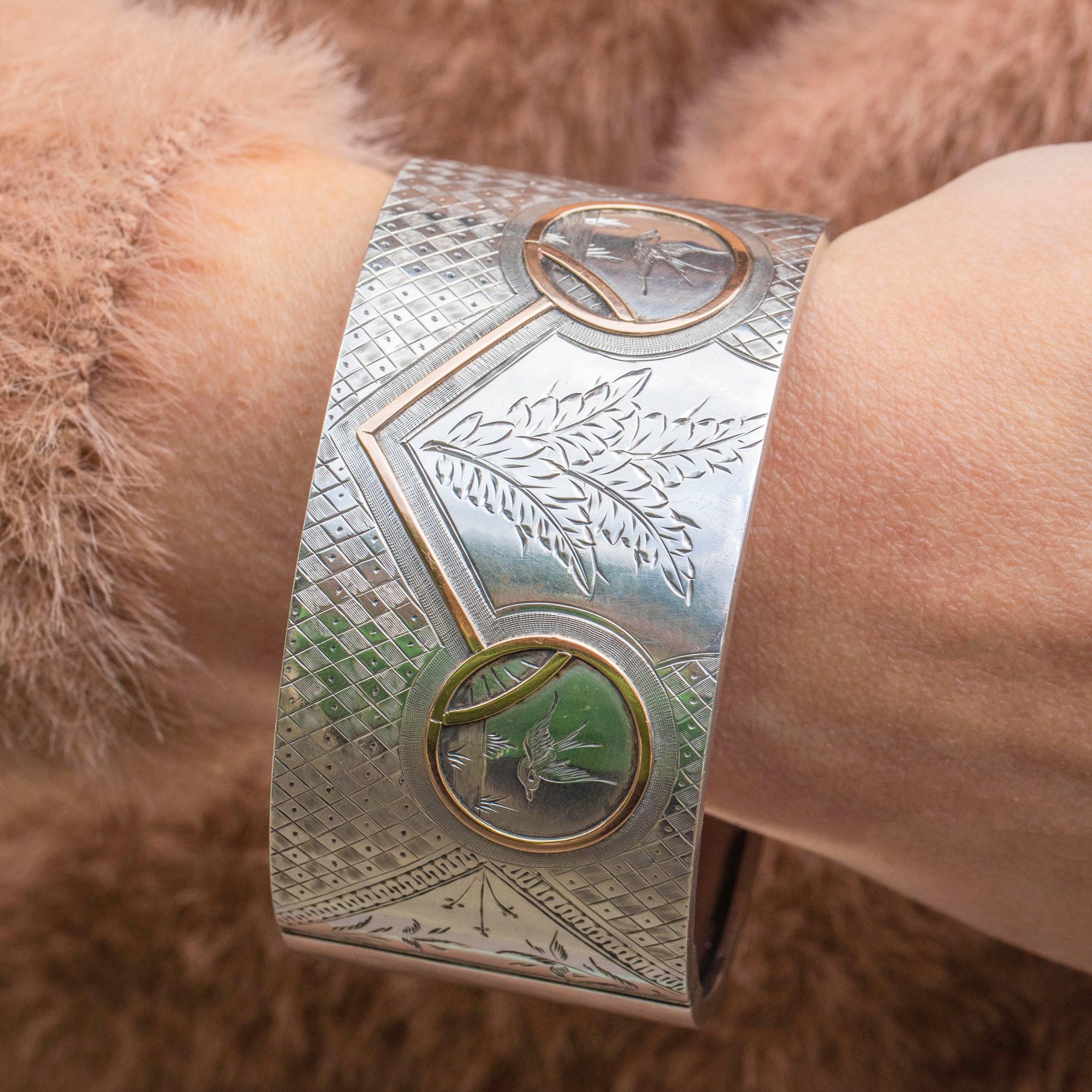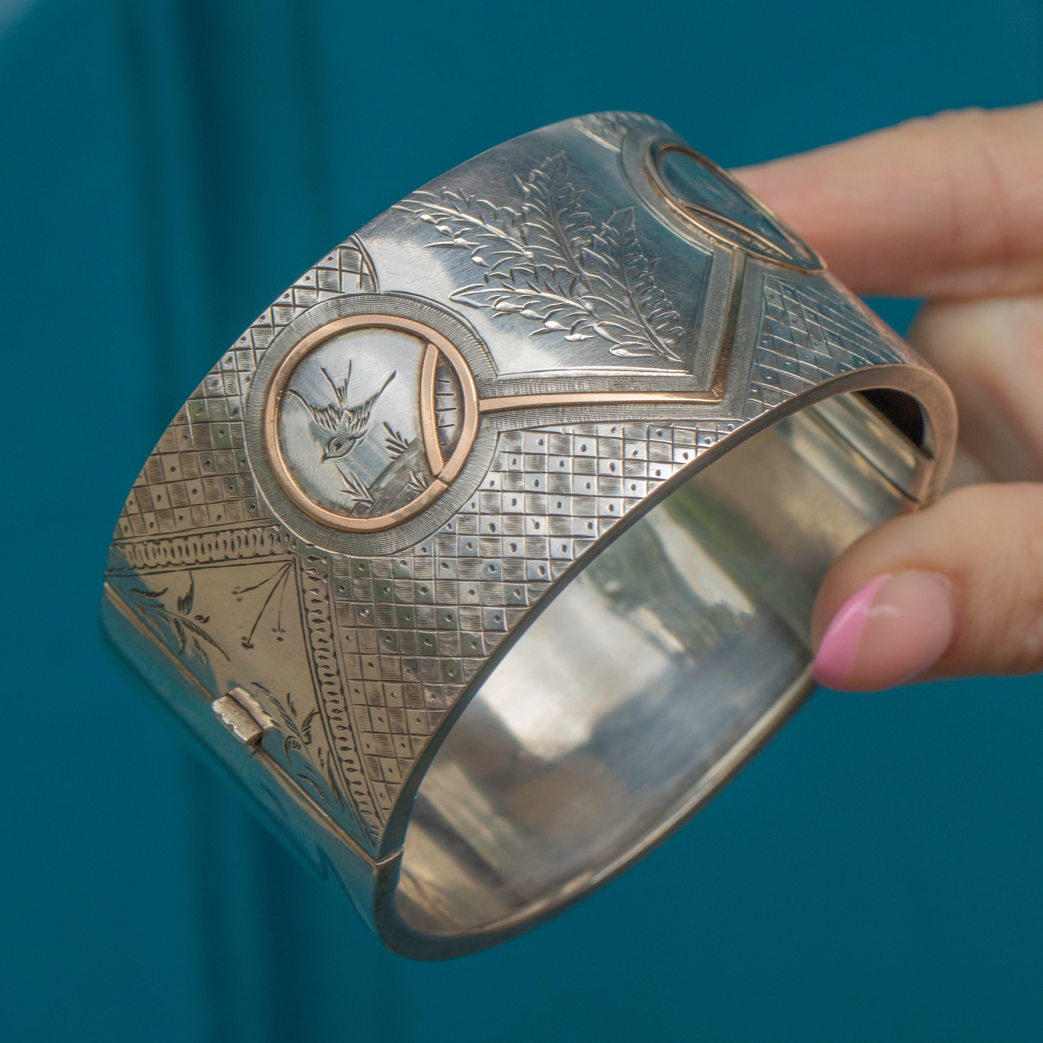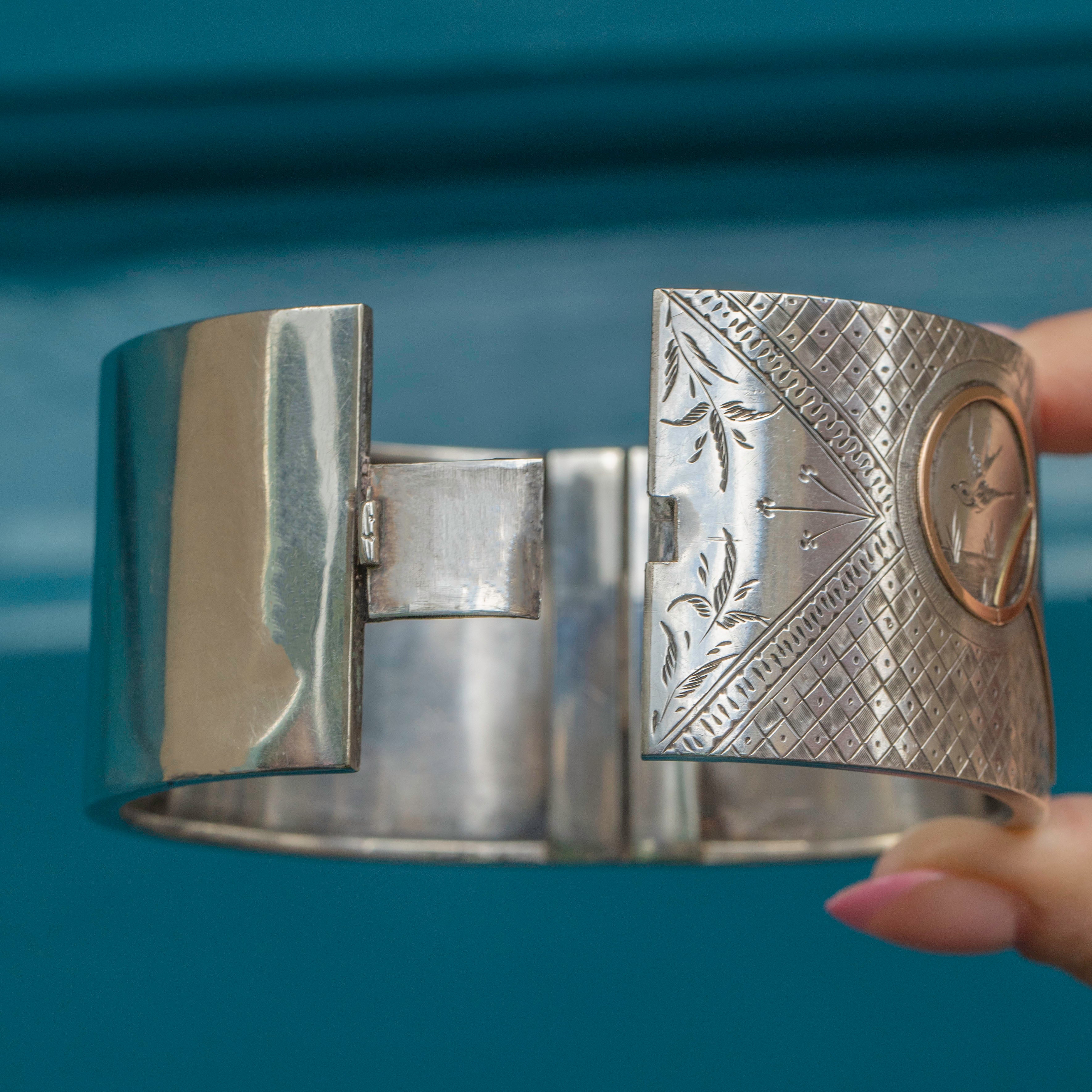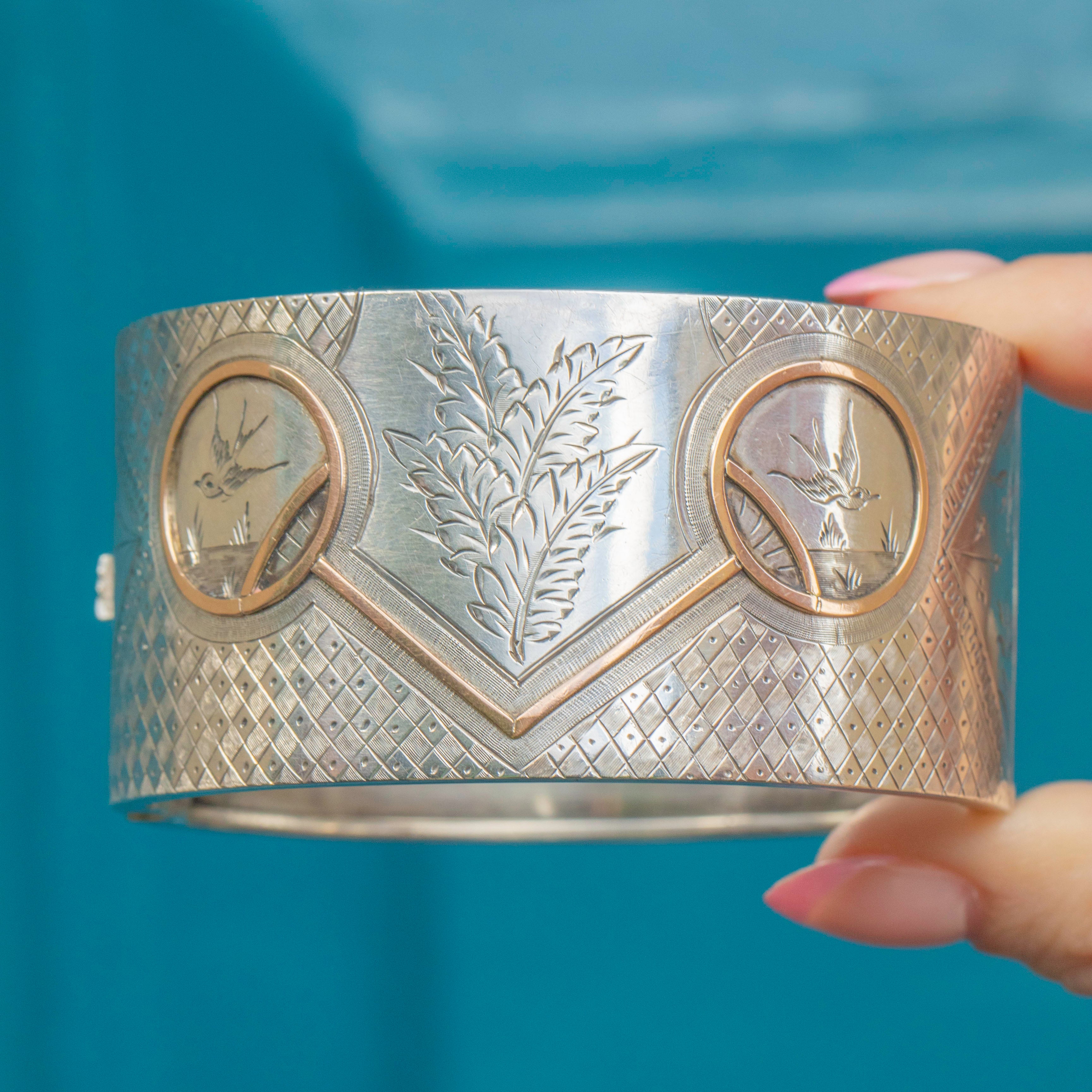 Victorian Aesthetic Bird Motif Cuff Bangle - Silver & 9ct Gold