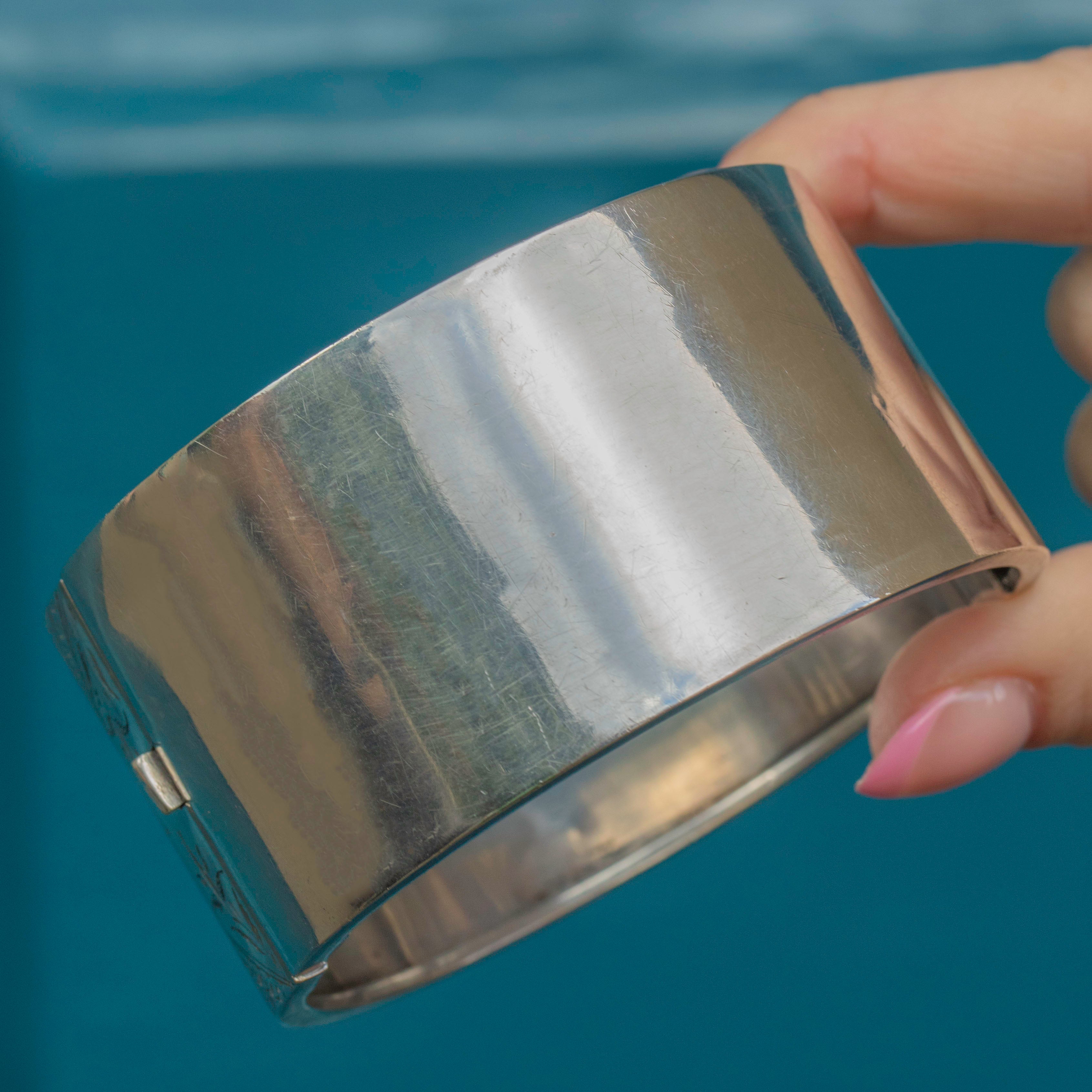 VERY GOOD. This Victorian Aesthetic bird motif cuff bangle is in lovely condition throughout. Her beautifully engraved birds and foliage engravings stand out wonderfully from her lustrous Sterling Silver, with no signs of wear. There are some signs of wear to the inside of her bangle but this cannot be seen when worn. The engraved details have remained crisp and clear and her clasp shuts with a satisfying 'click'.