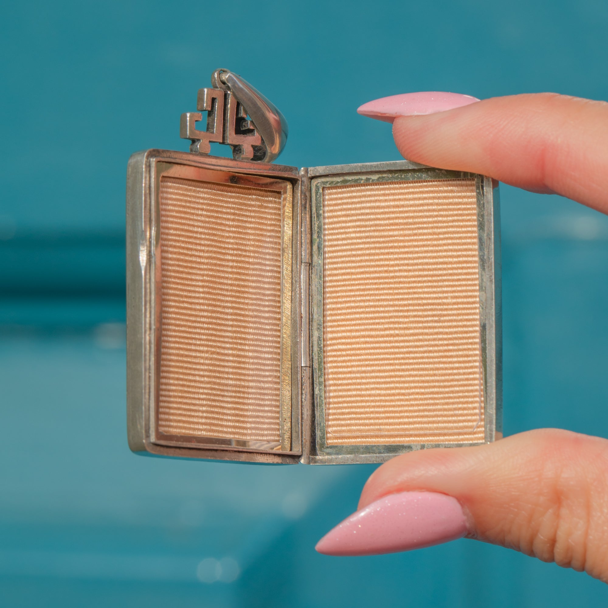 This Victorian Aesthetic Silver & 9ct Gold bird motif rectangular locket is set to become the new abode for your most cherished photographs! The bold rectangular form of this antique locket has been crafted from bright Silver, and finely engraved with a wildlife scene enhanced by a light patina that's accrued within the details.