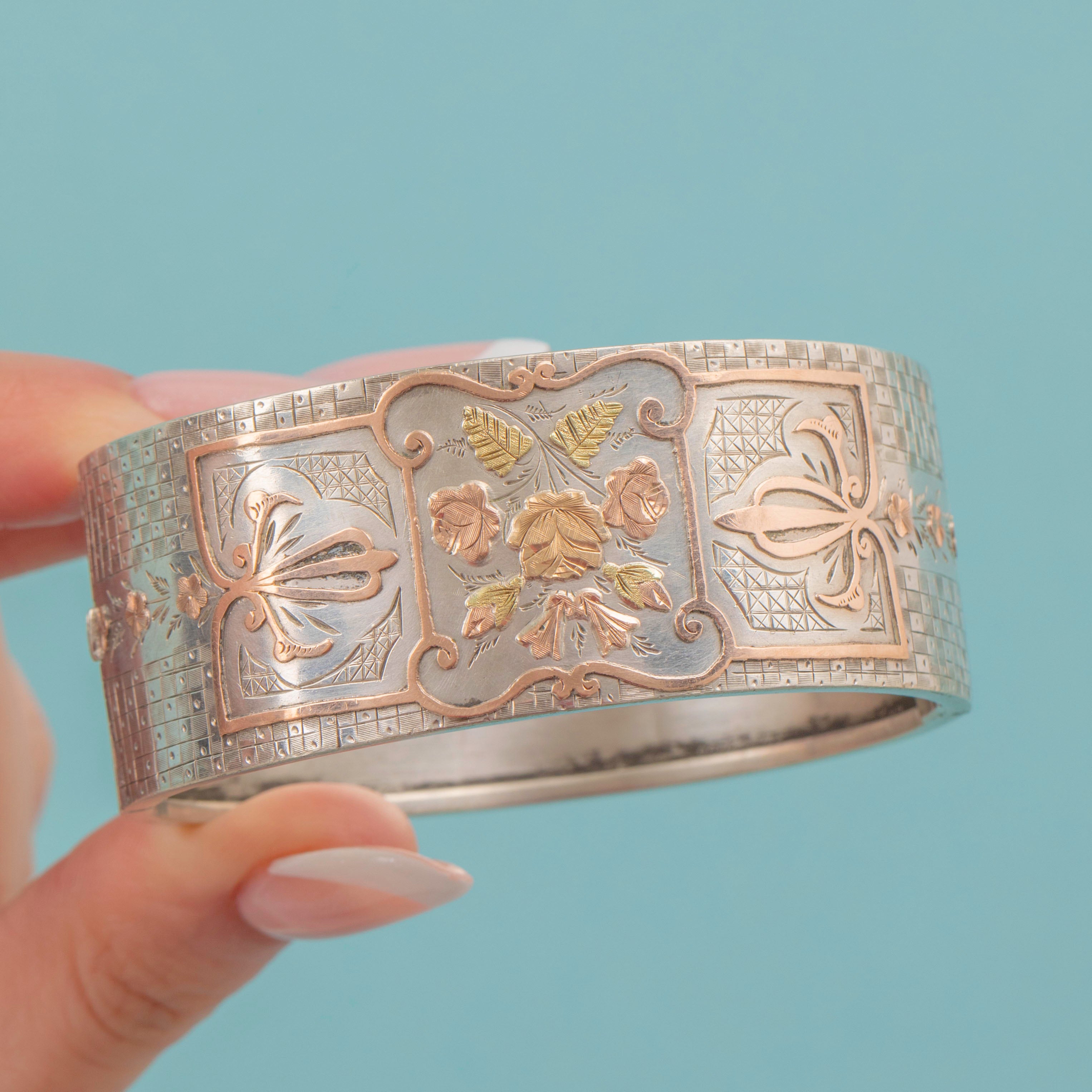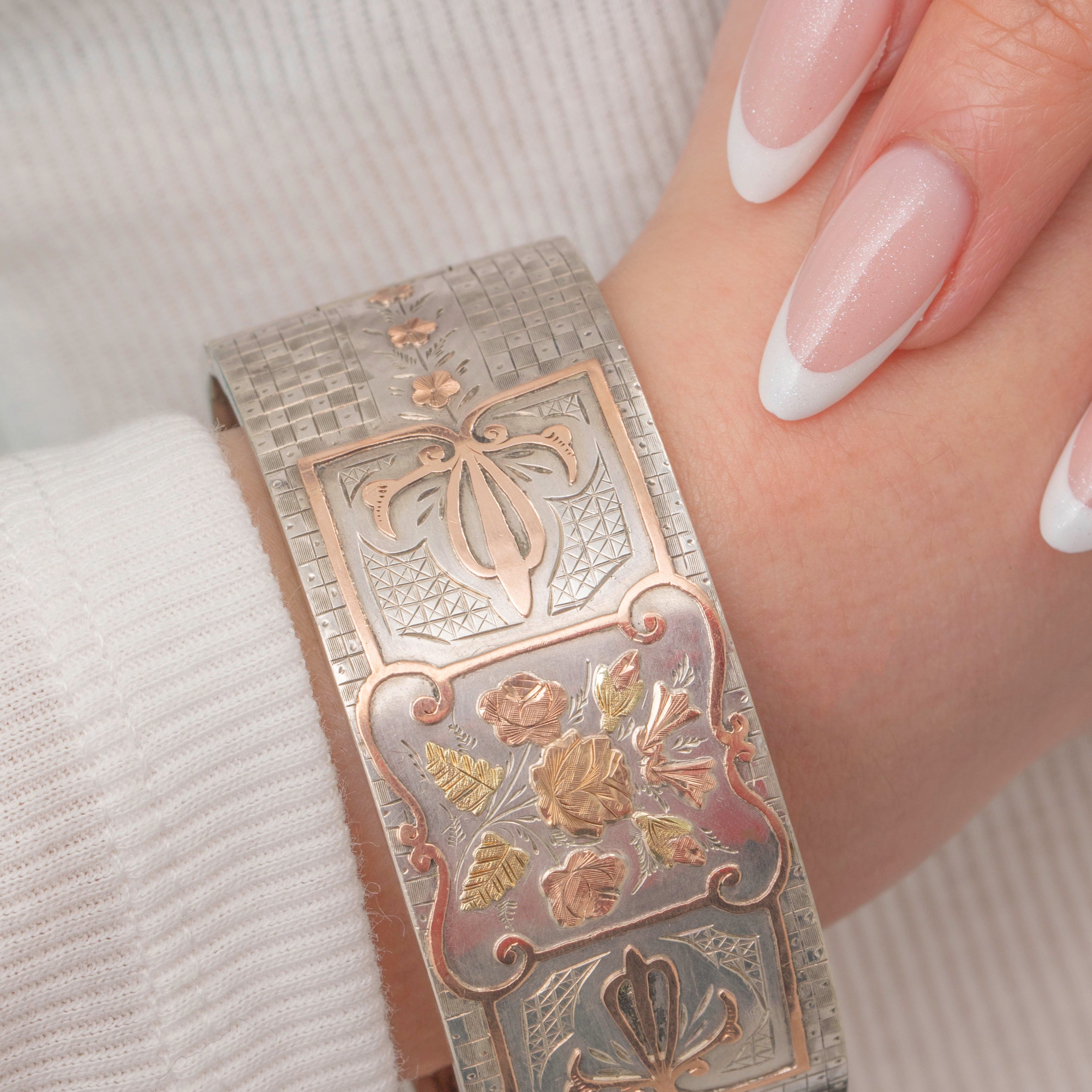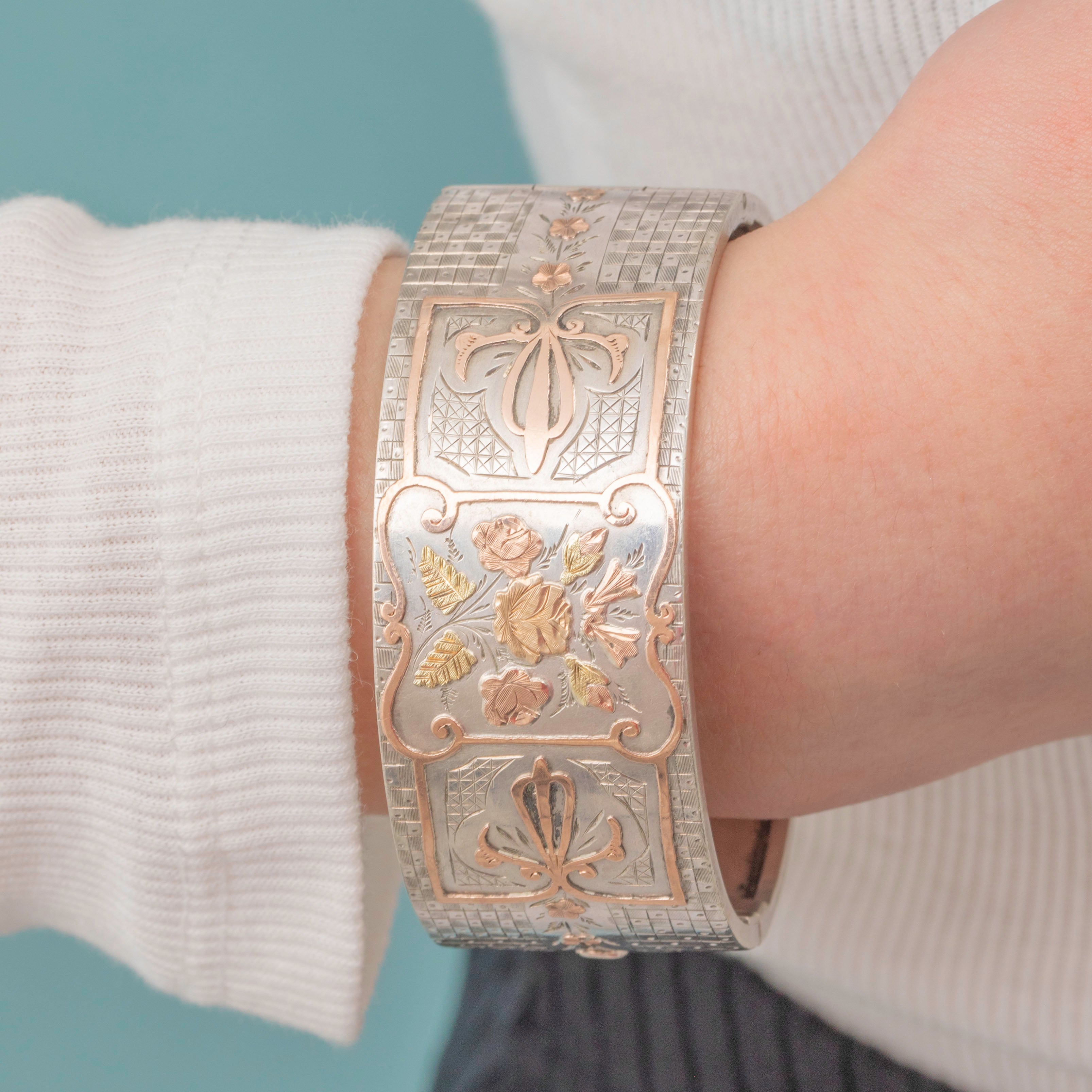 VERY GOOD: This Victorian Aesthetic Silver & 9ct Gold floral engraved bangle is in lovely condition throughout. Her Rose Gold roses with Yellow Gold leaves stand out wonderfully from her lustrous Sterling Silver, with no signs of wear to note. There are some signs of wear on the inside of the bangle and a few dings on the back, but these cannot be seen when worn. Each engraving has also remained crisp and clear. Her clasp shuts with a 'click', allowing you to wear this eye-catching Victorian cuff bracelet with utmost confidence!