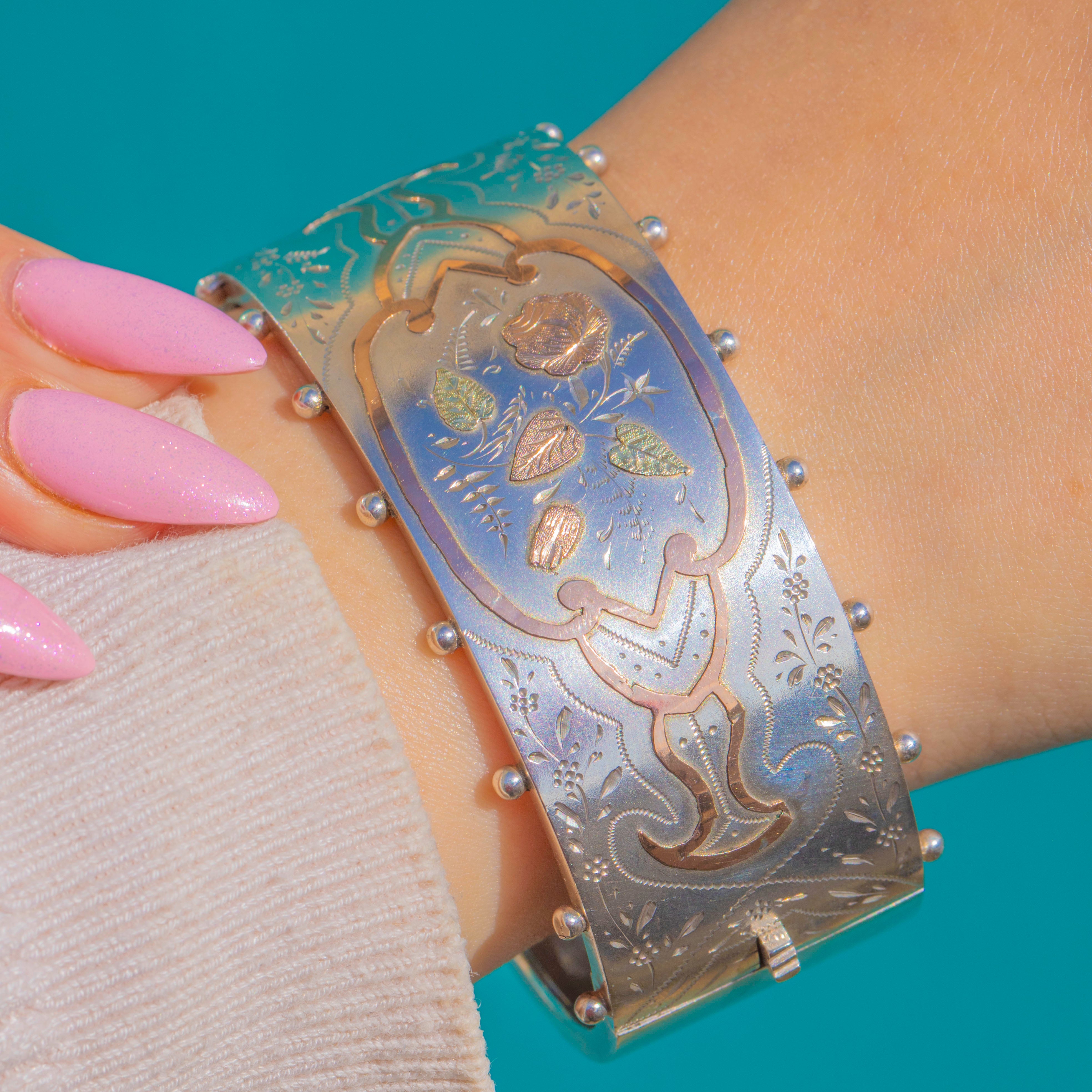 Victorian Aesthetic Silver Bangle 9ct Rose Gold & Green Gold Flowers, c.1882