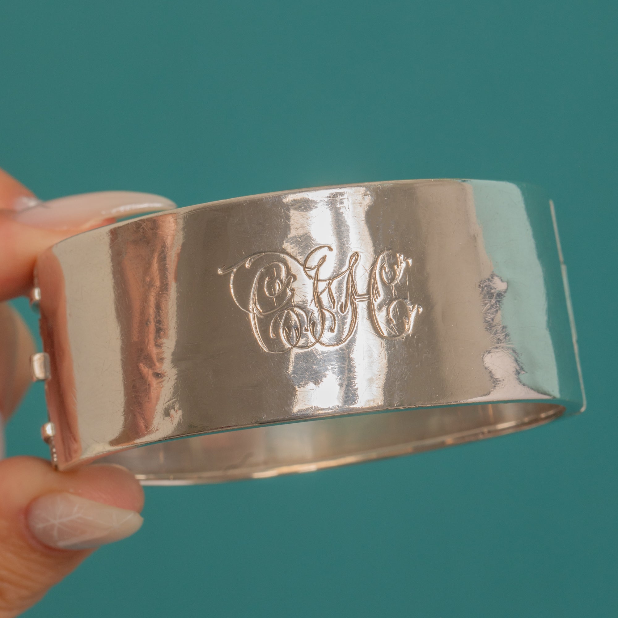 EXCELLENT: The engraving and beaded borders are sharp with a bright finish, showing only light surface wear commensurate with age. There are no gemstones; the hollow body presents cleanly with no noticeable dents, losses or repairs. Overall, the bangle has been very well cared for and retains superb detail.
