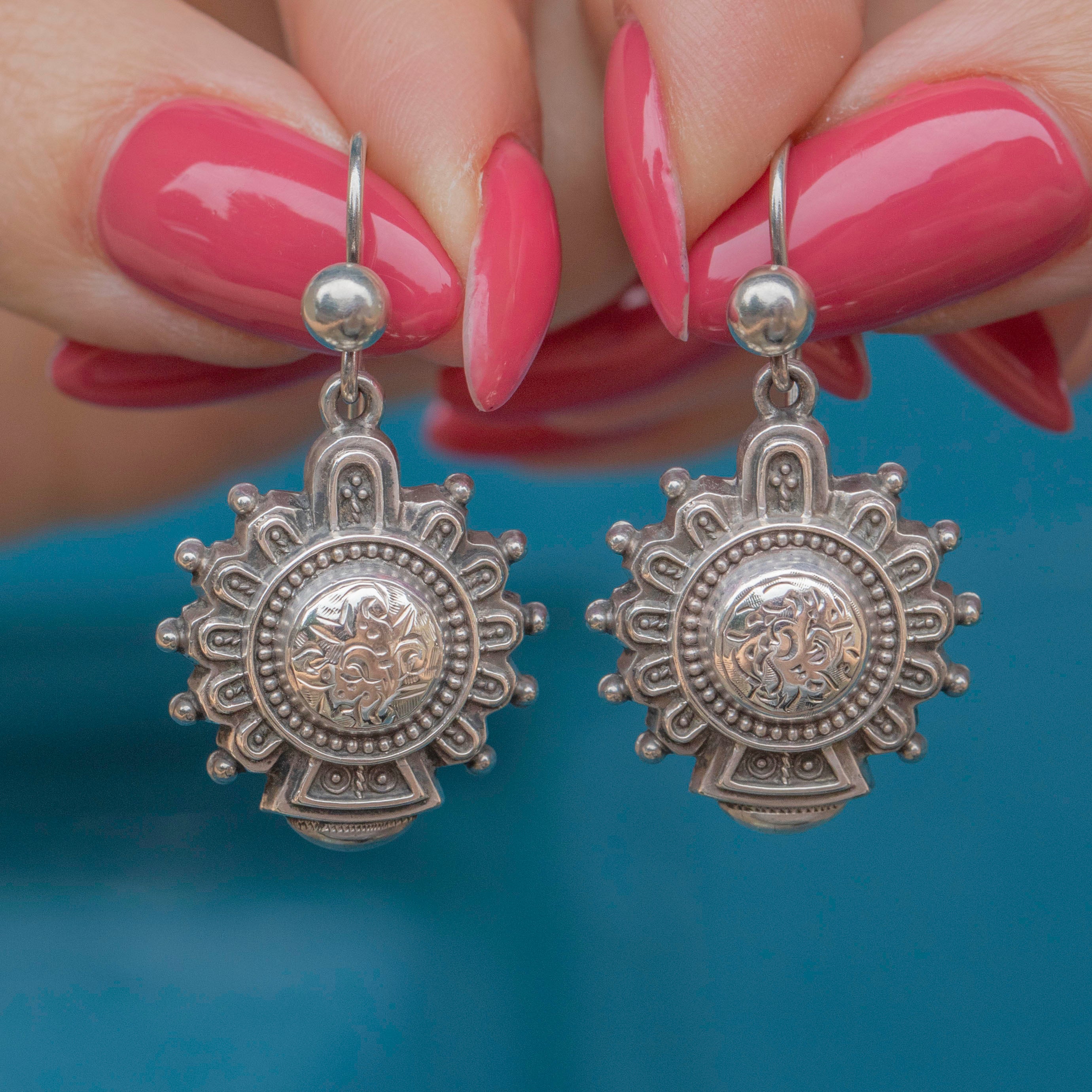 VERY GOOD. These Victorian Aesthetic Silver earrings are in very good condition. Their form is fantastic, with the detailing throughout remaining crisp and illuminated by the antique patina behind. On the back, there is some subtle wear to the Silver but nothing untoward. With secure ear hooks, you can wear these Victorian Silver earrings with the utmost confidence!