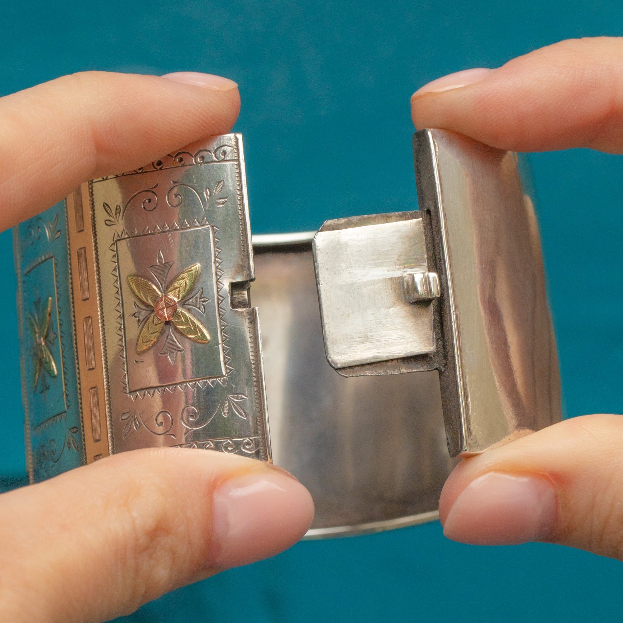 Victorian Aesthetic Silver, Rose Gold & Green Gold Bangle, c.1884