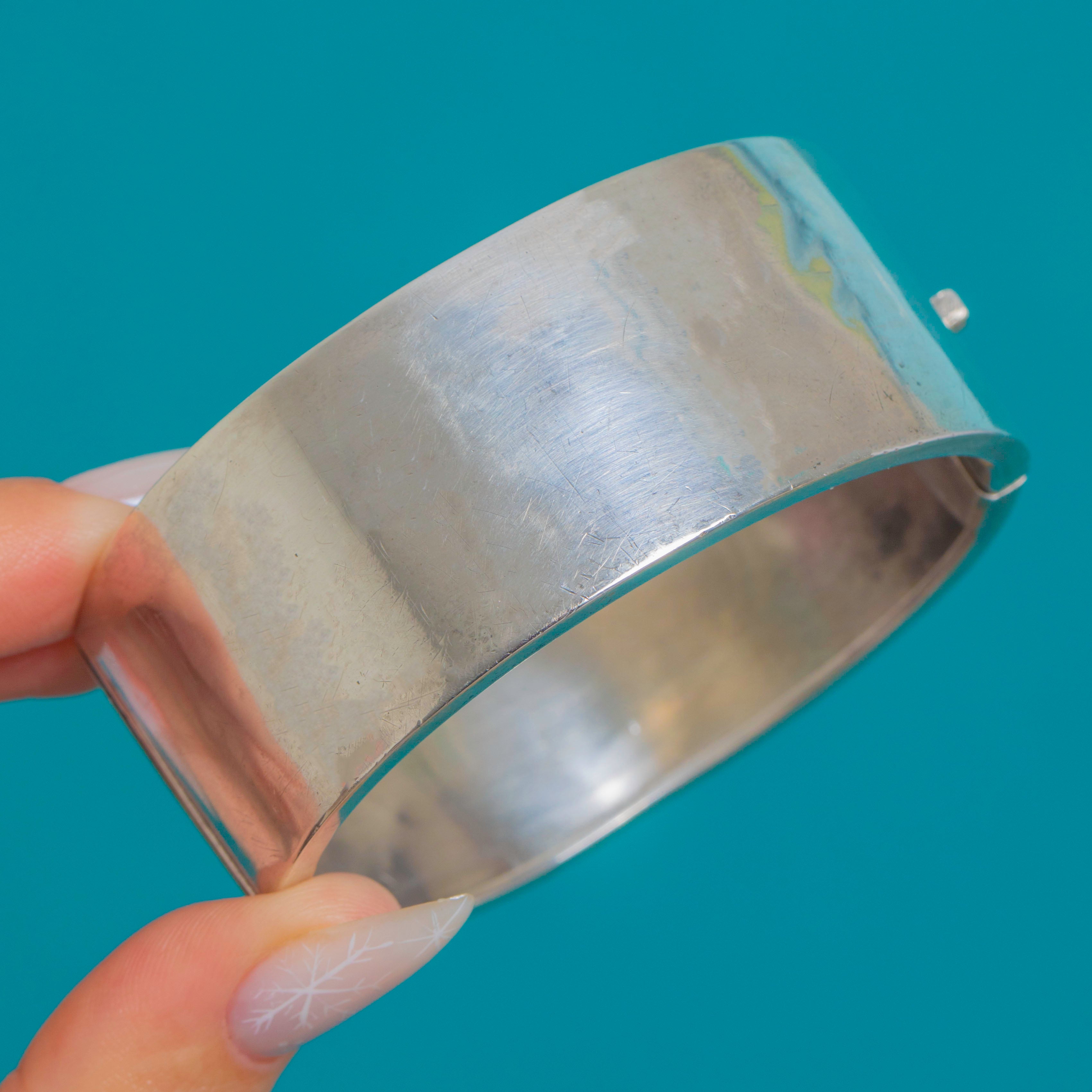 EXCELLENT: Crisp engravings with only light surface wear and a soft, even patina. The hollow-form cuff shows a few tiny pin-dents commensurate with age but no visible repairs. Hinge and box clasp are in perfect working order and close securely.