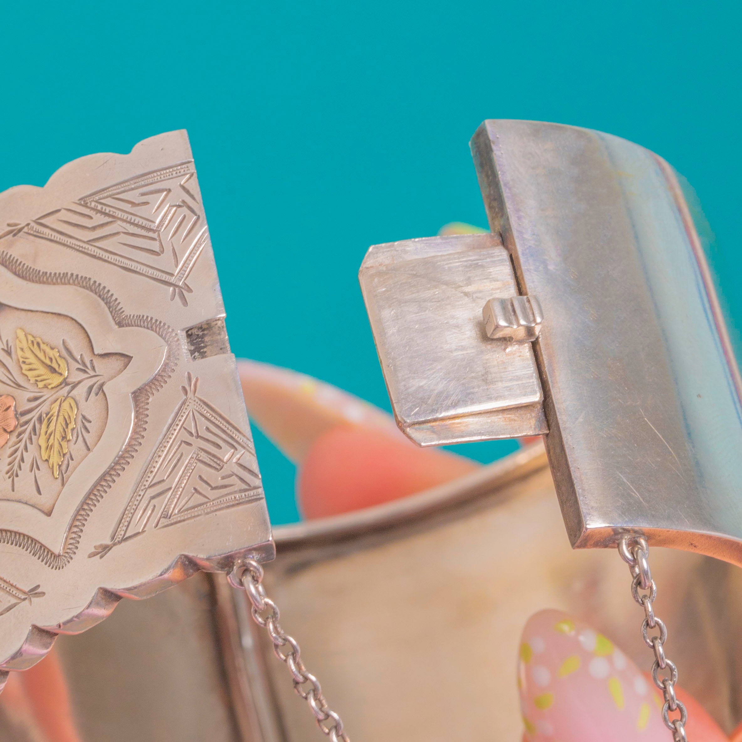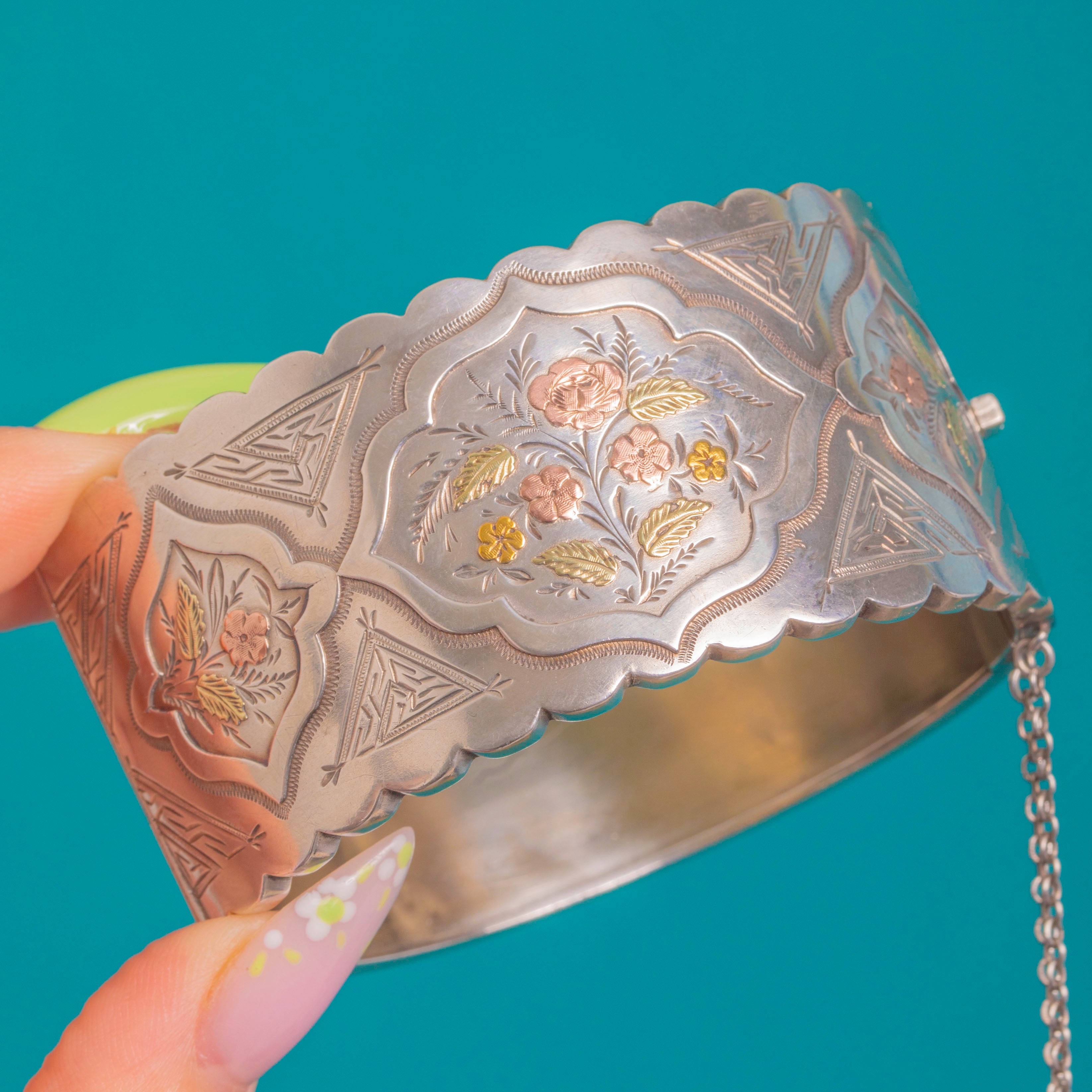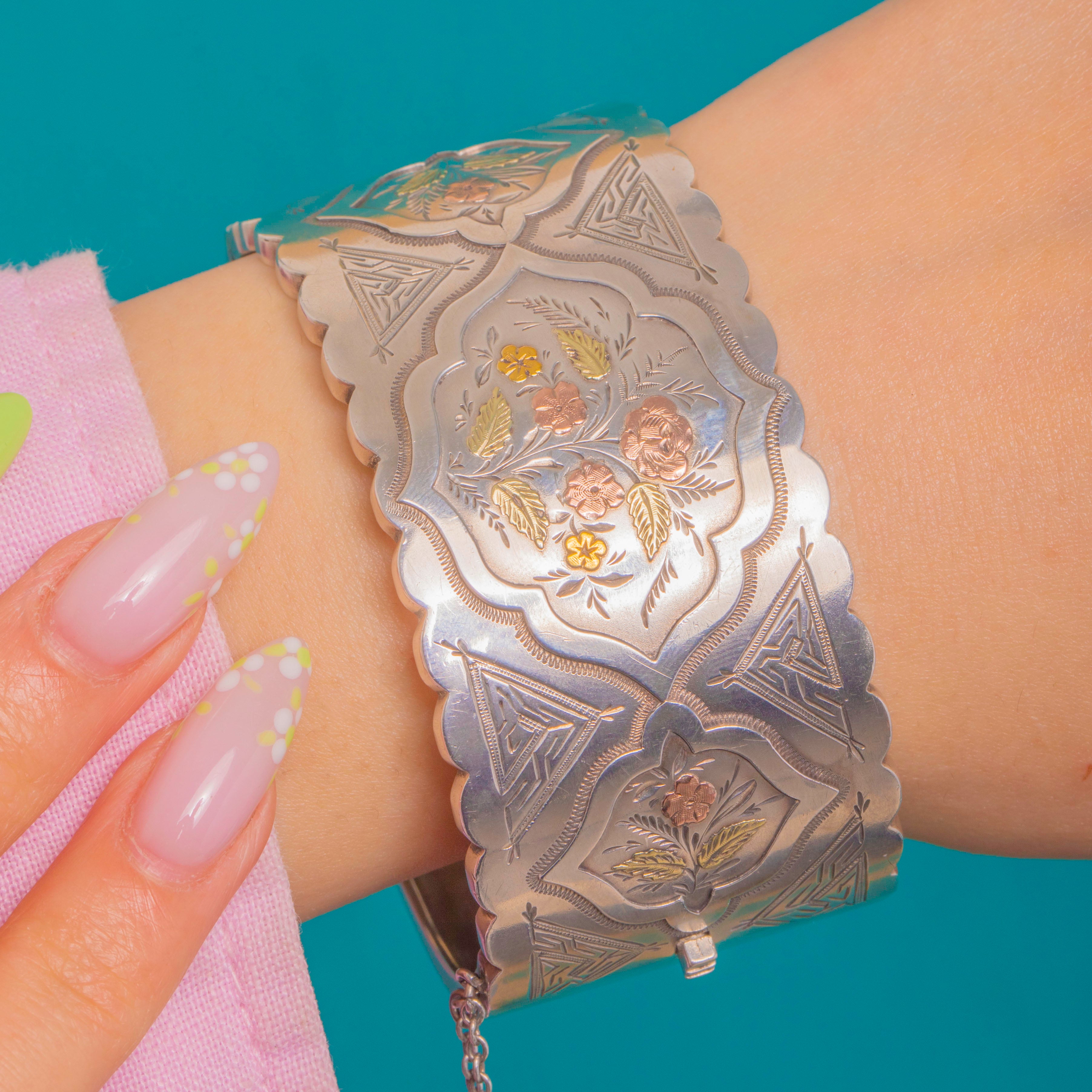 Ornate and romantic, this Victorian hinged bangle is crafted in cool Sterling Silver and richly chased with repeating panels of flowers and foliage framed by scalloped cartouches. The botanical sprays are beautifully accented with applied Rose Gold and Yellow Gold detailing, lending a soft tri-colour glow that dances across the engraved surface.