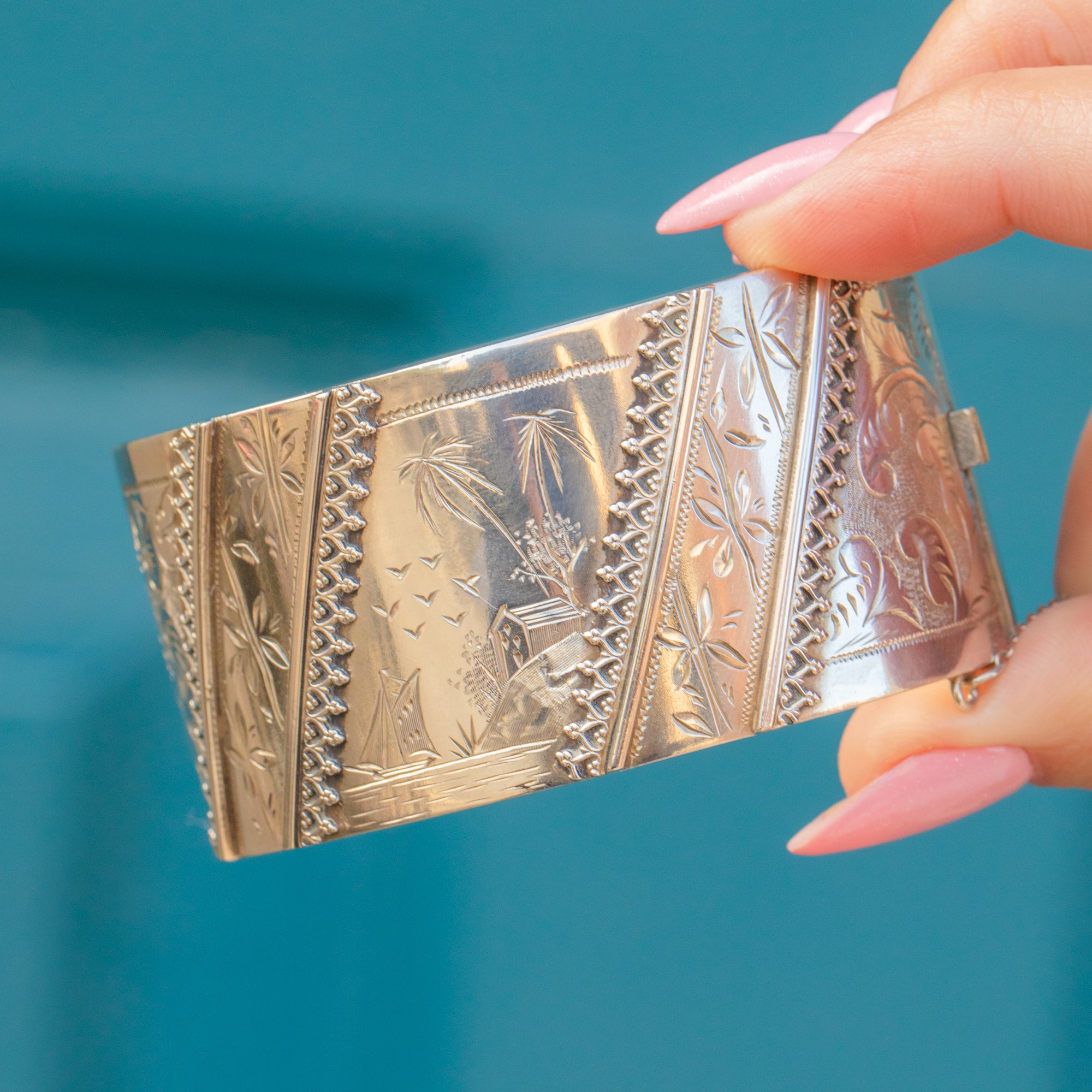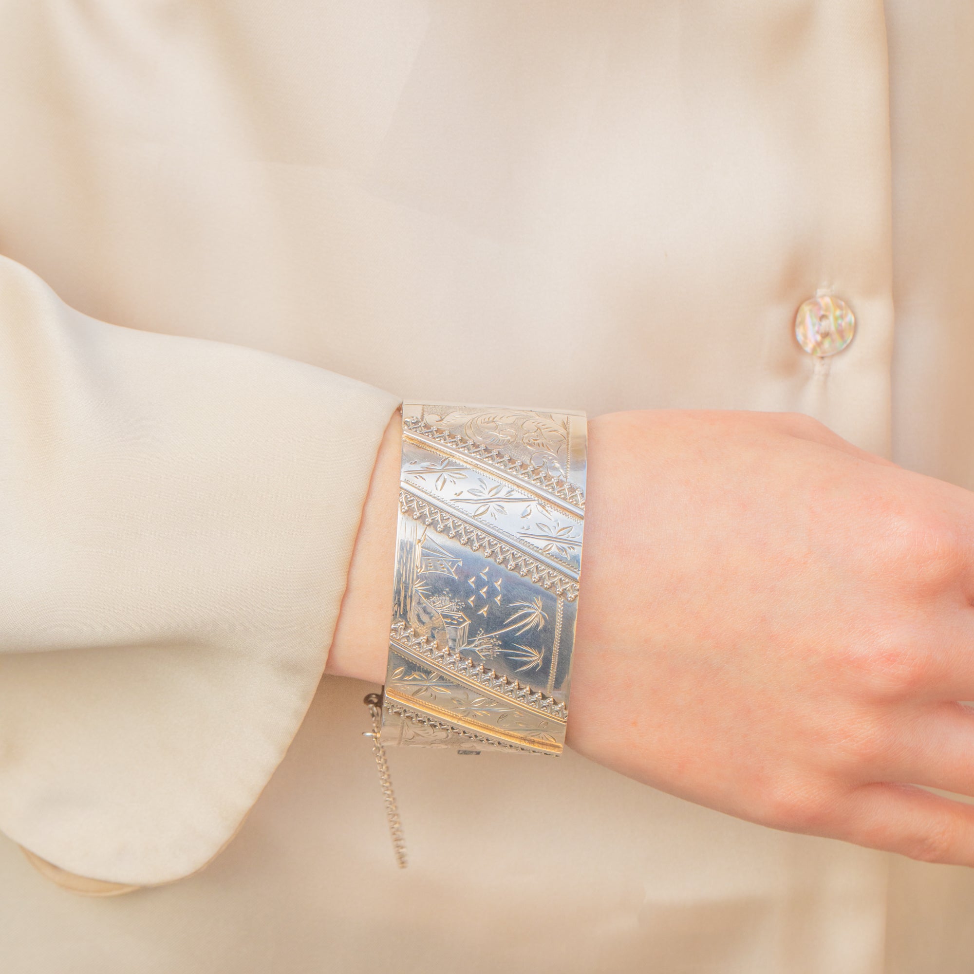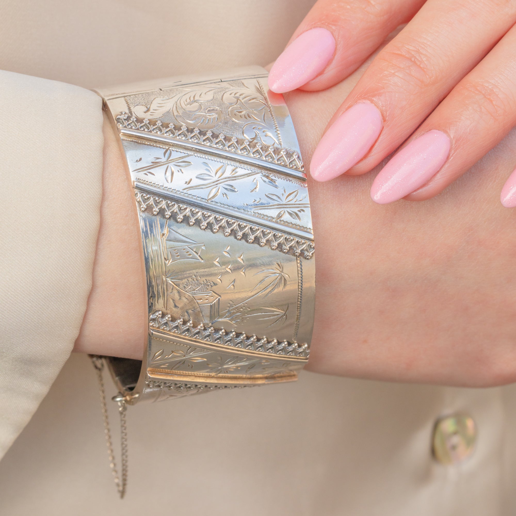 VERY GOOD: This Victorian Aesthetic Silver landscape scene cuff bangle is in very good condition. Her engravings are intricate and crisp, providing a lovely texture and depth. There are some minor signs of wear to the Silver, commensurate with age, and a light patina has accrued, enhancing the details. Complete with a safety chain, this cuff bangle can be worn with confidence!