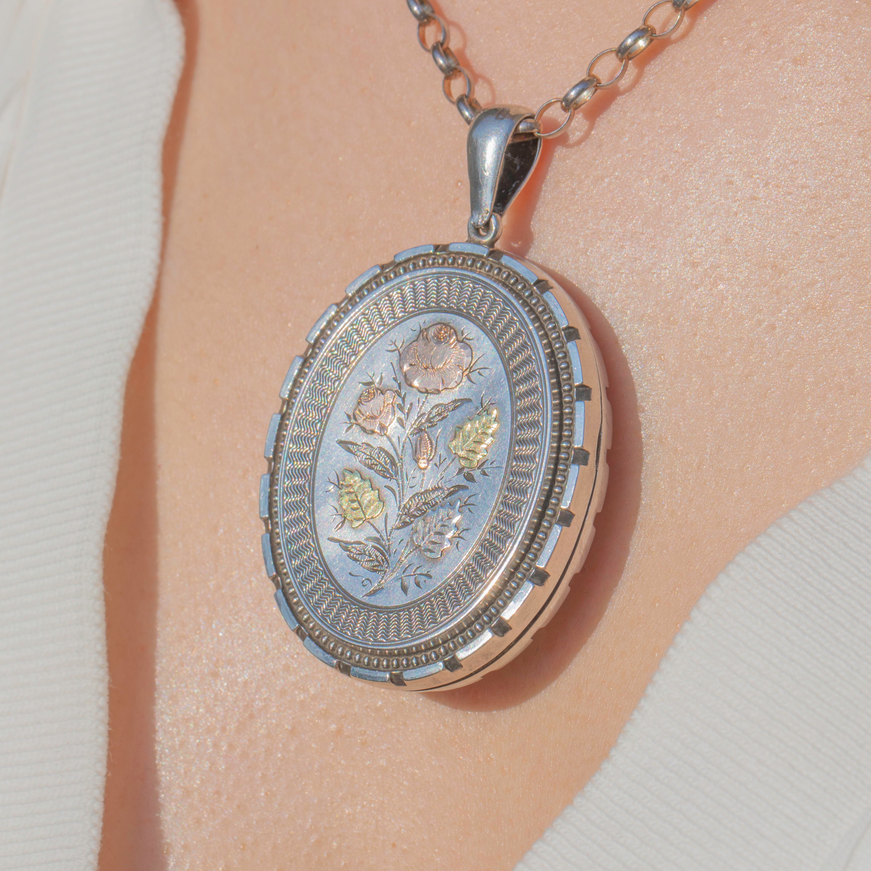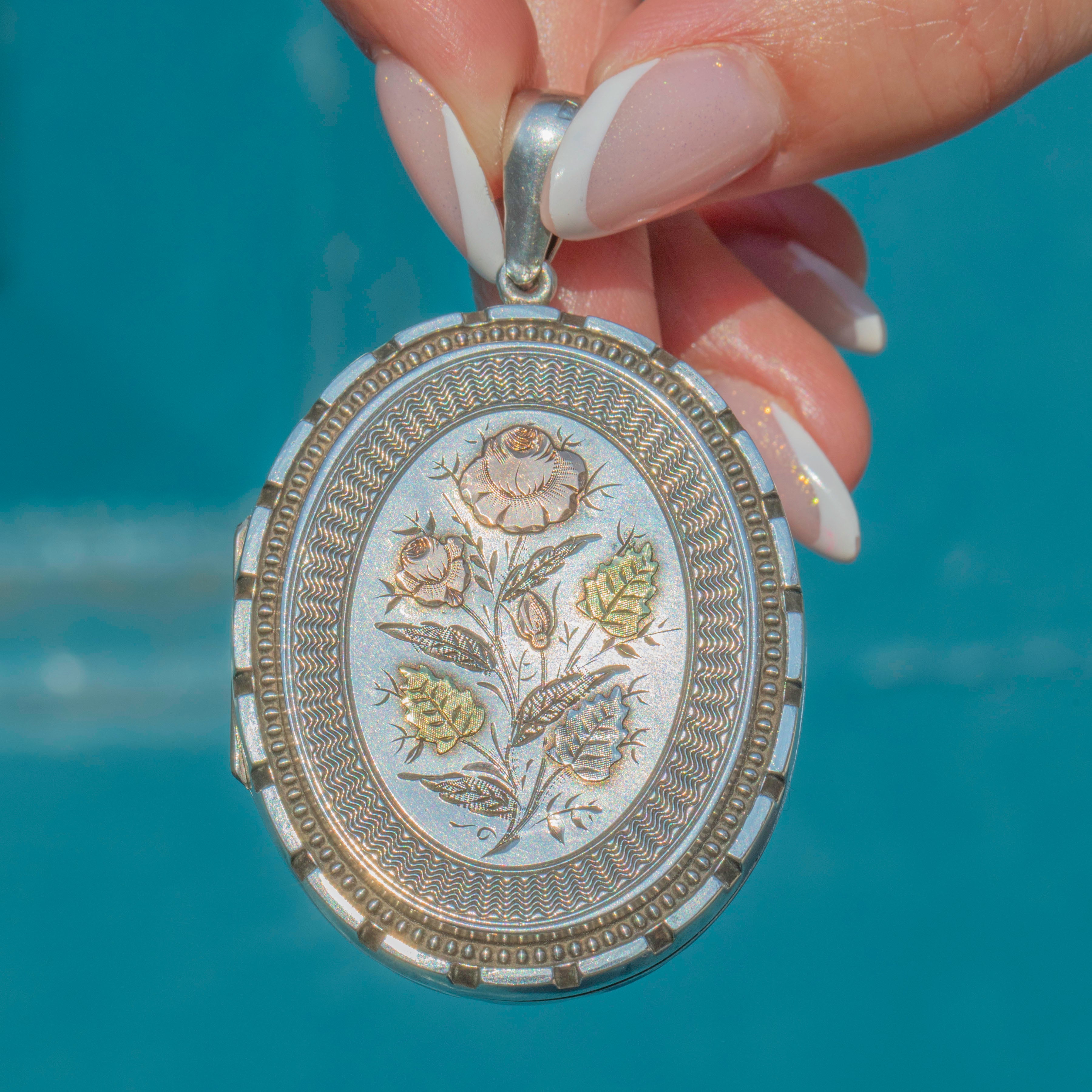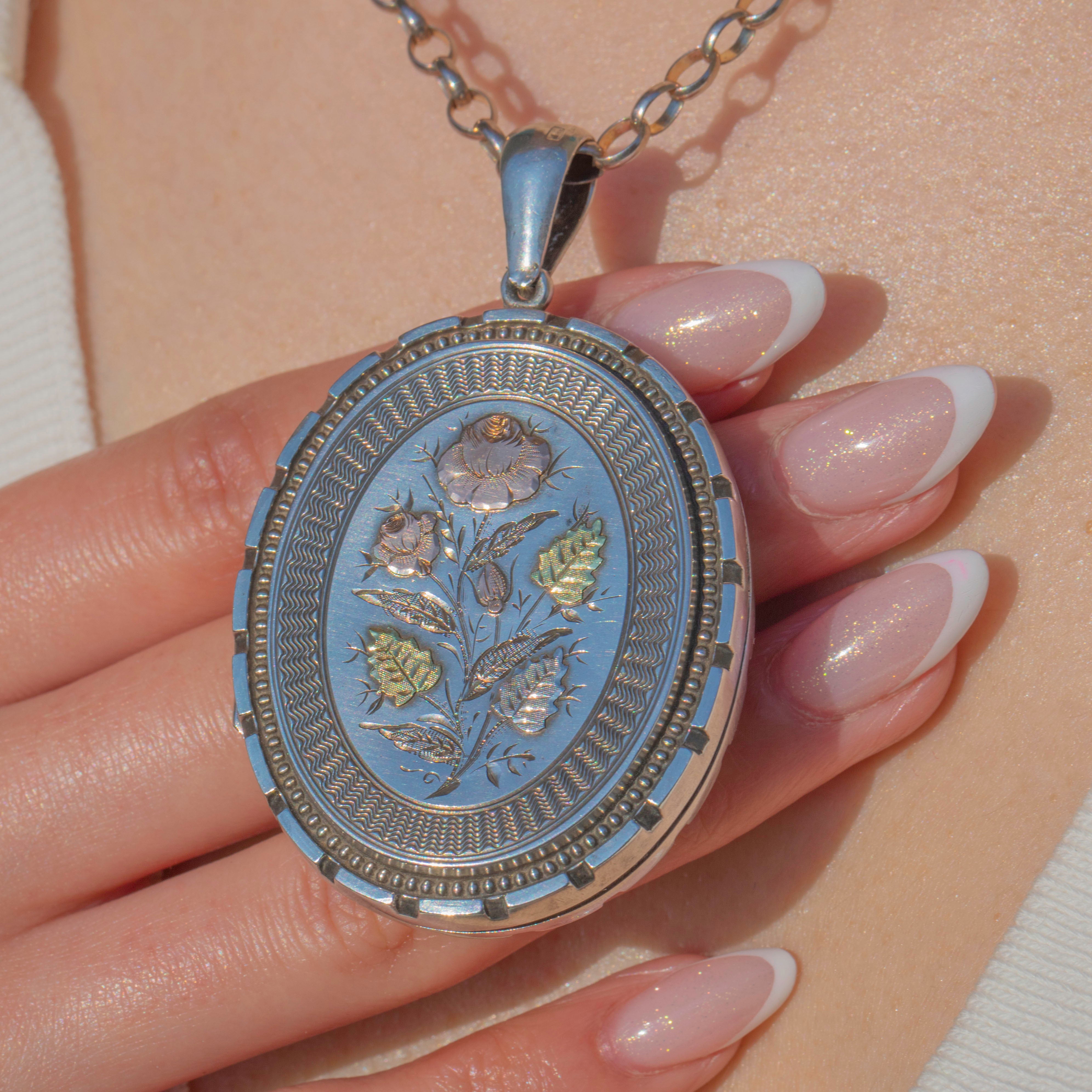 This Victorian Aesthetic Silver locket is an exquisite piece! Boasting intricate 9ct Gold flower motifs, this antique locket is meticulously crafted and perfectly captures the opulence of the Victorian era!