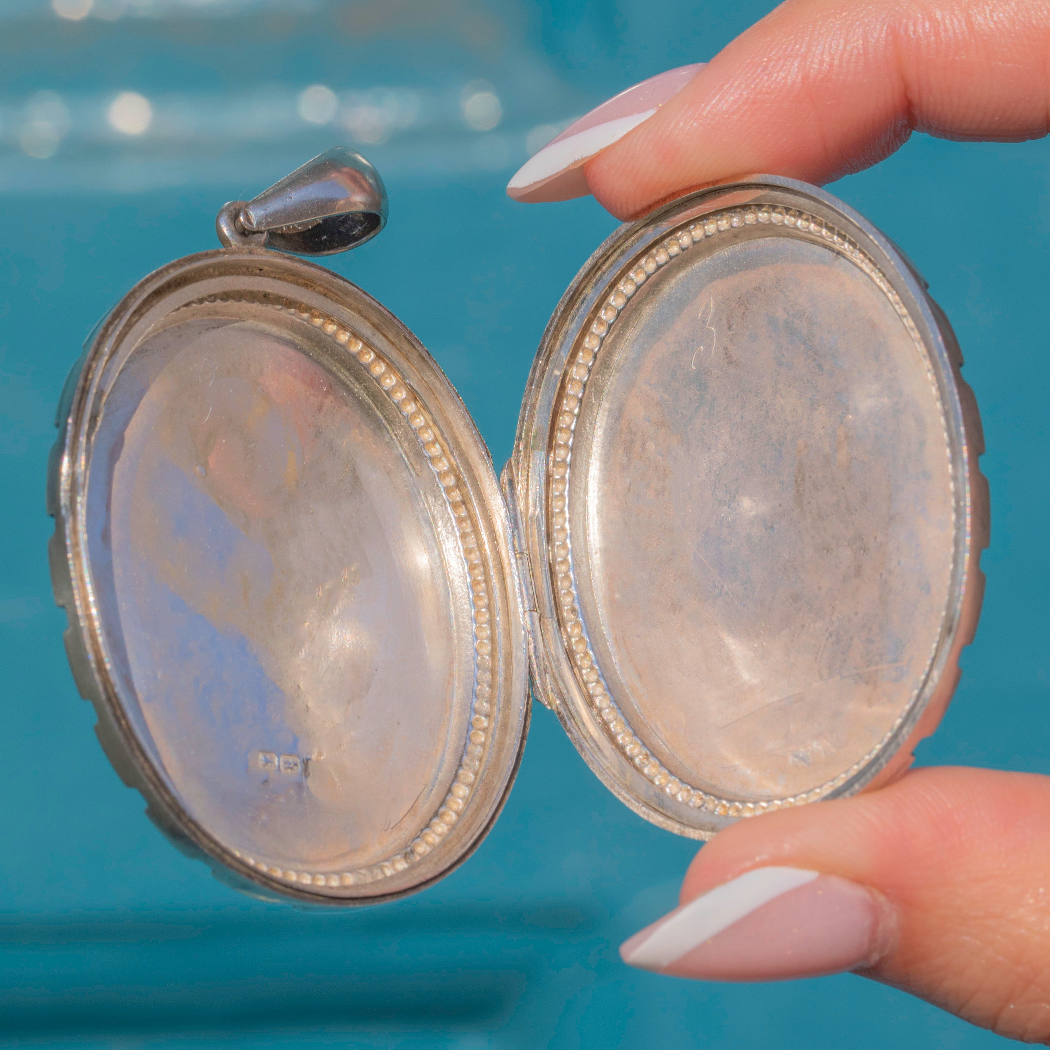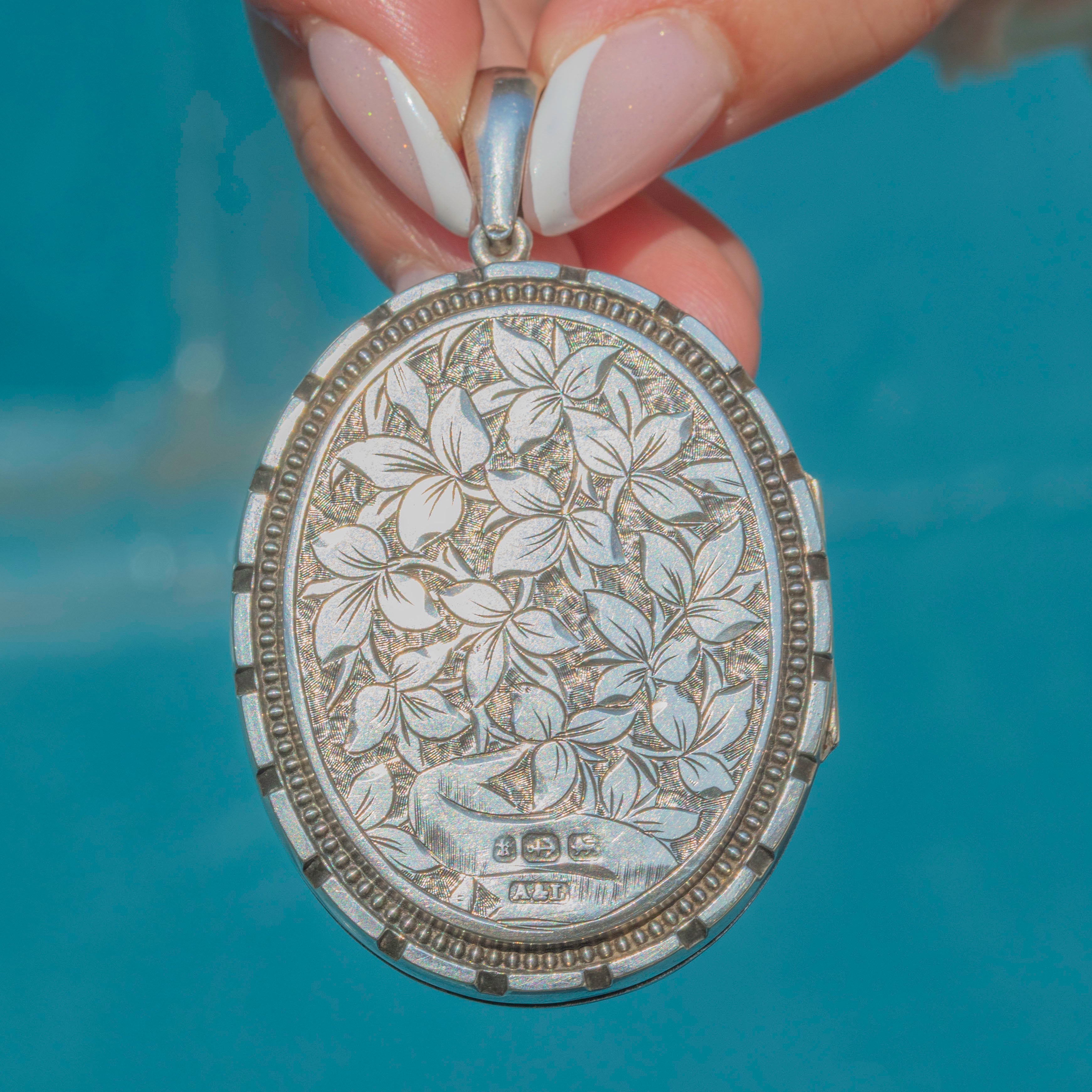 VERY GOOD-EXCELLENT: This Victorian Silver locket is offered in wonderful condition. The hinge and closure work smoothly, ensuring that your precious memories are held securely, and the locket shuts with a "click". The inside of the locket has minor wear commensurate with age and the original frames are missing, although if cut to size, your photos will remain securely inside. Complete with a large bale, you can suspend this stand-out Victorian locket from a chain with ease!