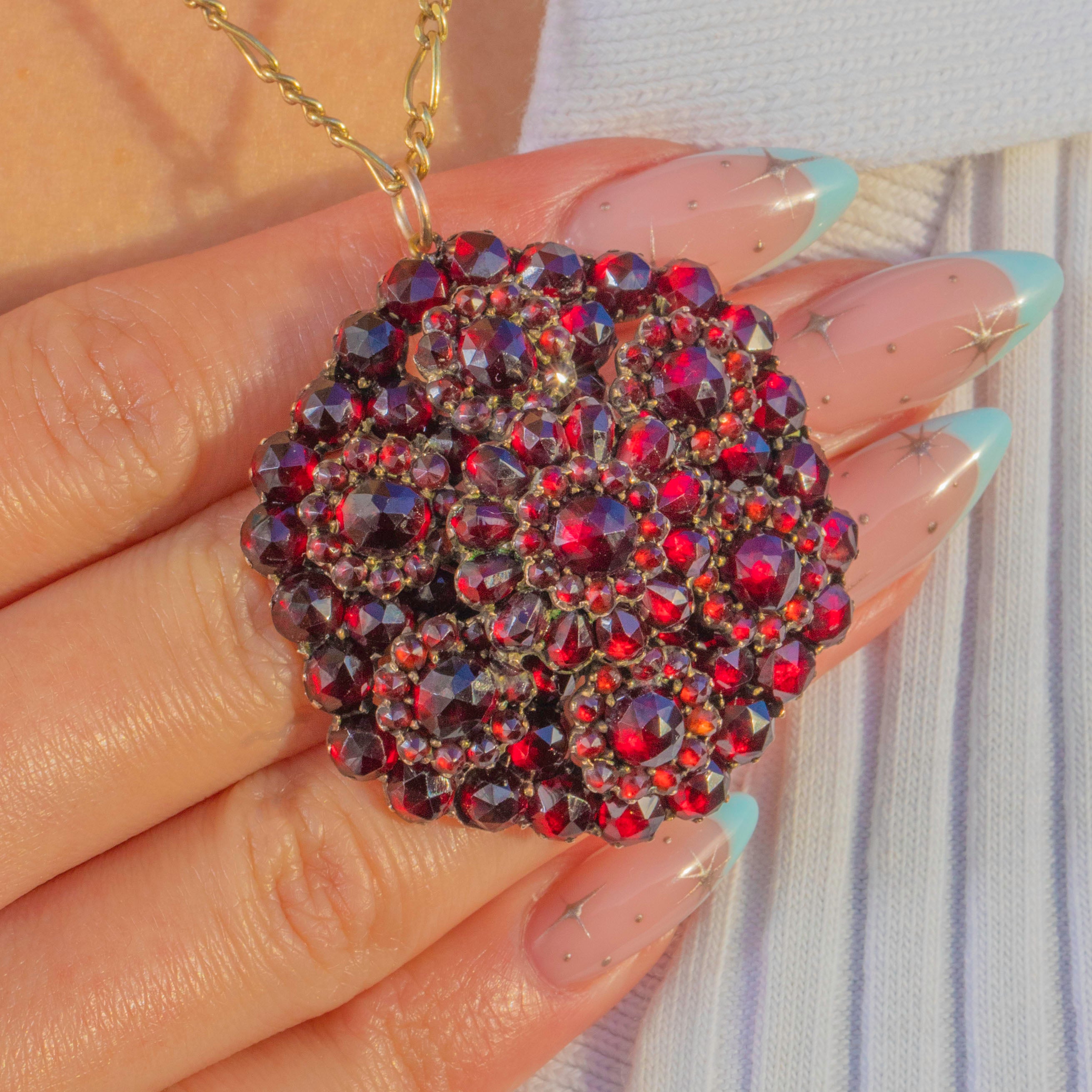 A glowing constellation of Bohemian Garnets, this Victorian flower pendant blooms with deep claret tones. Petite rose-cut Garnets are pavé-set in tight concentric rosettes across a gently domed surface, finished with a scalloped edge and radiant starburst sparkle. The 6ct Gold mount shows a mellow antique patina, its recesses lending depth that enhances the richness of the stones.