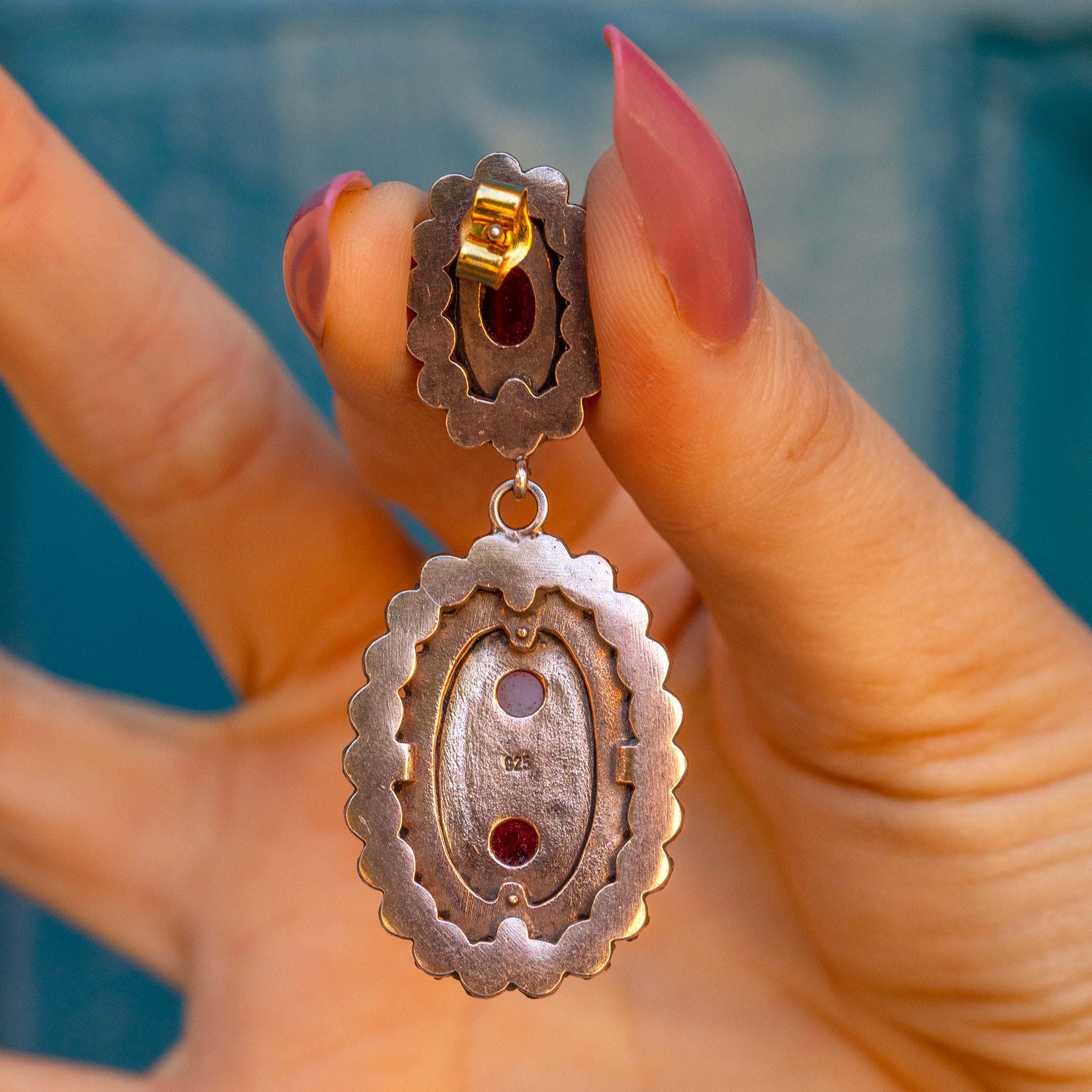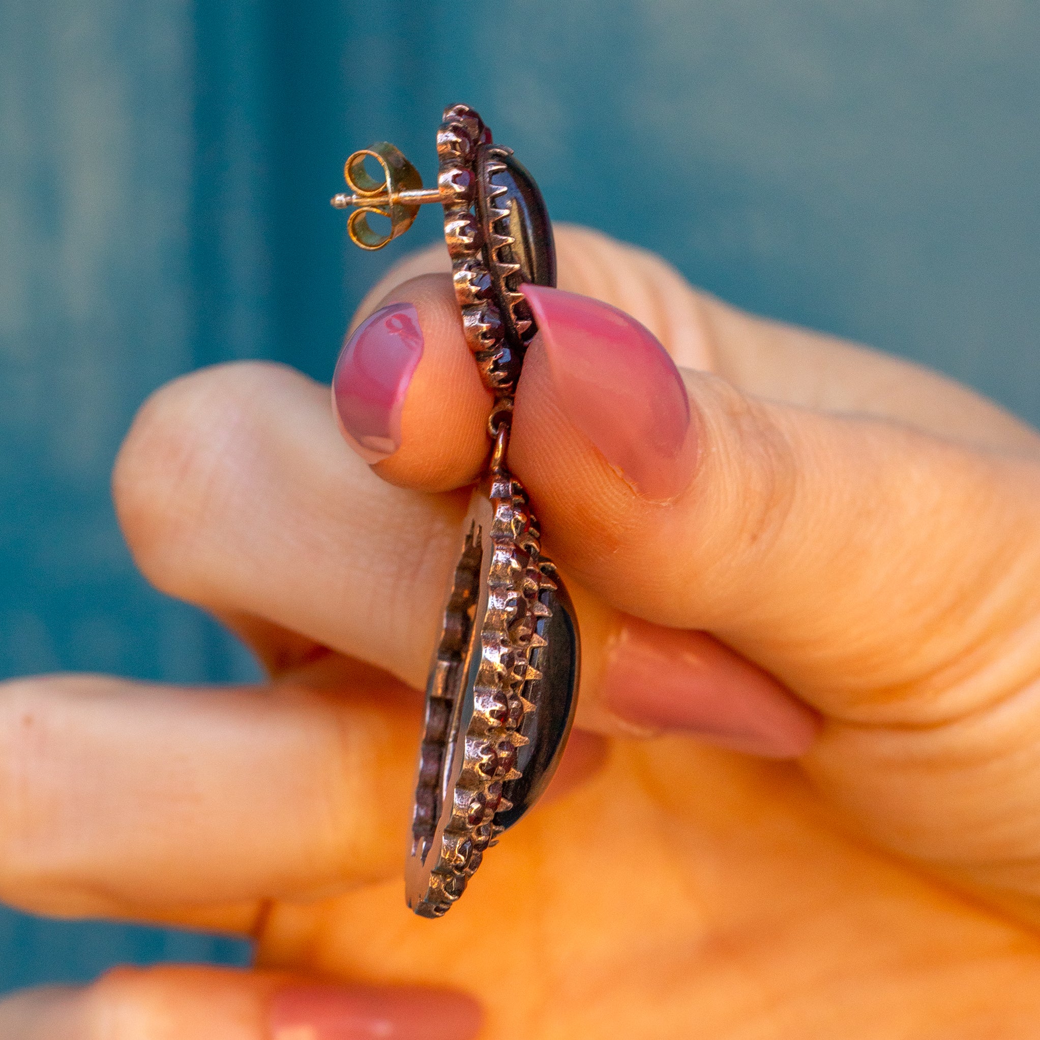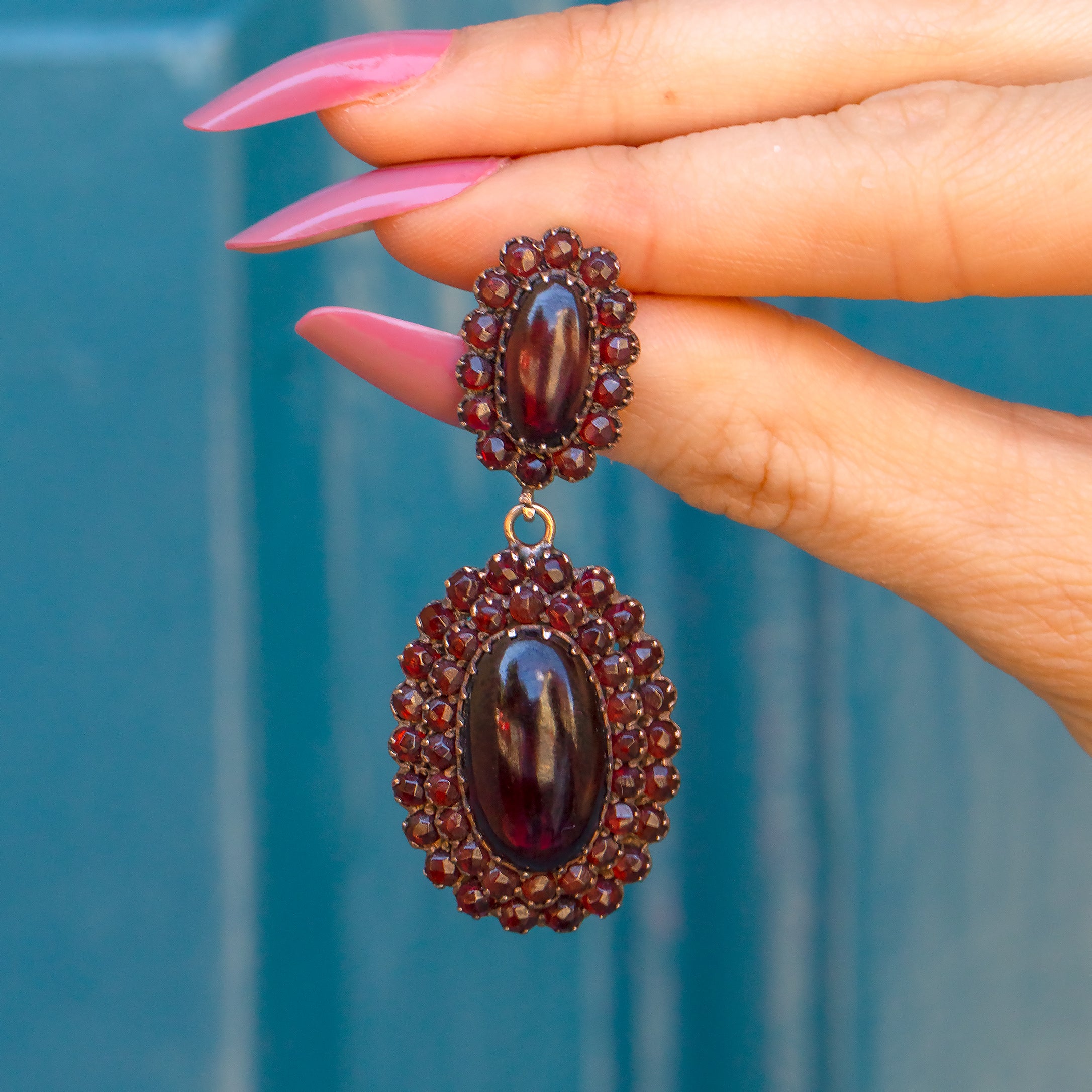 These Victorian Bohemian Garnet drop earrings ooze gothic glamour! Originating from Bohemia, the Garnets set within these Victorian earrings are renowned for their deep red hue, with their rose-cuts providing sparkle in abundance.