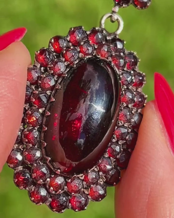 At an impressive size, these Garnet cluster earrings thrive beneath the light and will bring a splash of seduction to any formal attire. Bursting with antique history and charm, they will make a welcomed addition to any antique jewellery collection.
