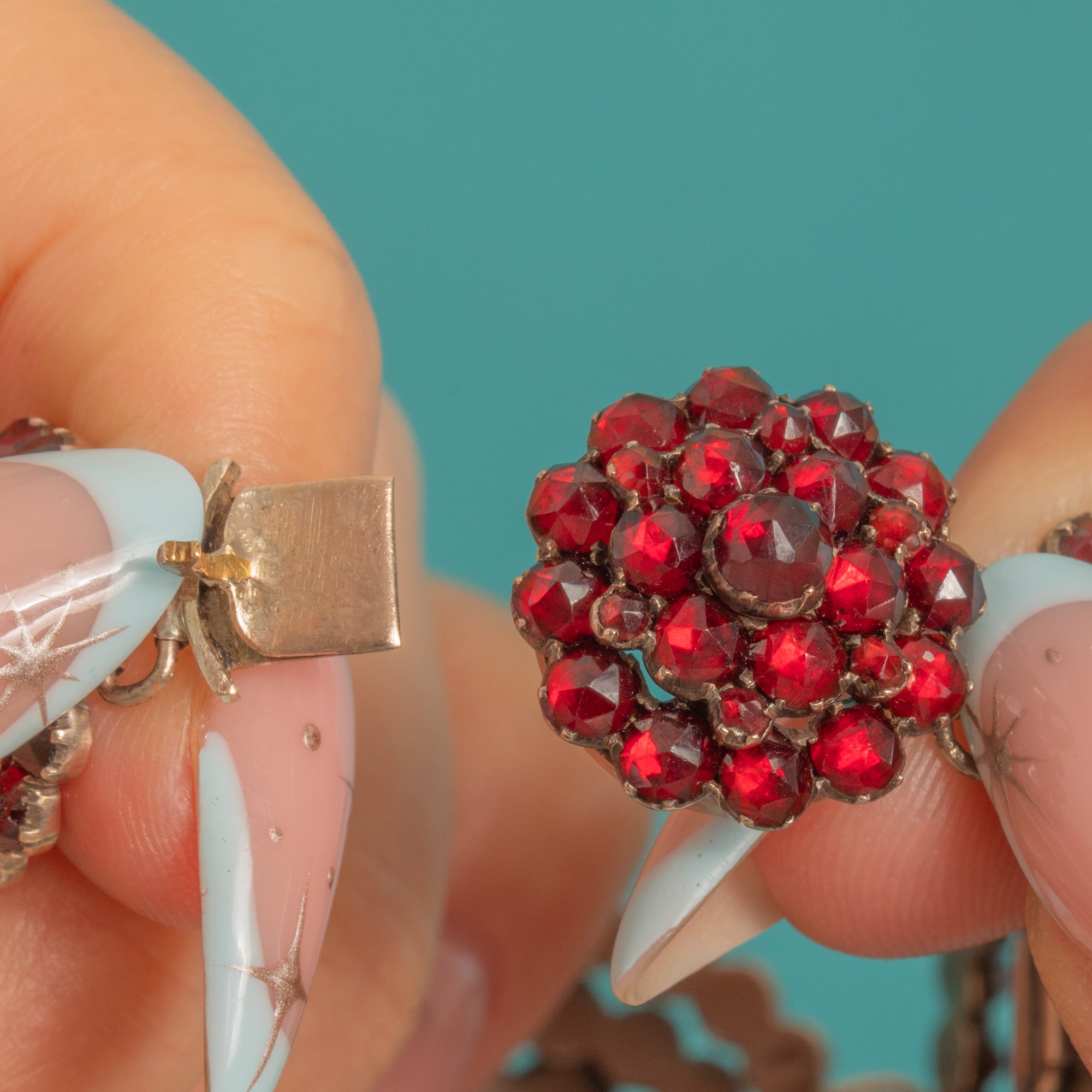 A sumptuous Victorian Bohemian rose-cut Garnet bracelet composed of graduated, domed rosette panels, each packed with glowing Garnets arranged in concentric halos. The rich crimson sparkle dances across the wrist, enhanced by closed-back cluster settings and the warm hue of Garnet Gold. Articulated links lend graceful movement and comfort, while an integrated rosette box clasp with a neat side safety keeps everything secure.