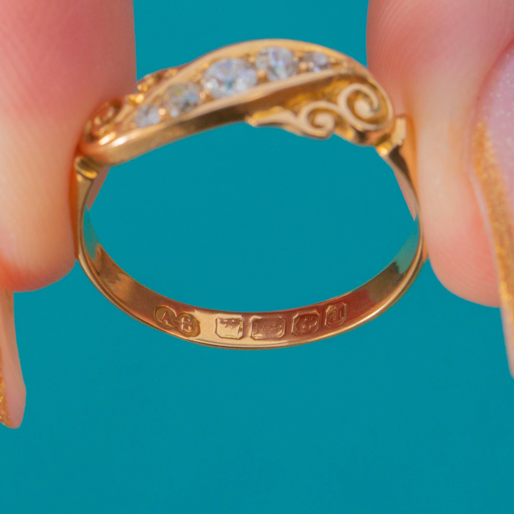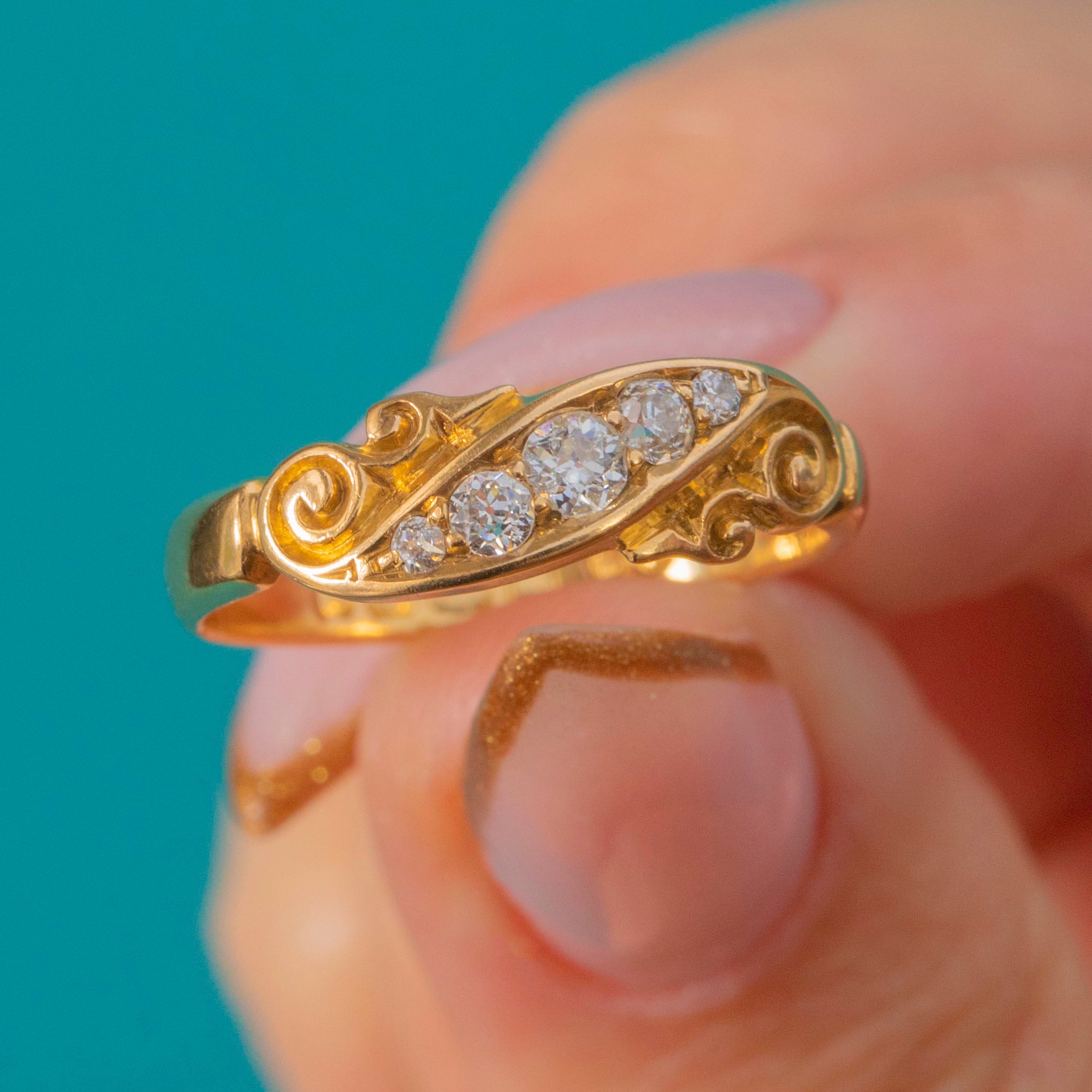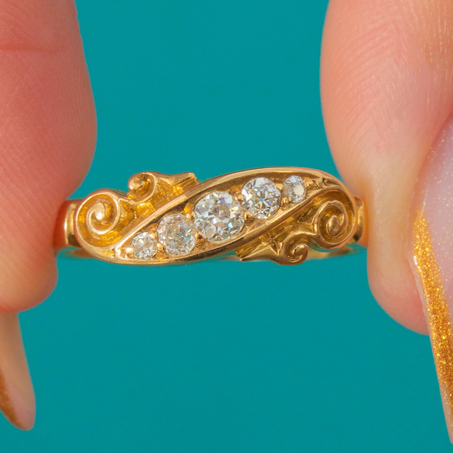 A wonderful example of a late Victorian carved half-hoop ring, this 18ct Gold design glitters with five bright antique Diamonds in a beautifully scrolled setting. Each Diamond has been carefully hand-cut and claw-set into a softly curved Gold gallery, with elegant carved shoulders that frame the stones perfectly.