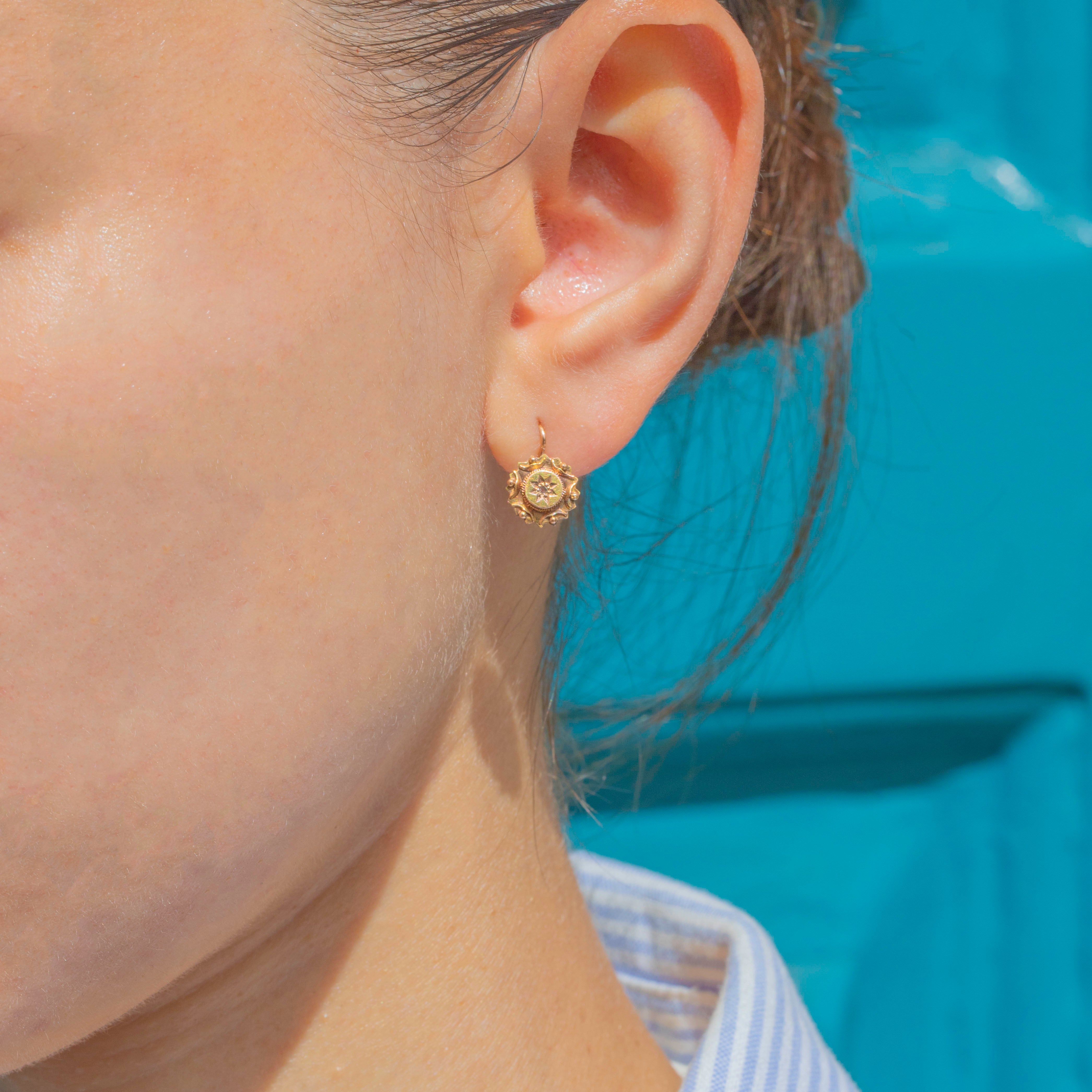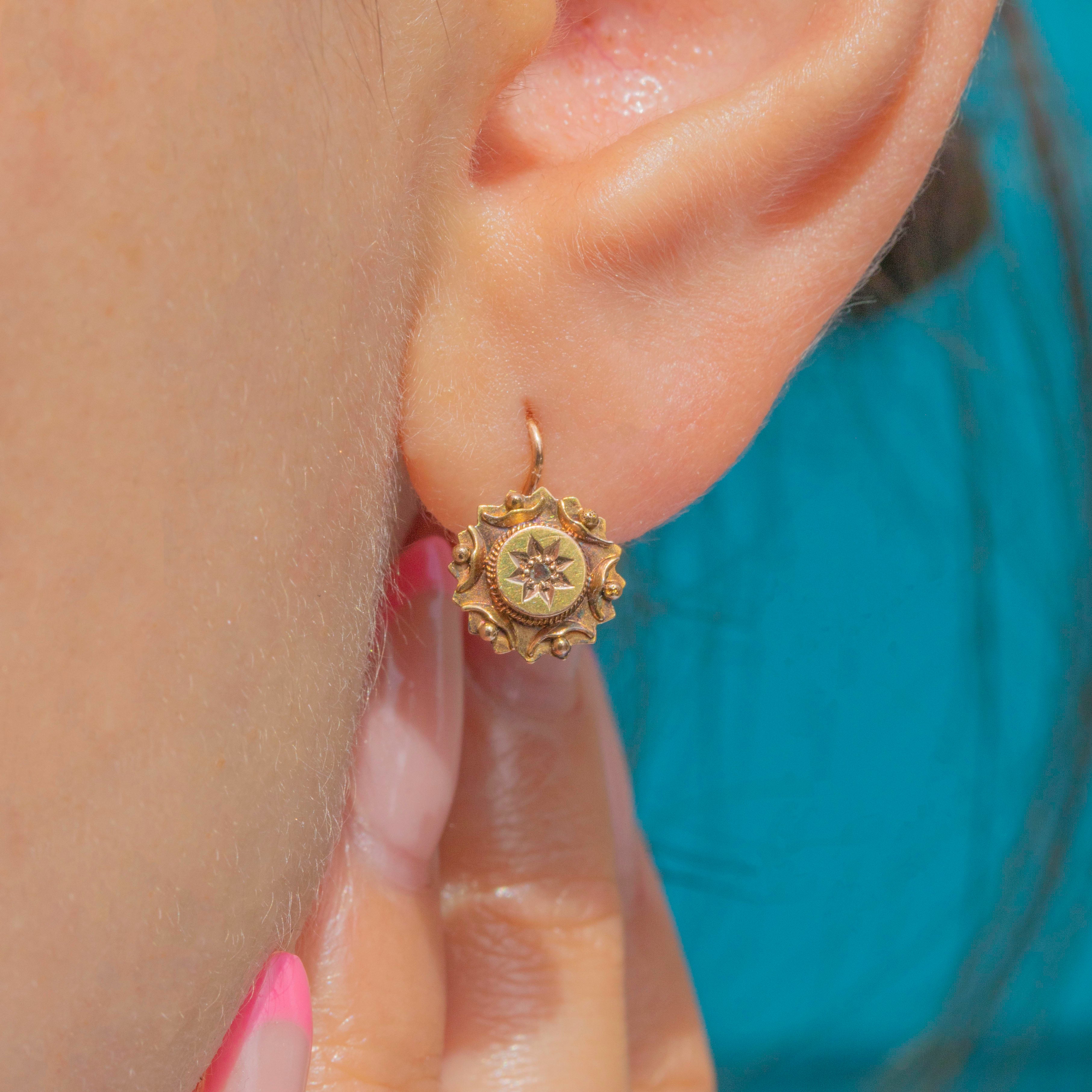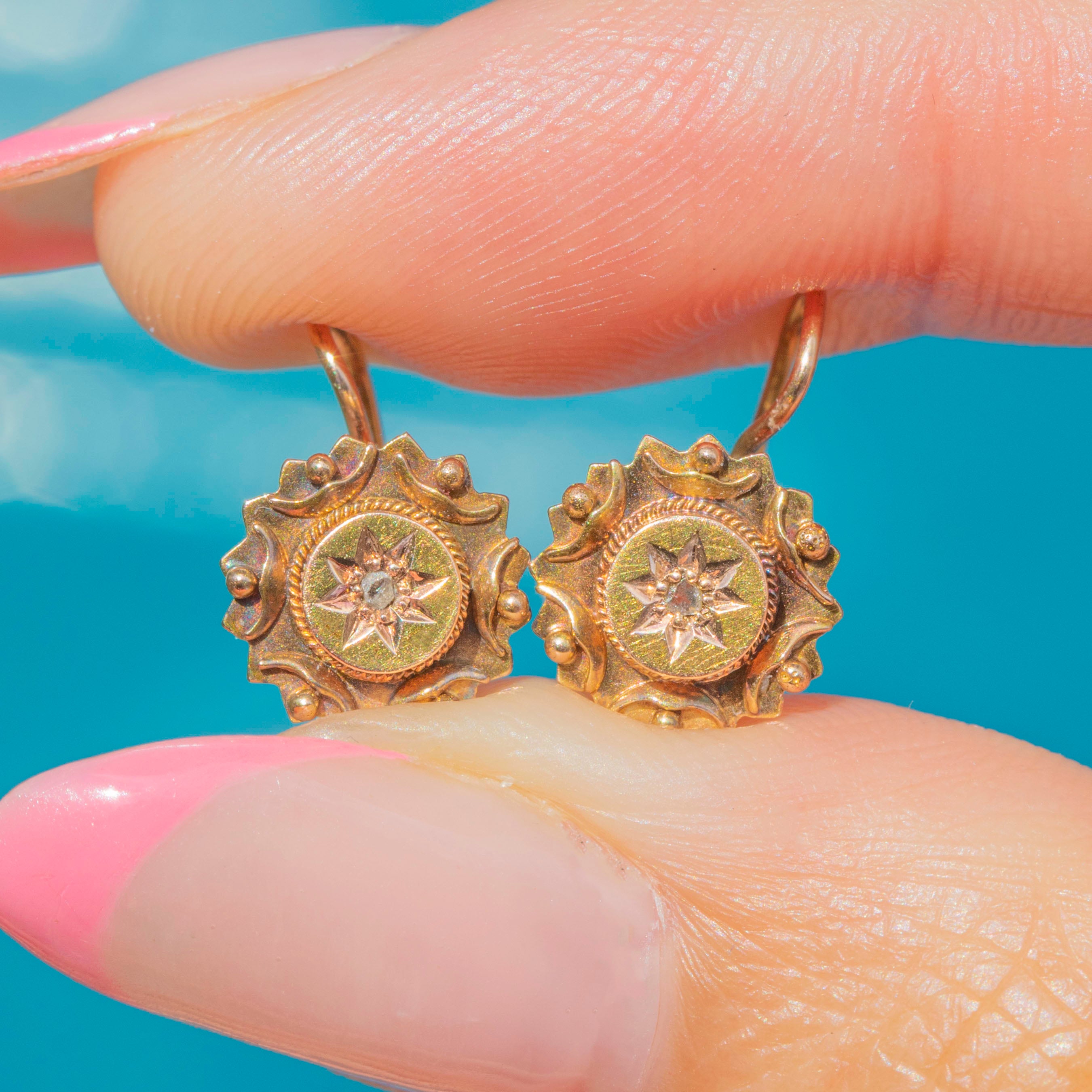 These Victorian Etruscan revival 15ct Gold Diamond earrings radiate celestial allure!