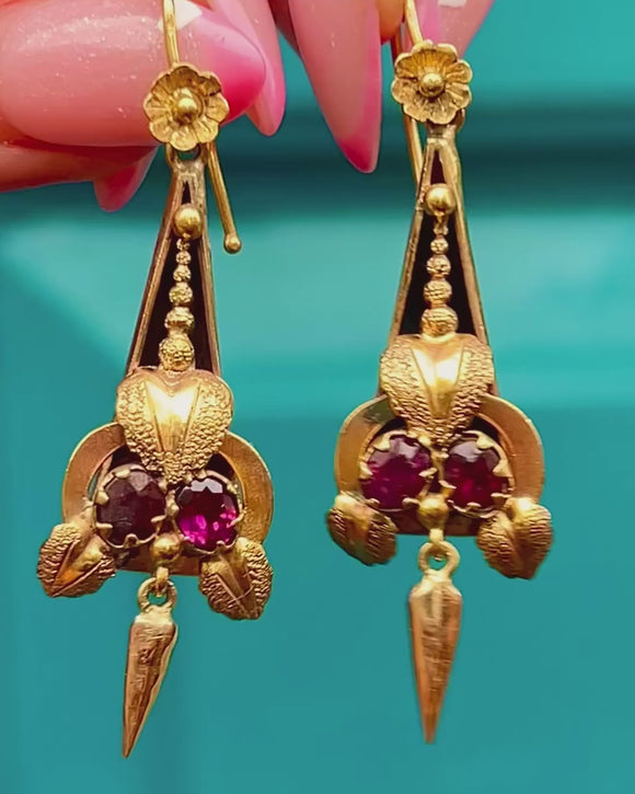 Victorian Etruscan Revival 15ct Gold Garnet Drop Earrings, c.1870–1885