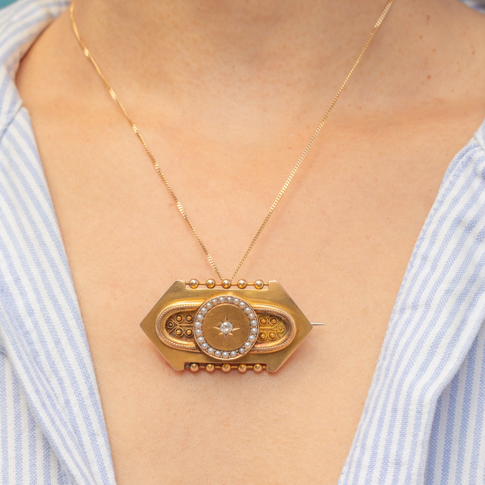 This brightly saturated 18ct Gold brooch is a fine example of Etruscan revival jewellery! The brooch's striking geometric form is inlaid with a glimmering 0.10ct Diamond centre, displayed within a distinct star setting, and is encircled by lusturous Seed Pearls.