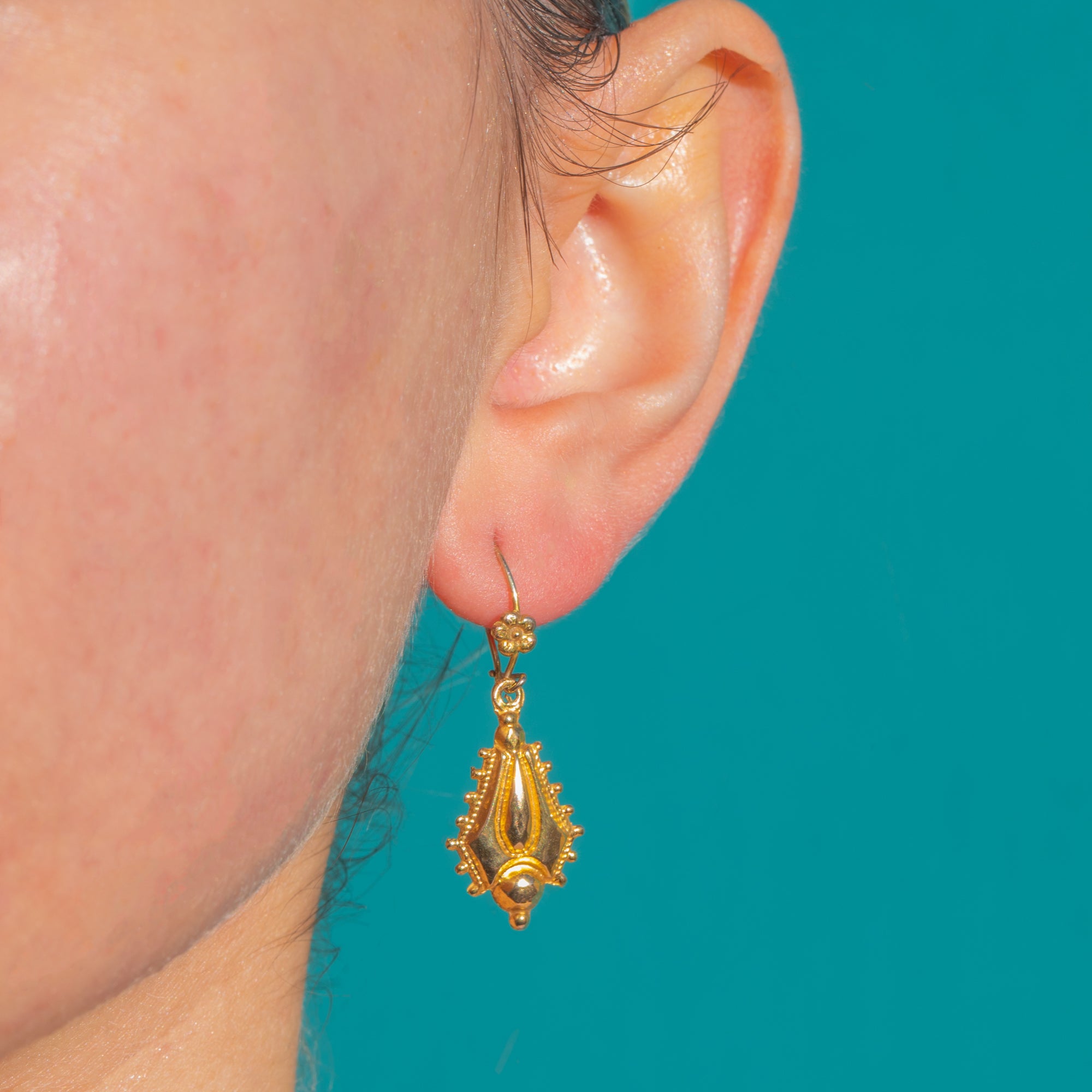Quintessential Victorian Etruscan Revival elegance in 9ct Gold, these articulated drops pair floral rosette surmounts with sculptural navette-shaped shields richly embellished with granulation-style beading and fine wirework. A charming domed knop finial completes the silhouette, while the relief and detailing catch the light beautifully with every movement.