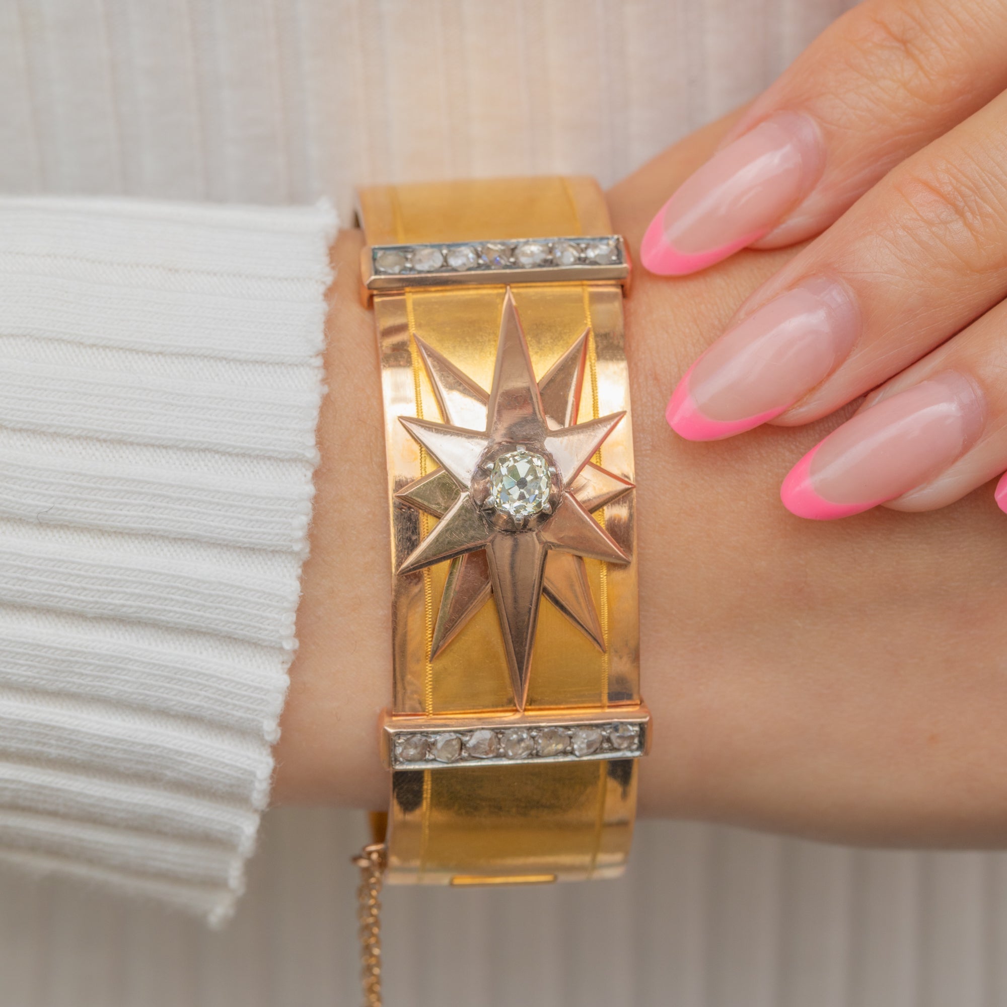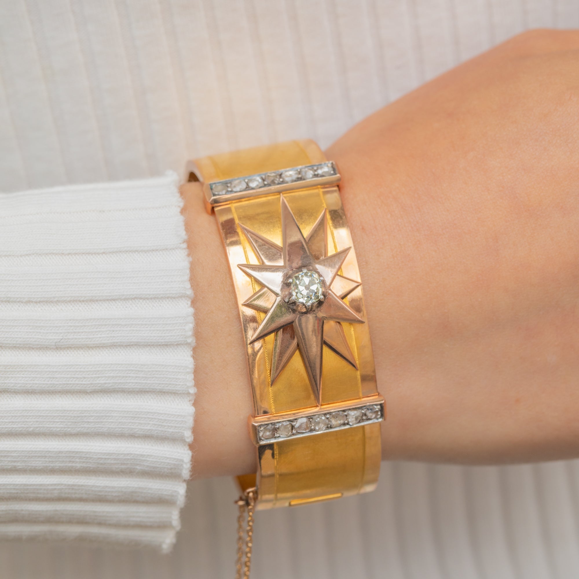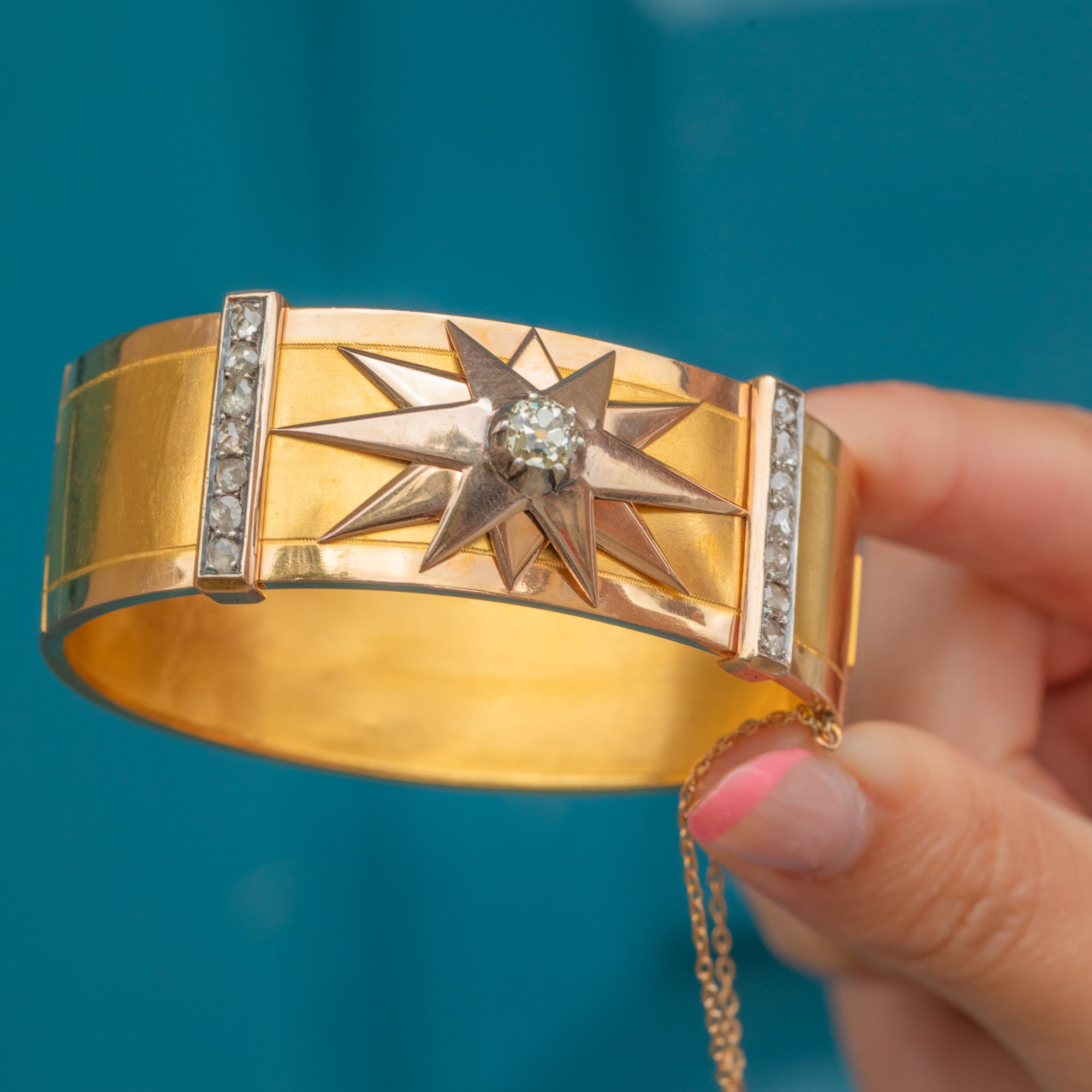 VERY GOOD. An excellent Victorian French 18ct Gold old-cut Diamond star cuff bangle is in excellent condition! The Gold has a rich saturation throughout and has held its form well, it remains a robust piece that can be worn regularly with confidence. There is some surface wear on the back of the bangle, with some very light imperfections / surface scratches to note, but this isn't immediately noticeable and does not distract from the overall impact of the piece.