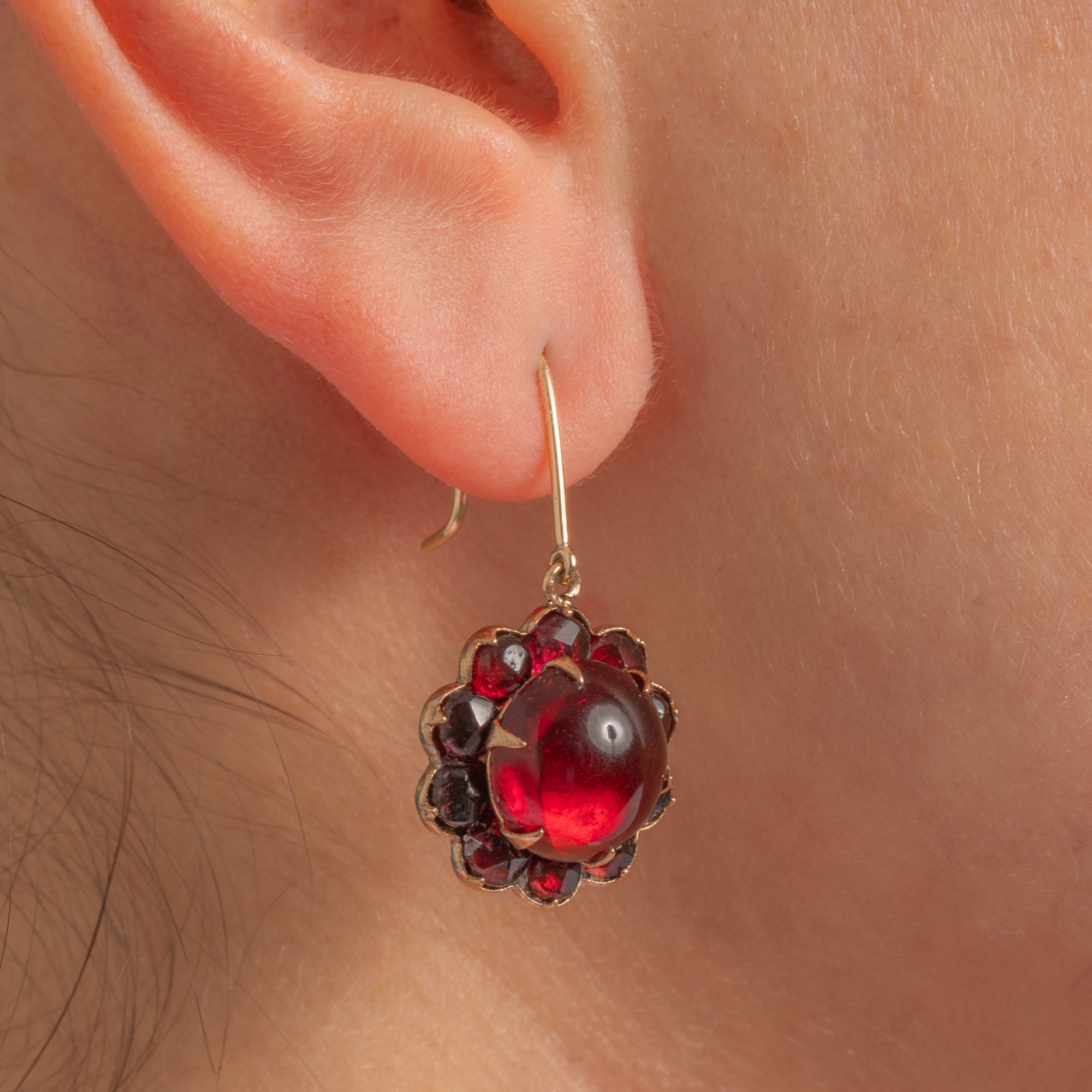 Deliciously romantic and richly hued, these Victorian rosette earrings centre on high-domed Garnet glass cabochons, each encircled by a halo of matching faceted stones in scalloped settings. The warm gold-tone settings amplify the deep wine-red glow, while the compact floral silhouette brings a timeless, antique elegance.