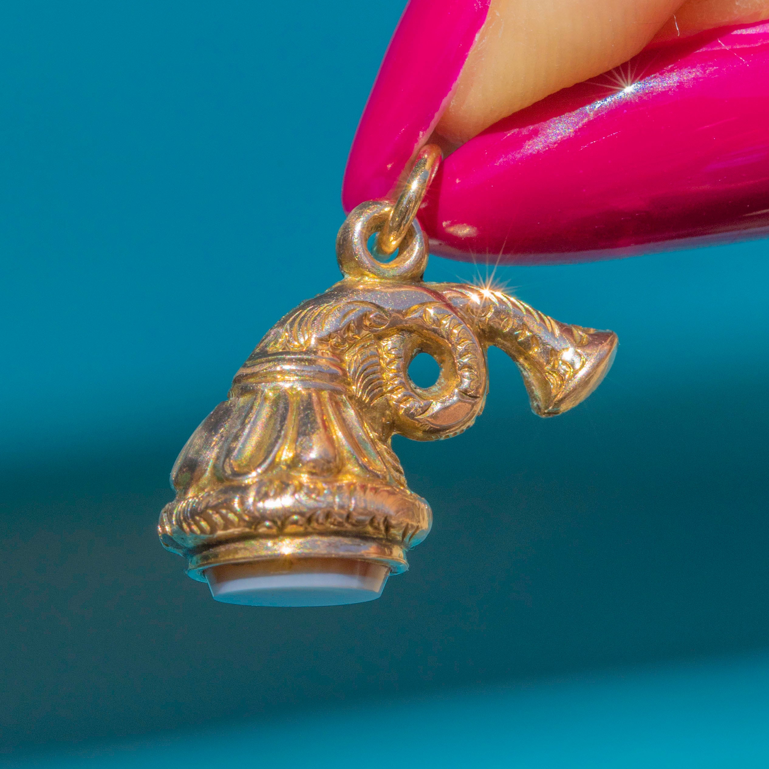 This ornately formed antique cornucopia charm boasts a glossy 9ct Gold exterior with finely engraved details covering its entirety, and displays a smooth slab of Sardonyx at its base.