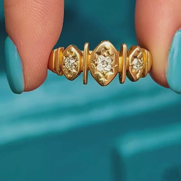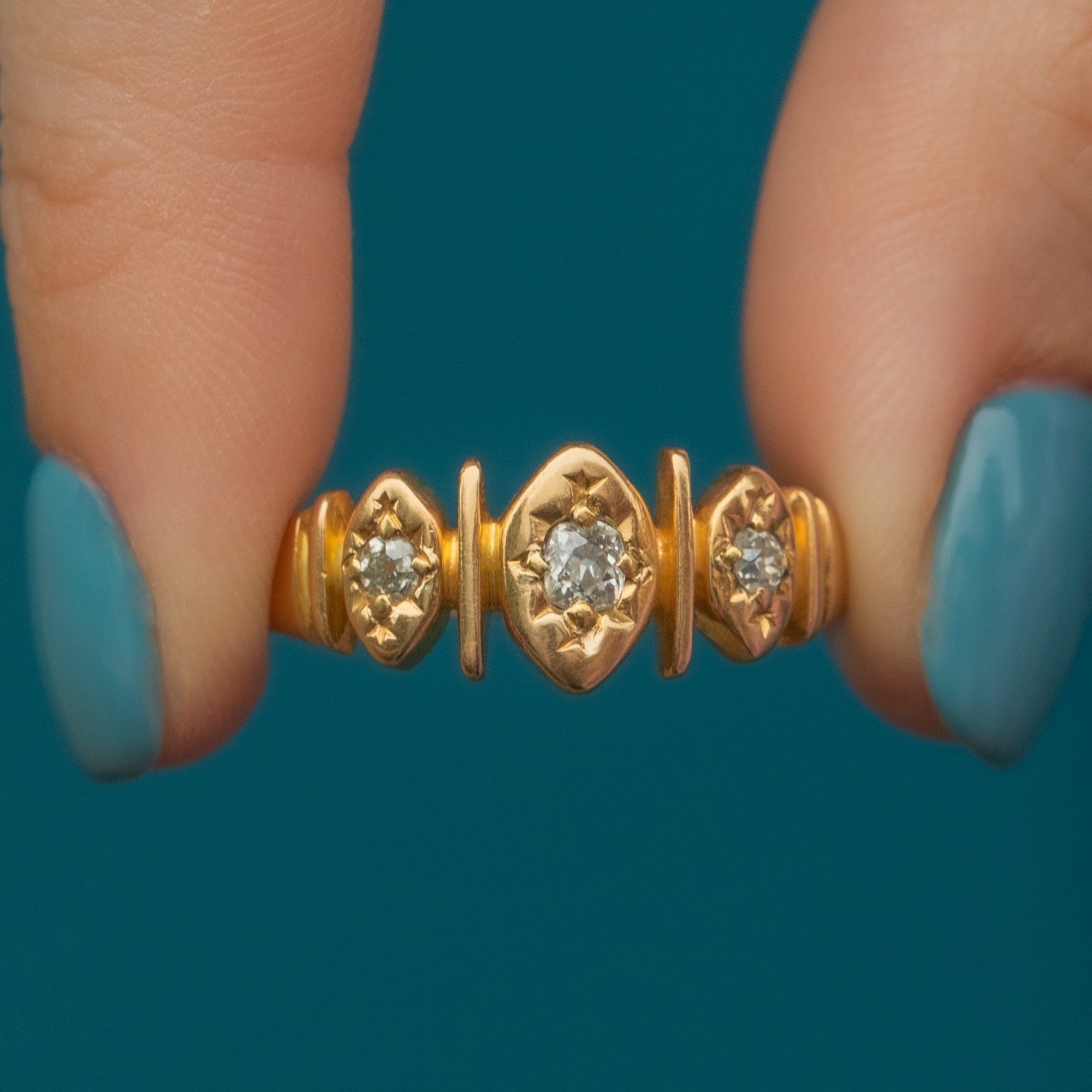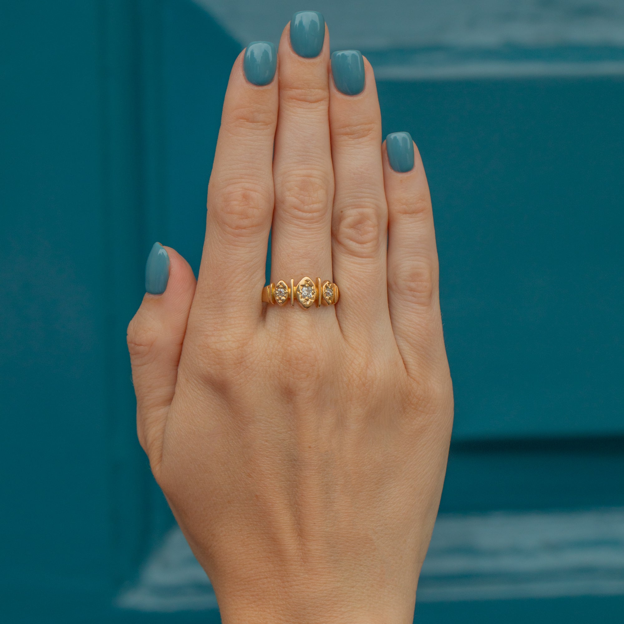 With her face sculpted of three soft Diamond shapes, spaced between three Gold bars, this Victorian Gold ring is perfect for those who love unique pieces of antique jewellery. With a low profile she is easily stackable amongst your other rings, however, wear alone to let her sheer beauty shine, uninterrupted.