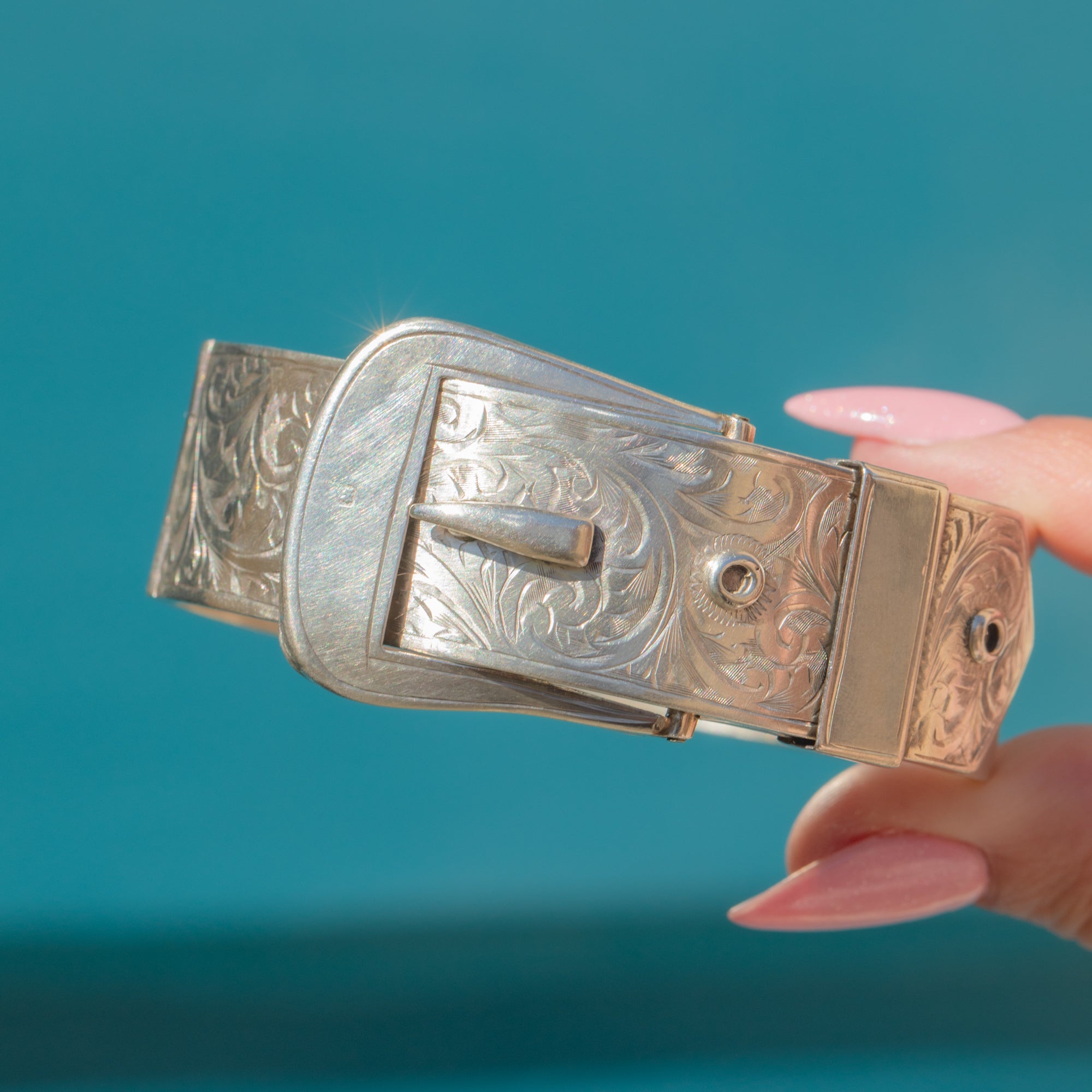 Stand out from the crowd with this Victorian Revival Silver engraved buckle bangle! Crafted from over 26 grams of solid Sterling Silver, this mid-century bangle provides exceptional wrist coverage and is the perfect statement piece.