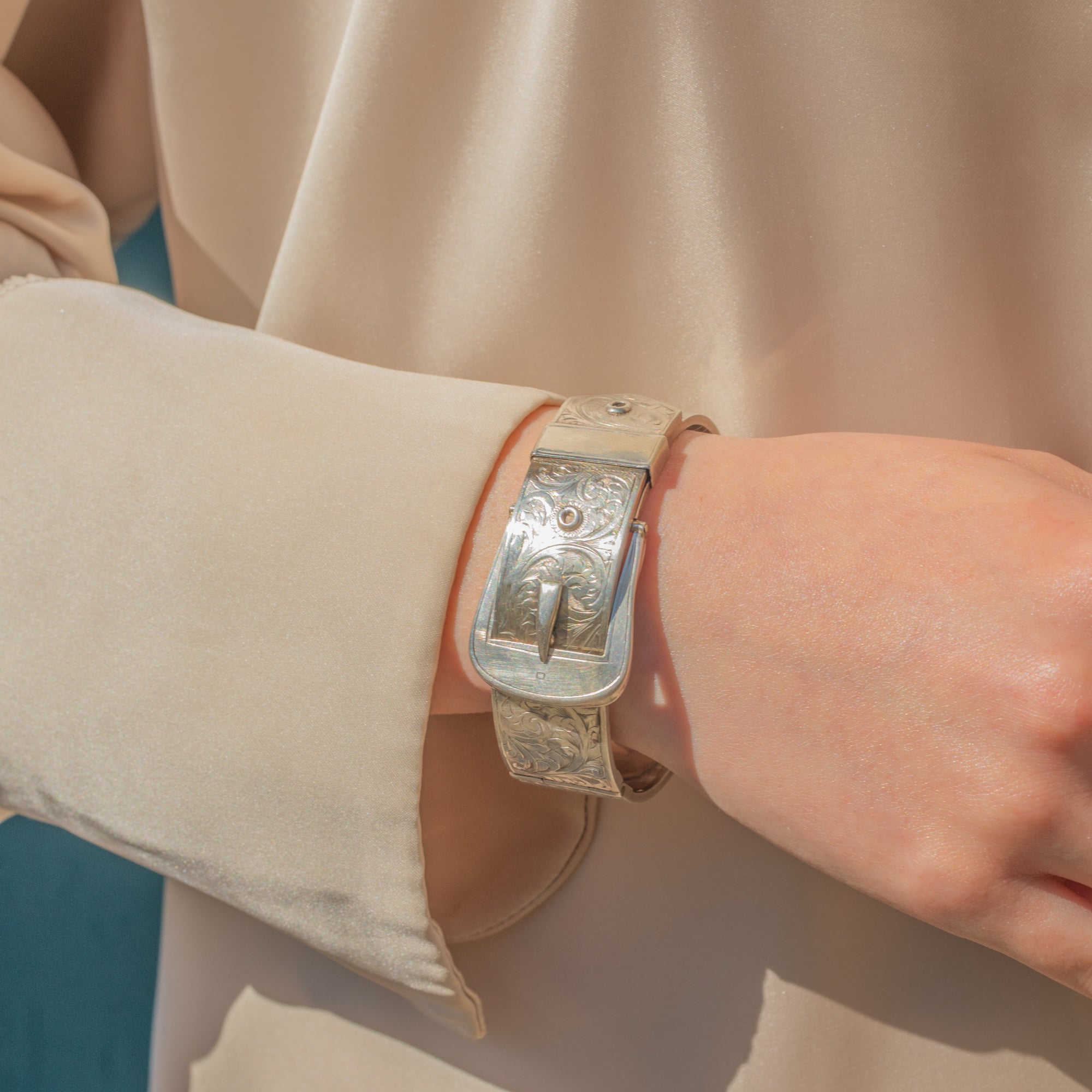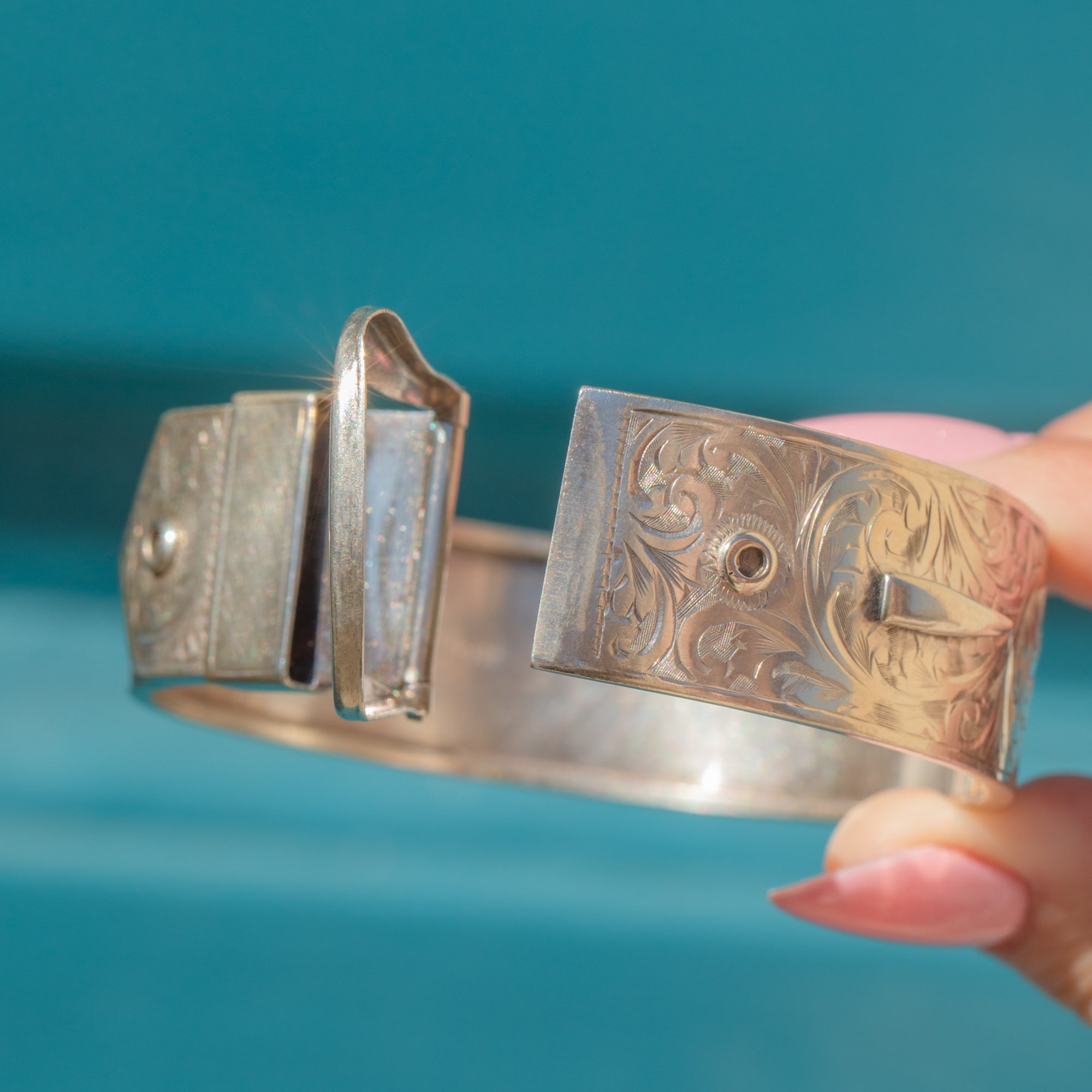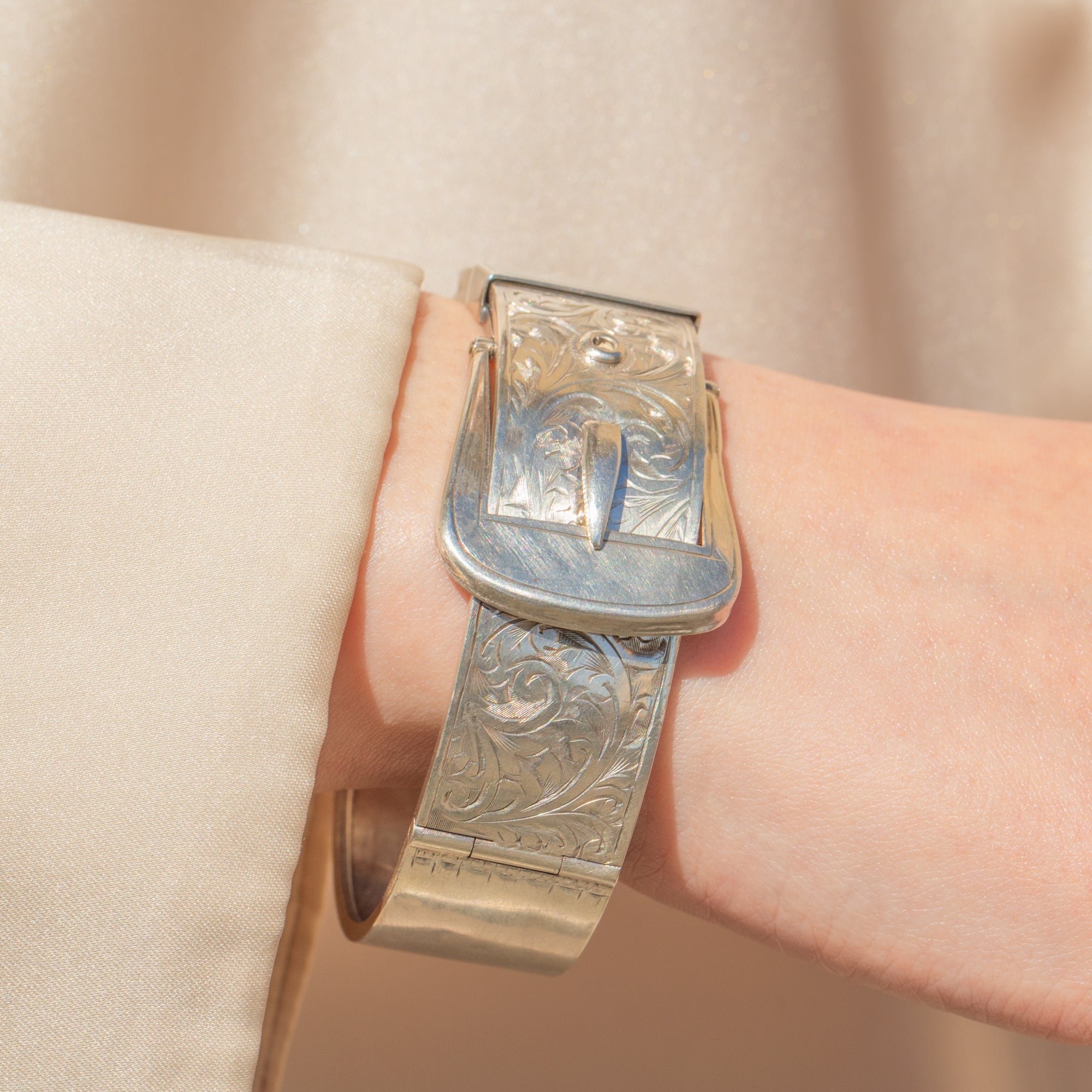 VERY GOOD-EXCELLENT: This Victorian Revival Silver engraved buckle bangle is in superb condition. The Silver is bright and lustrous, with each detail remaining defined. There is some general age-related surface wear, including some mild dings and scratches, which are only noticeable under close inspection. The bangle opens easily and closes securely, allowing you to wear this statement bangle with absolute confidence!