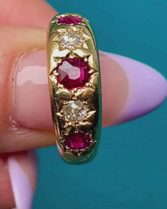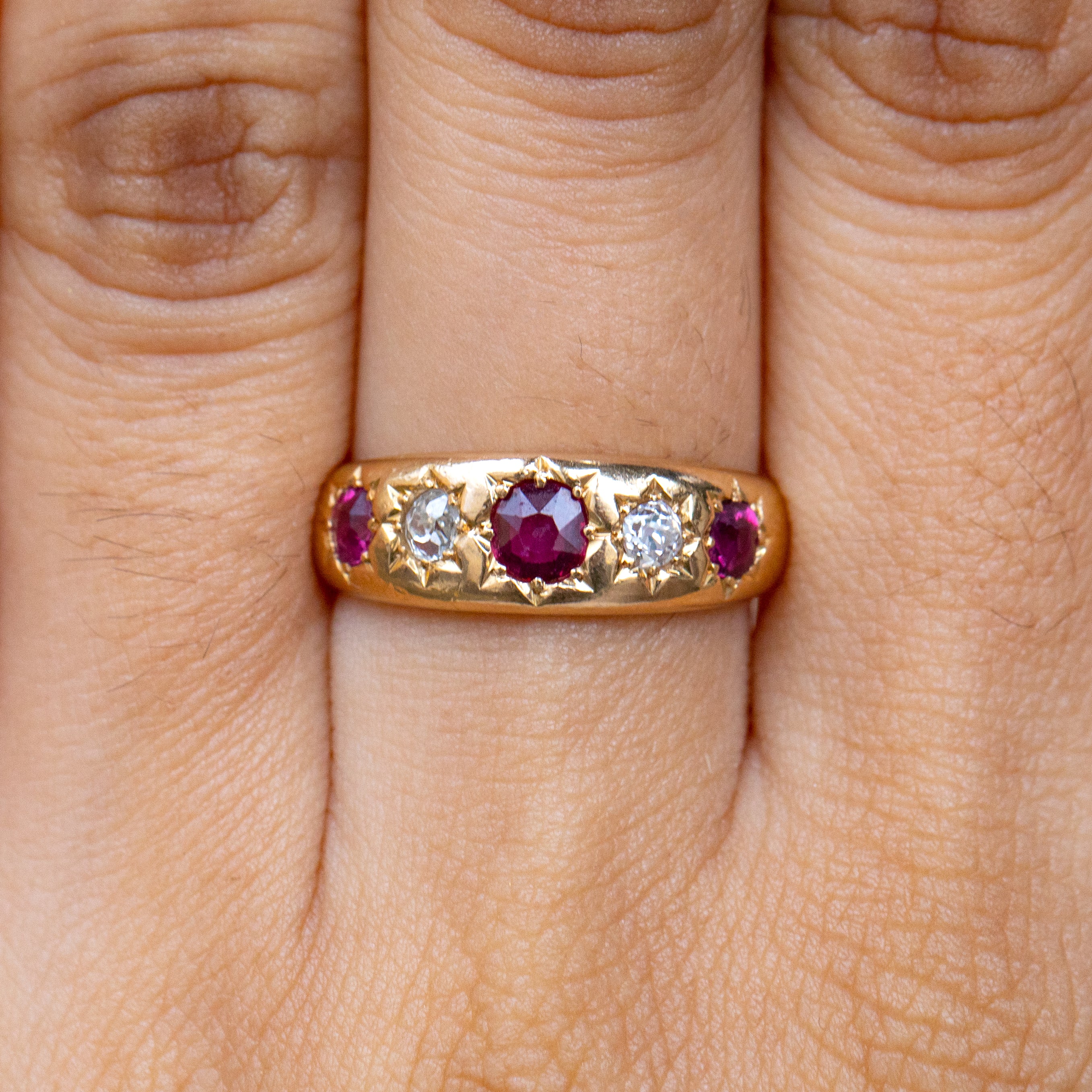 EXCELLENT: This Victorian 18ct Gold Ruby Diamond five stone Gypsy ring is offered in excellent condition. The Gold has a delicious buttery shine with only some minor wear on the inside of the band. The gemstones are secure in their settings, and the hallmarks are crisp! With proper care and maintenance, this antique gypsy ring will be cherished for generations to come.